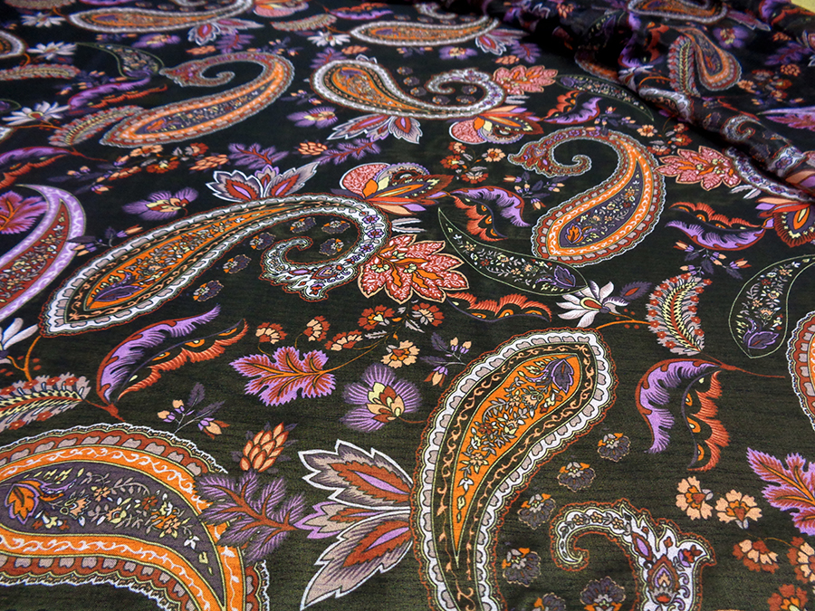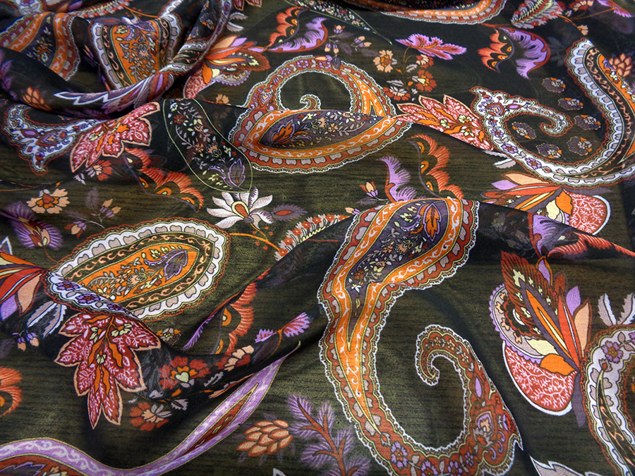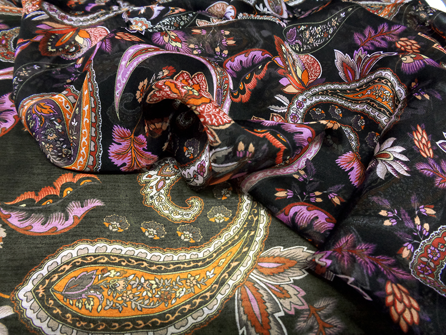 PREGIATO CHIFFON CON FINITURA CHARMEAUSE (LEGGERMENTE LUMINOSO) VELATO, LEGGERO E MORBIDISSIMO, FONDO NERO CON DISEGNI CASHMERE SUI TONI DELL’ARANCIO, VIOLA E LILLA..  INDICATO PER: ABITI, BLUSE, GONNE, CAFTANI, ECC..