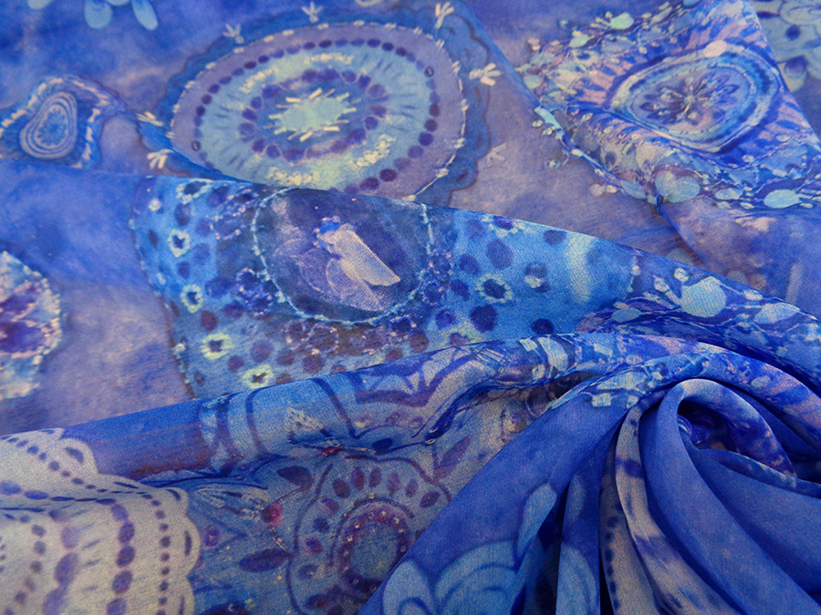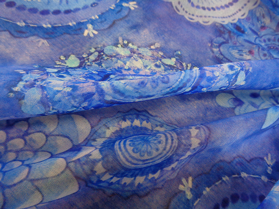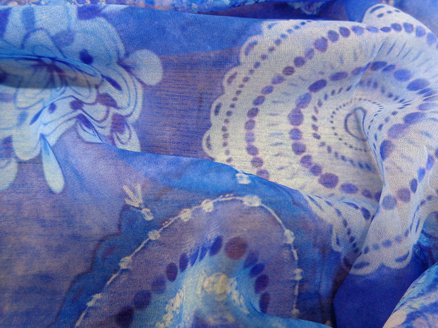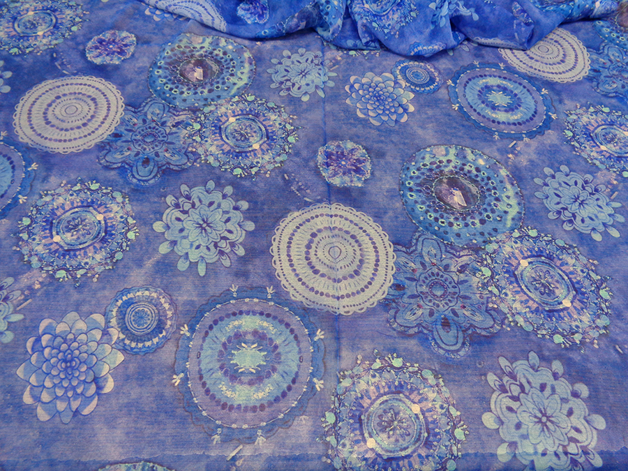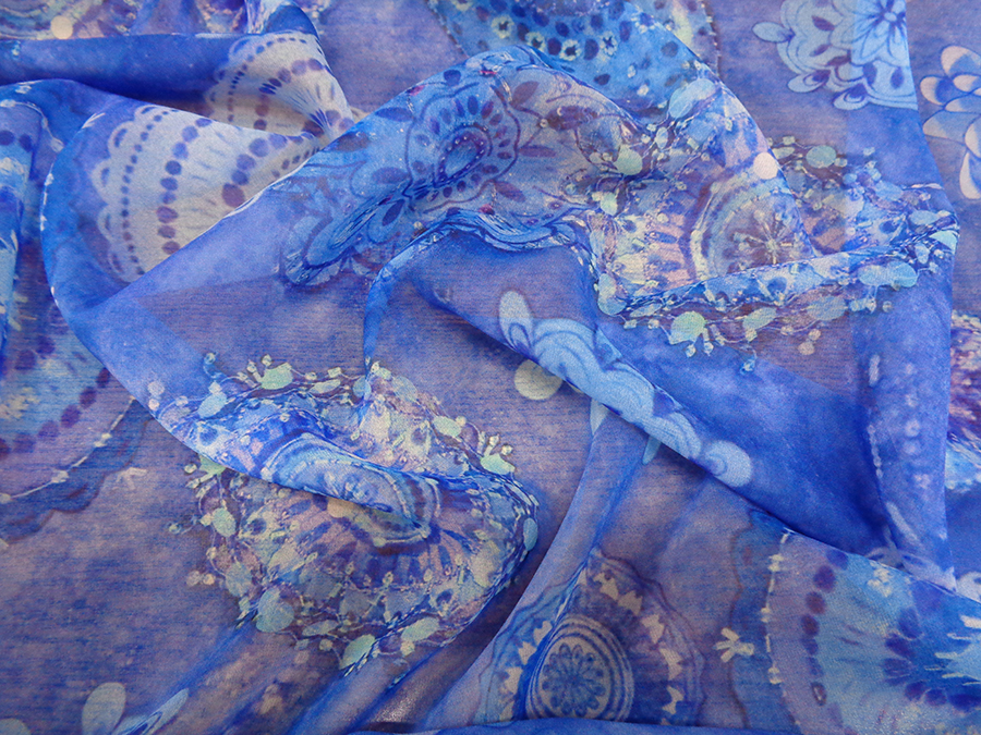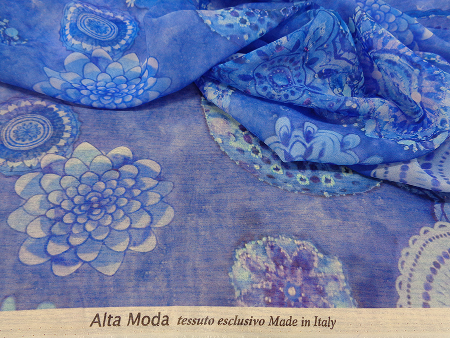 ESCLUSIVO TESSUTO IN GEORGETTE DI SETA, STAMPATO FANTASIA ALTA MODA. LEGGERA, MORBIDISSIMA E LEGGERMENTE VELATA. FONDO BLUETTE CON PARTICOLARE STAMPA 3D, EFFETTO RICAMI IN PAILLETTES NELLE VARIE SFUMATURE DEL BLUETTE. TESSUTO ESCLUSIVO AD ESAURIMENTO SCORTE. INDICATO PER: ABITI, CASACCHE, GONNE, PIGIAMA PALAZZO, CAFTANI, ECC..