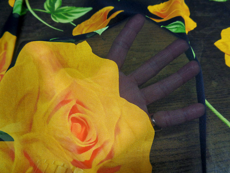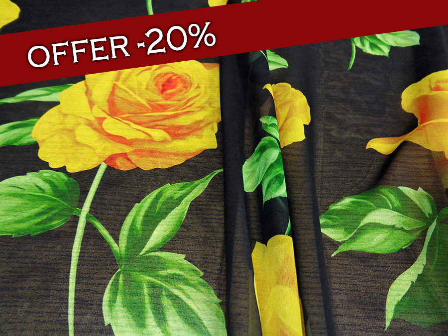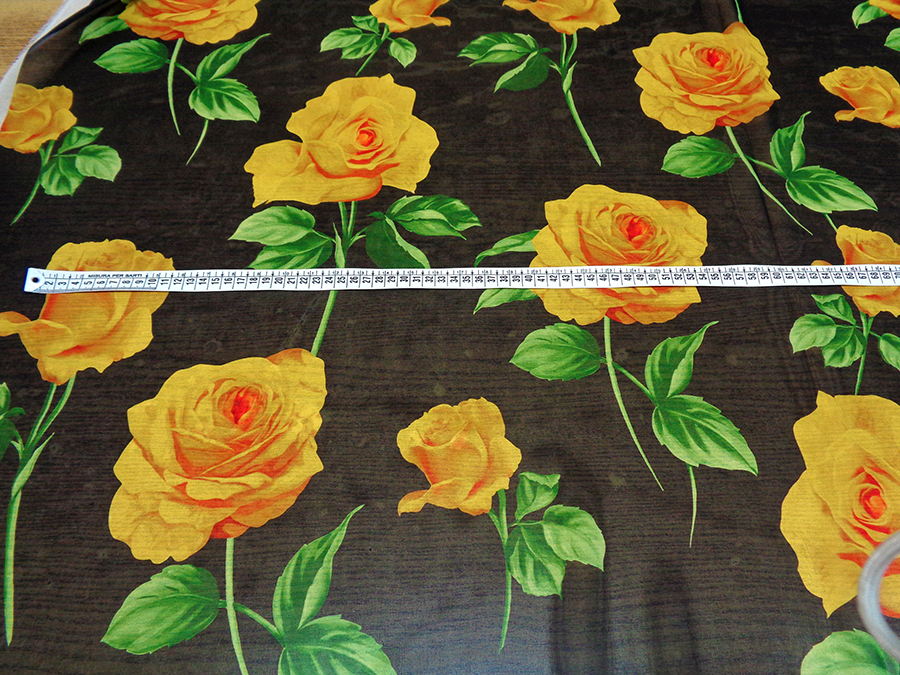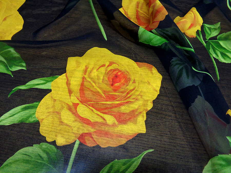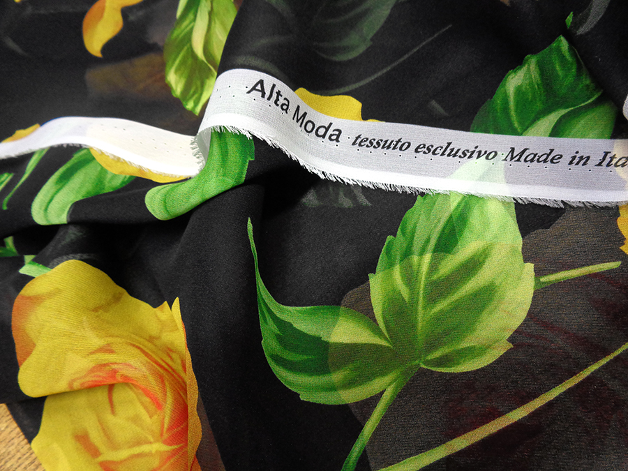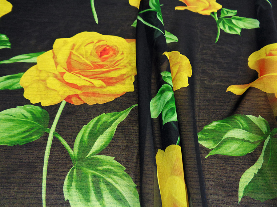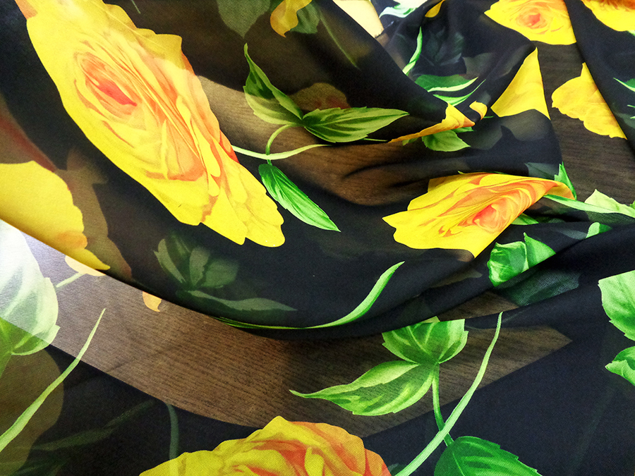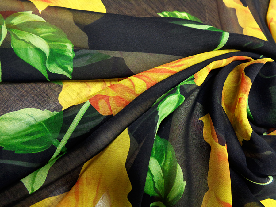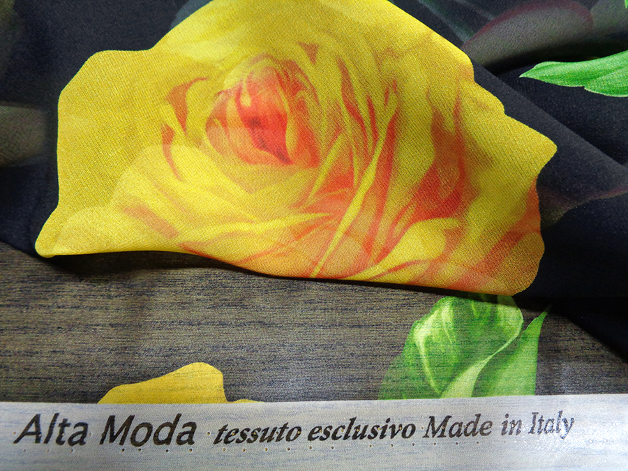 ESCLUSIVO TESSUTO IN GEORGETTE DI SETA CON FANTASIA ALTA MODA, MORBIDISSIMA, OPACA, LEGGERMENTE TRASPARENTE FONDO NERO CON GRANDI ROSE GIALLE E FOGLIE VERDI. TESSUTO ESCLUSIVO AD ESAURIMENTO SCORTE. INDICATO PER: ABITI, CASACCHE, GONNE, PIGIAMA PALAZZO, CAFTANI, ECC..