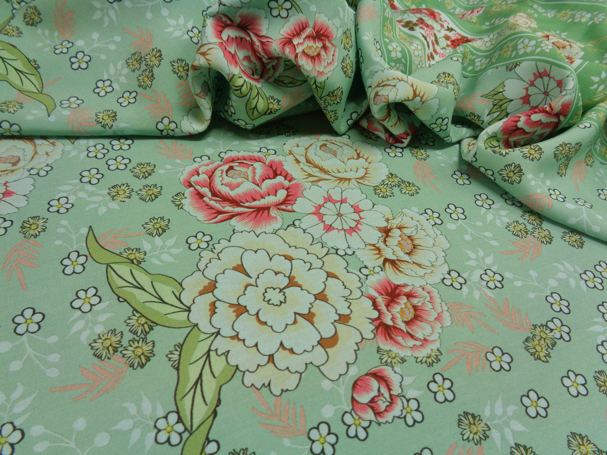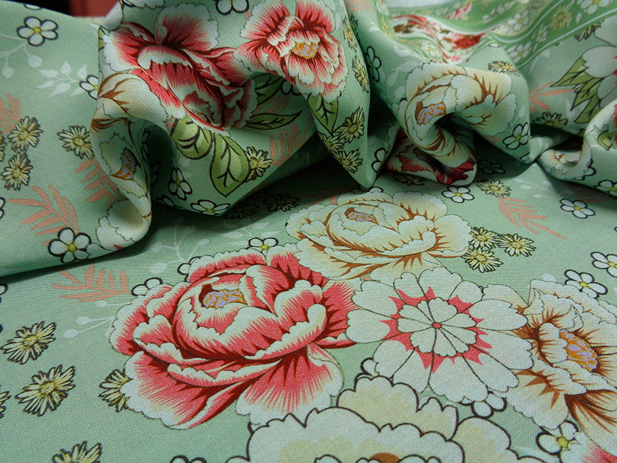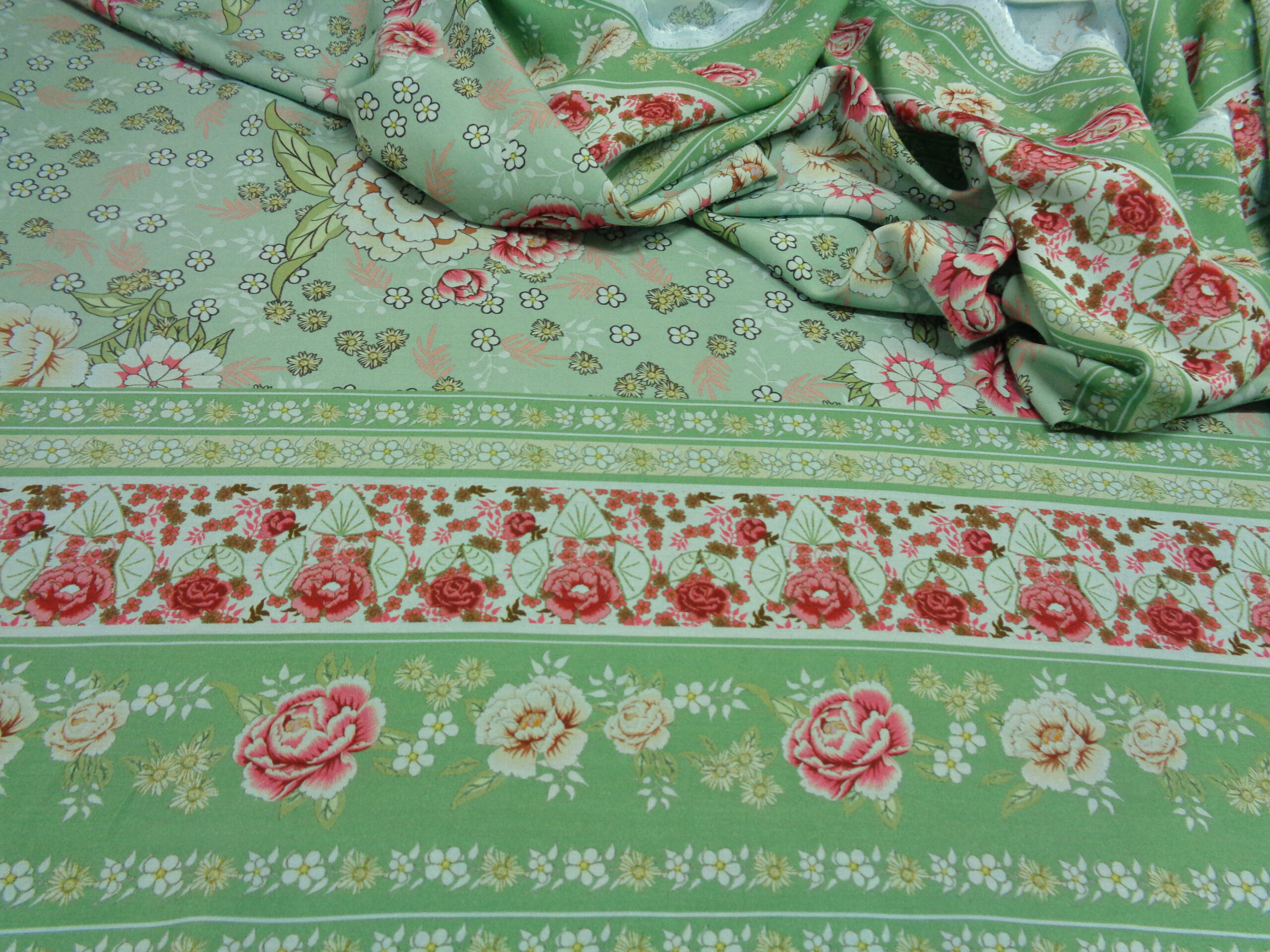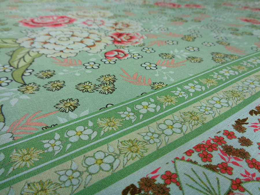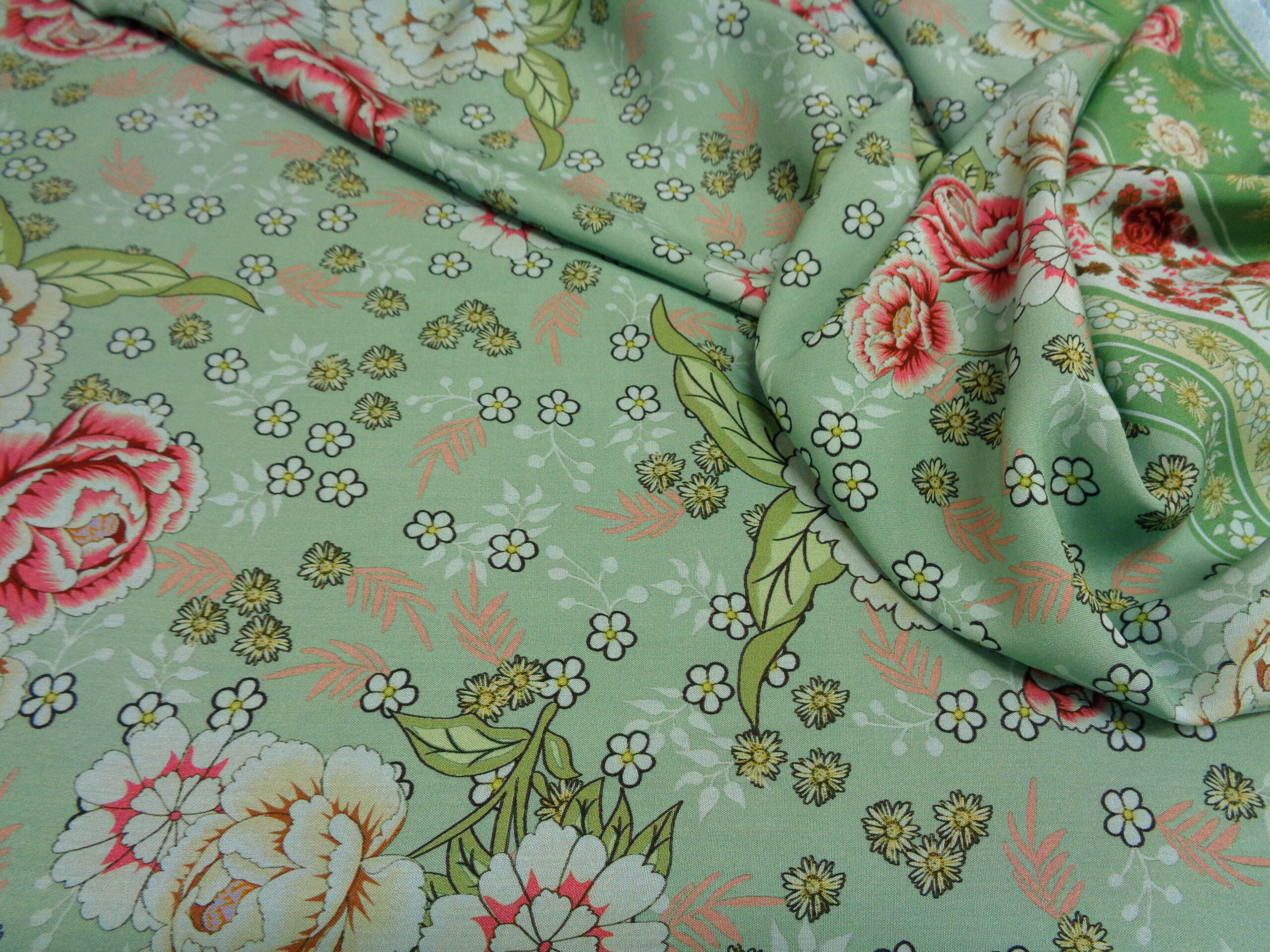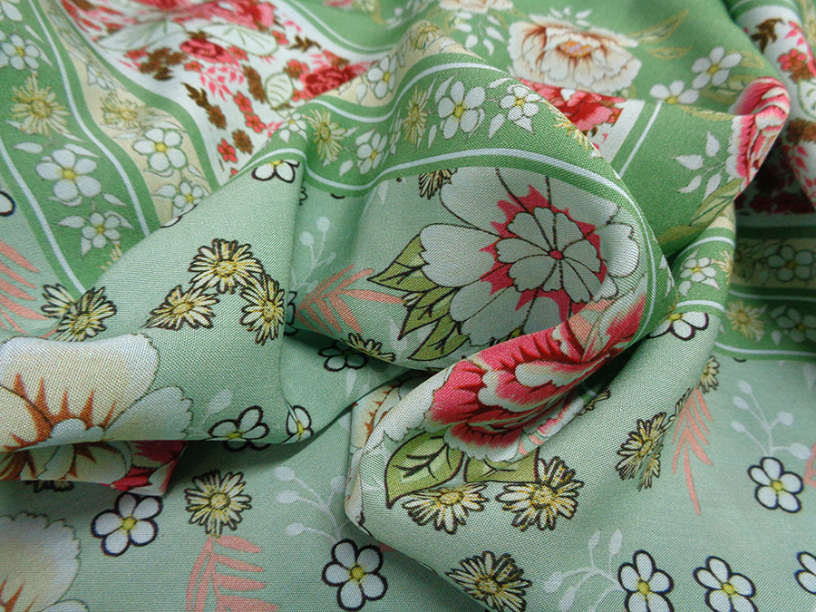 PREGIATO TESSUTO IN PURA VISCOSA, MORBIDISSIMO, COPRENTE, FRESCO ED OPACO. FONDO VERDE SALVIA CON PARTICOLARE FANTASIA FLOREALE E DOPPIO BORDO DI FINITURA DI 22 CM IN ENTRAMBE LE  CIMOSE. LA VISCOSA E’ UNA FIBRA NATURALE  ED E’ INDICATA PER PERSONE ALLERGICHE AI TESSUTI SINTETICI INDICATO PER: ABITI, CASACCHE, GONNE, PIGIAMA PALAZZO, CAFTANI, PANTALONI MORBIDI, ECC..