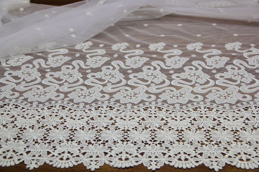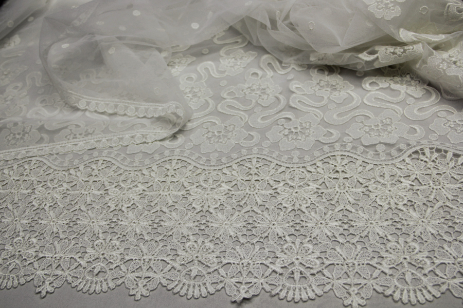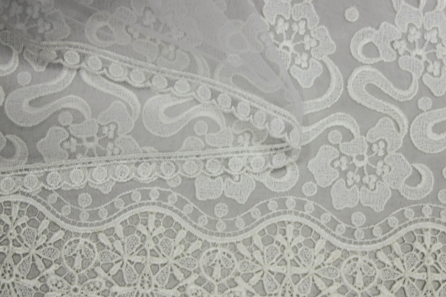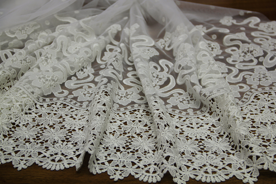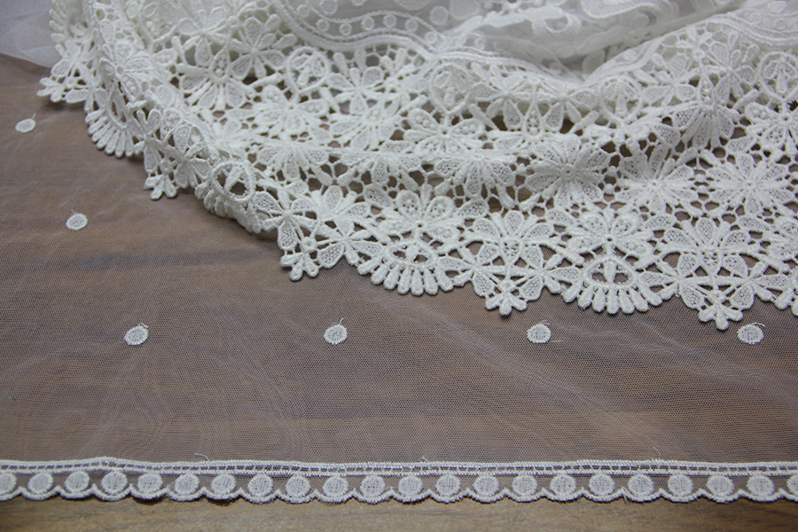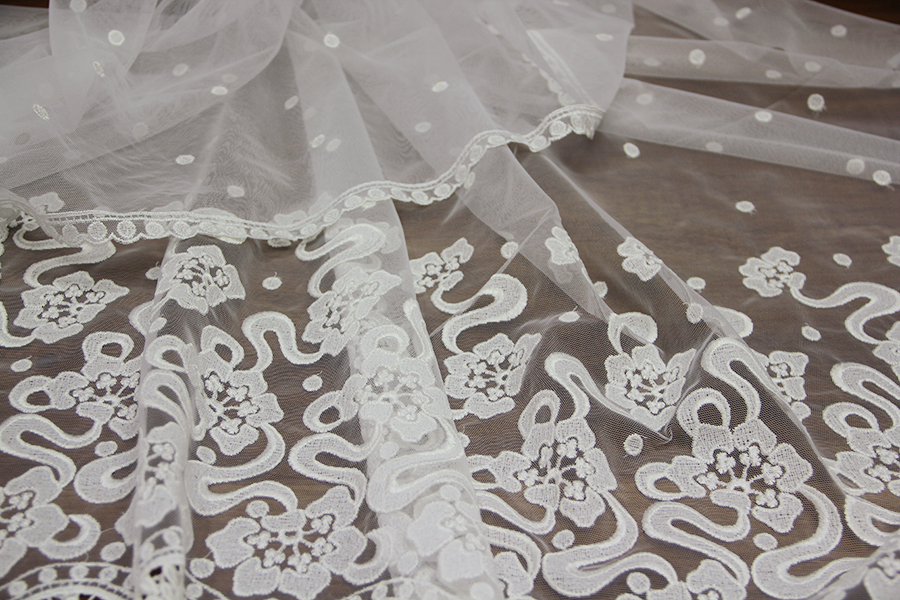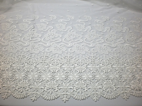 TULLE RICAMATO IN DEGRADE’, CON ALTO BORDO IN MACRAME’ FINALE, DEGRADANTE CON POIS RICAMATI .RIFINITO CON 2 FESTONI DIVERSI. INDICATO PER ABITI, CODE, VELI, ECC