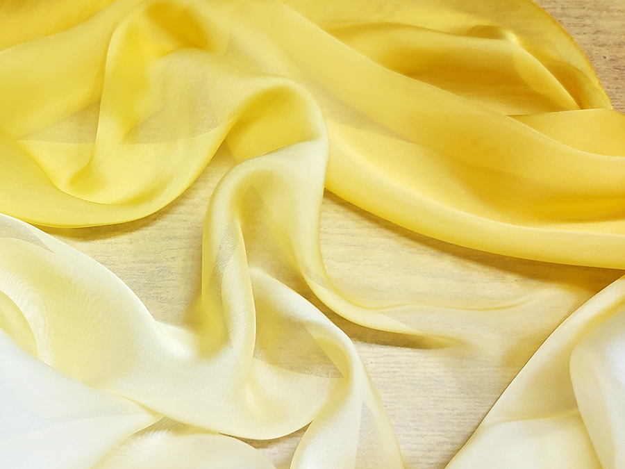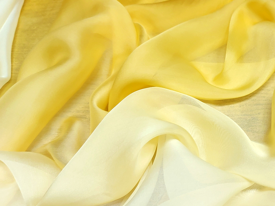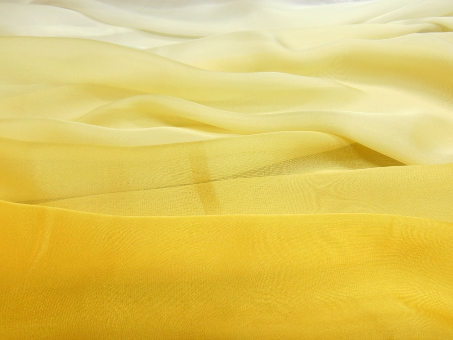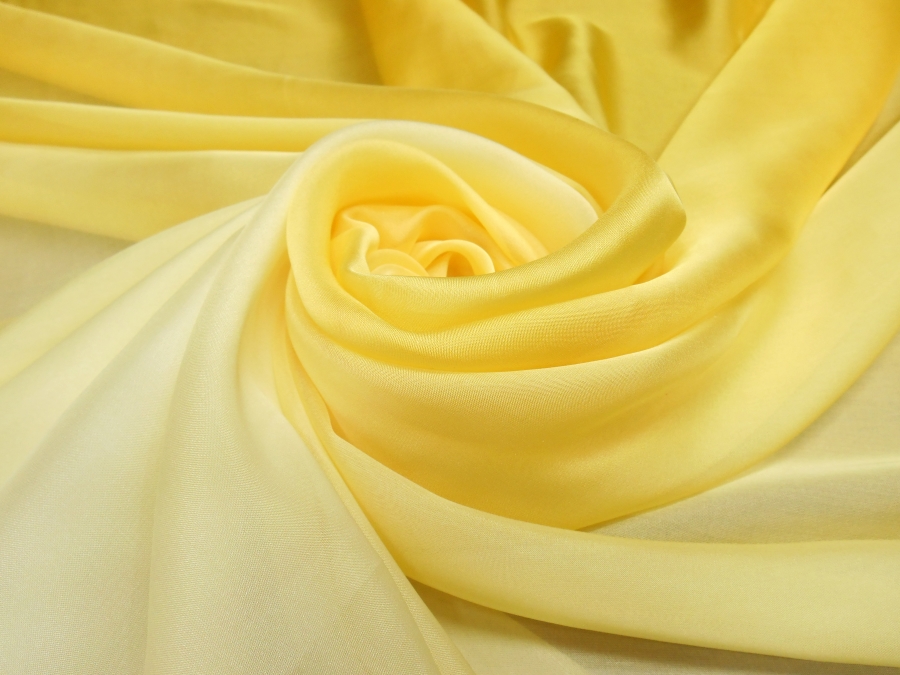 MORBIDO E VELATISSIMO CHIFFON IN SETA SFUMATO DA CIMOSA A CIMOSA PARTENDO DAL COLORE AVORIO PASSANDO NELLA PARTE CENTRALE AL GIALLO PAGLIERINO, TERMINANDO IN TONILITA’ GIALLO SOLE . INDICATO PER: ABITI ELEGANTI, BLUSE, ABITI DA SPOSA, ECC..