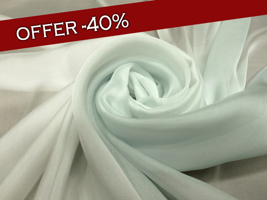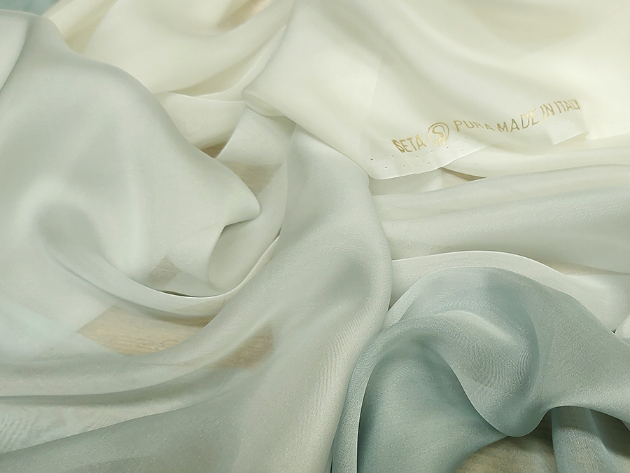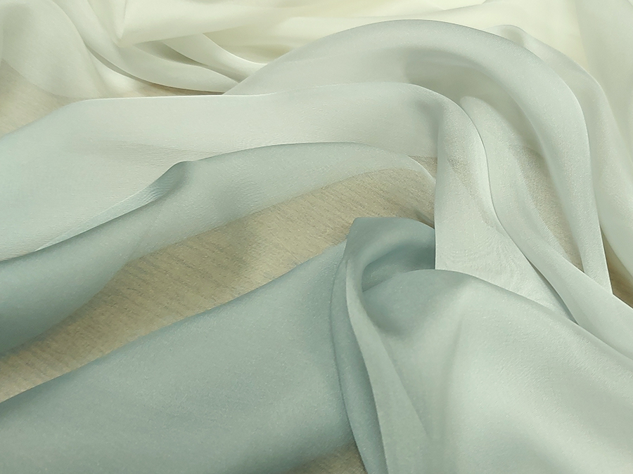 MORBIDO E VELATISSIMO CHIFFON IN SETA SFUMATO DA CIMOSA A CIMOSA PARTENDO DAL COLORE BIANCO PASSANDO NELLA PARTE CENTRALE AL PERLA, TERMINANDO IN TONALITA’ AZZURRO POLVERE CHIARISSIMO. INDICATO PER: ABITI ELEGANTI, BLUSE, ABITI DA SPOSA, ECC