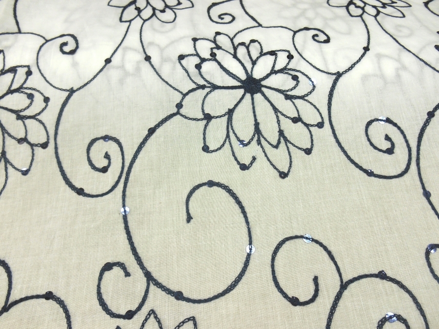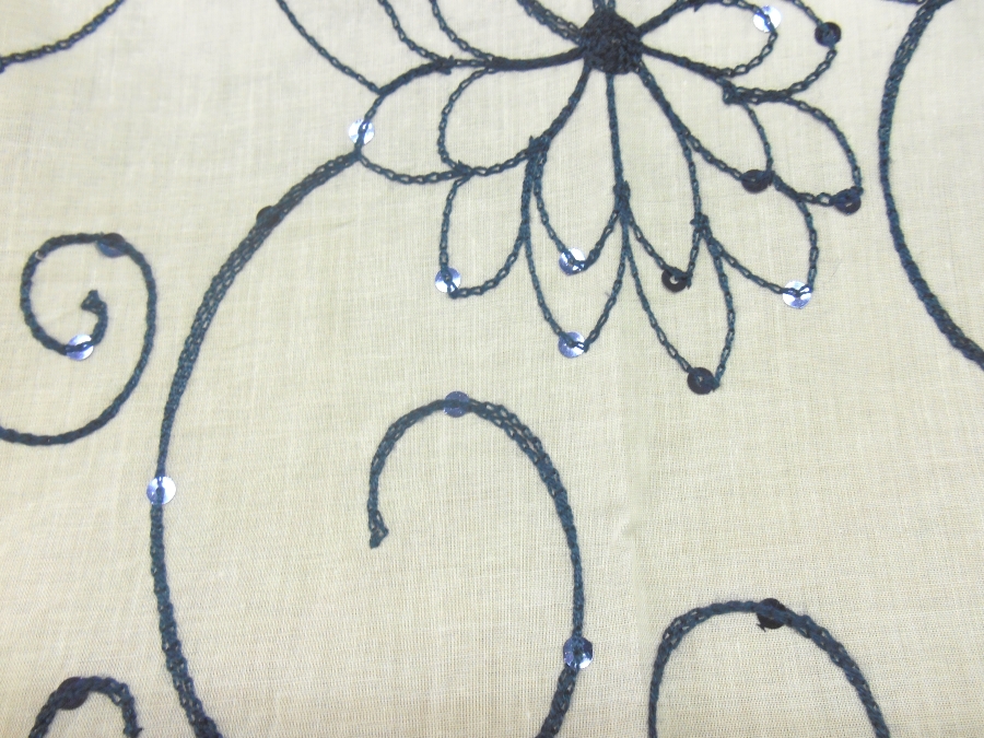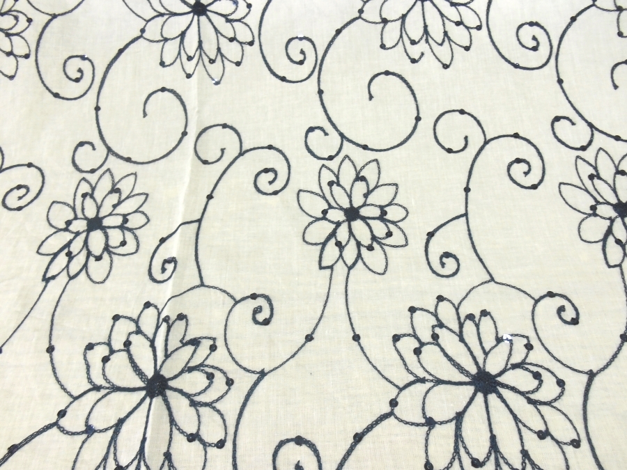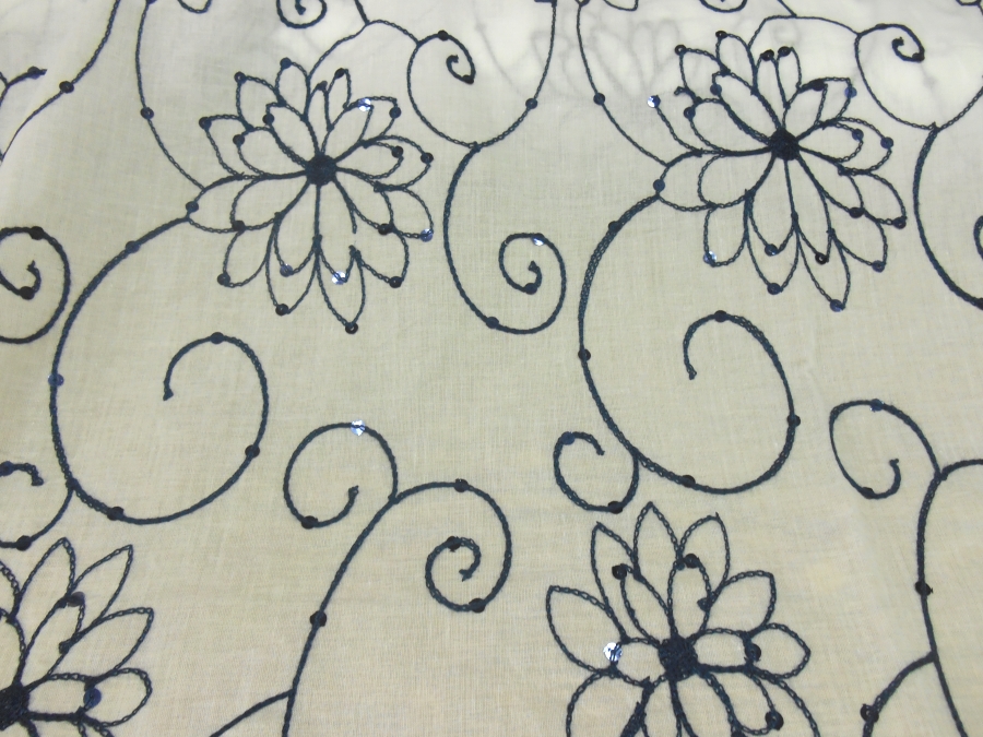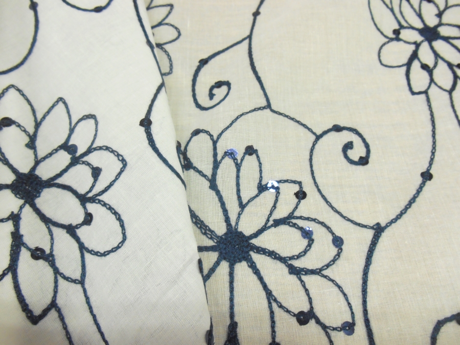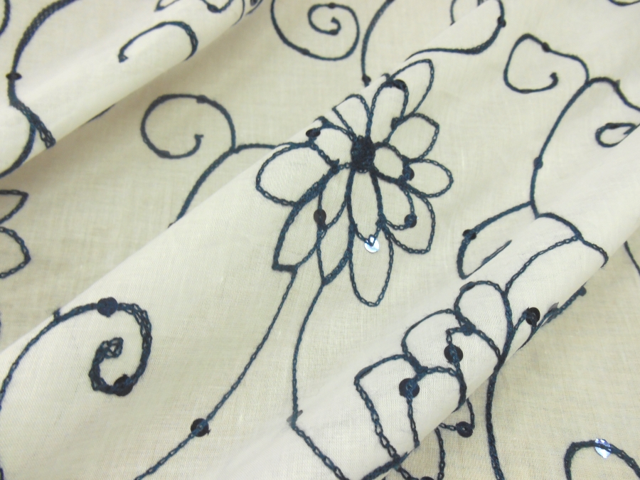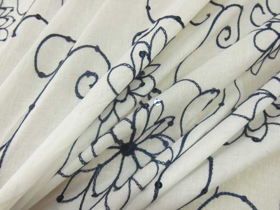 MORBIDISSIMA E LEGGERA BATISTA IN COTONE FONDO BIANCO CON RICAMI IN FILO BLU SCURO E PICCOLE PAILLETTES BLU A FORMARE DEI PUNTI LUCE. INDICATO PER : CAFTANI, ABITI, GONNE, CASACCHE ECC