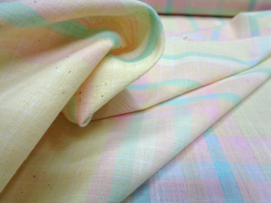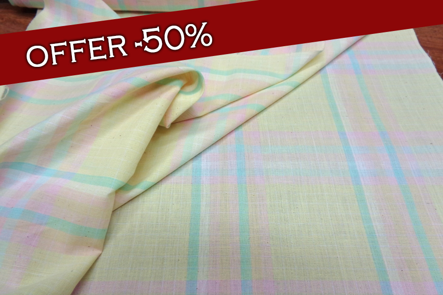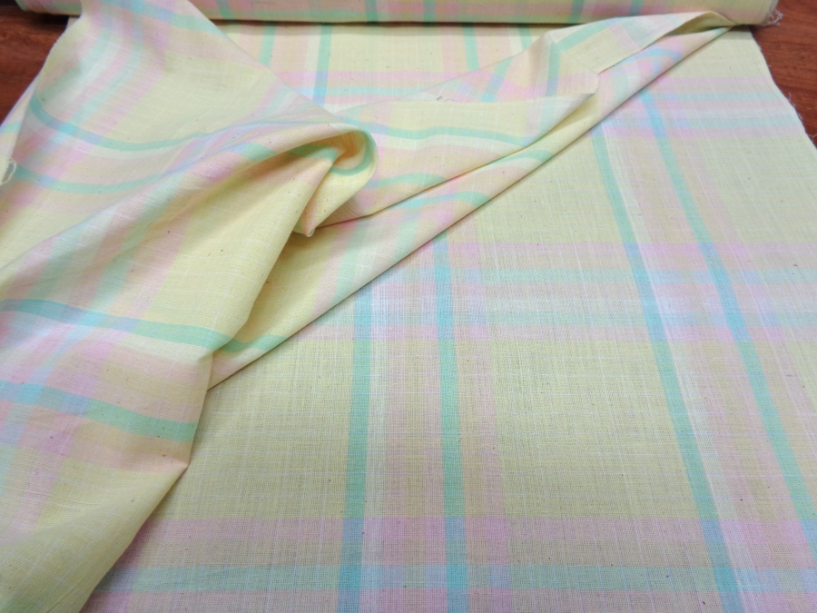 VERY SOFT AND LIGHT COTTON COVERING YELLOW BACKGROUND WITH TABLES ON THE PASTEL TONES. FABRIC WITH RAW NATURAL PLOT WITH DARK DOTS IN PLOT. SUITABLE FOR SHIRTS, CLOTHING ETC ..