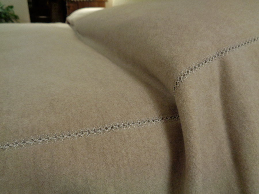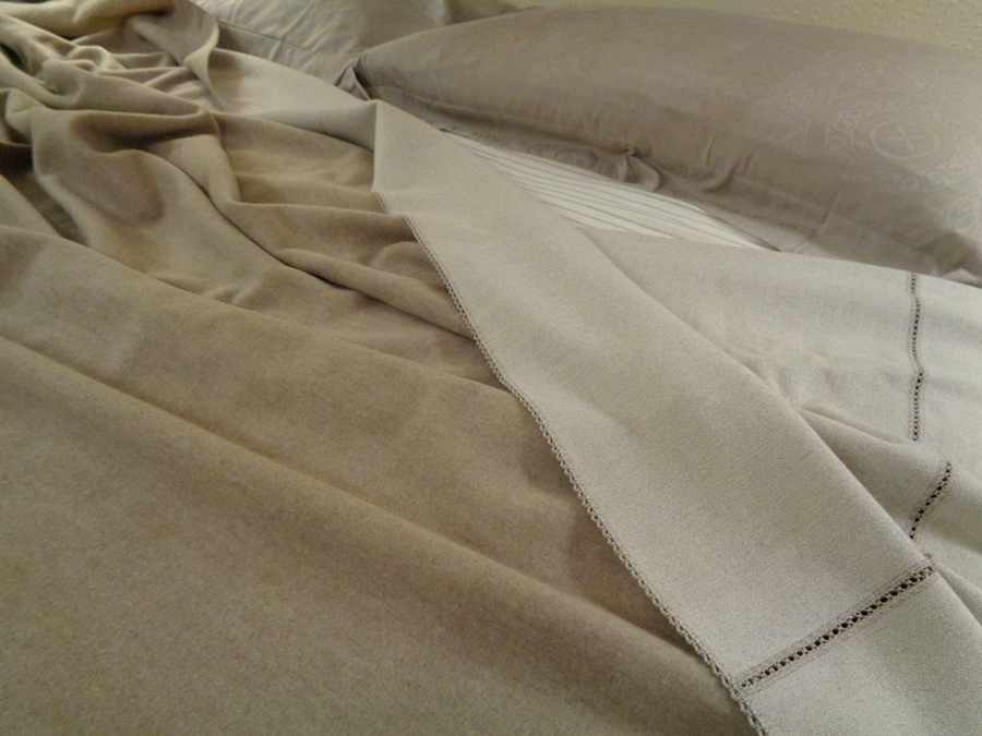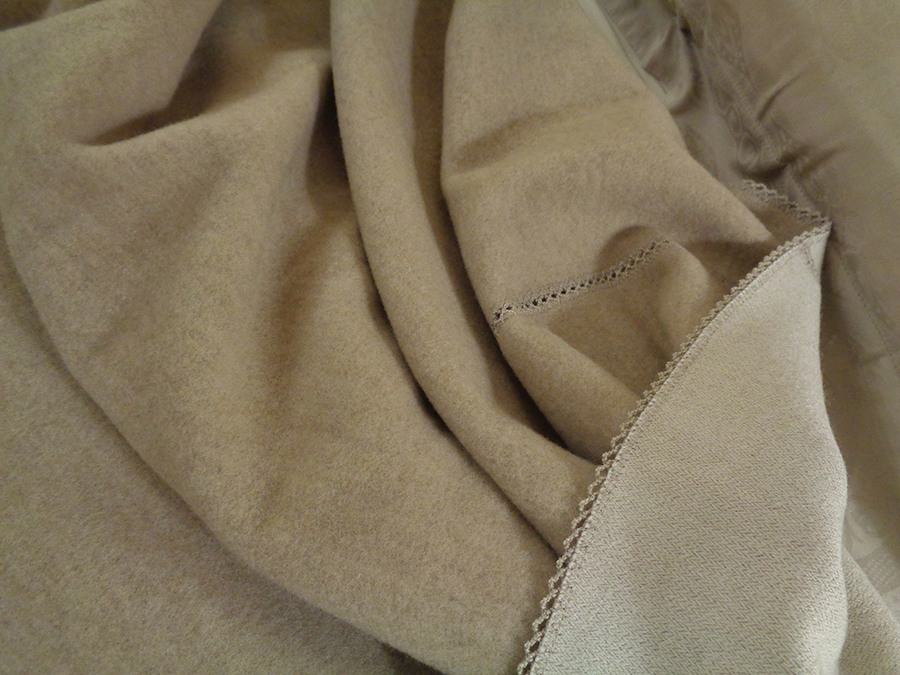 PREGIATA COPERTA REALIZZATA CON NOSTRO TESSUTO IN CASHMERE E LANA: MORBIDA, COMPATTA, CALDISSIMA, SOFFICE ED OPACA. COLORE NATURALE MELANGE CON ROVESCIO RASATO CHIARO CON PICCOLA SPINA DI PESCE TINTA SU TINTA. LA COPERTA SVILUPPA UNA MISURA (MT 2,60 IN LUNGHEZZA E MT 3,20 IN LARGHEZZA) CHE LE PERMETTE DI ESSERE UTILIZZATA SIA COME CALDA COPERTA CHE COME COPRILETTO. RIFINITURA SU TUTTO IL PERIMETRO CON PUNTO CROQUET, E PUNTO CROQUET NEI DUE LATERALI DELLA LARGHEZZA DEL LETTO (VEDI FOTO). POSSIBILITA’ DI ESSERE UTILIZZATA DA AMBO I LATI. PEZZI UNICI AD ESAURIMENTO.