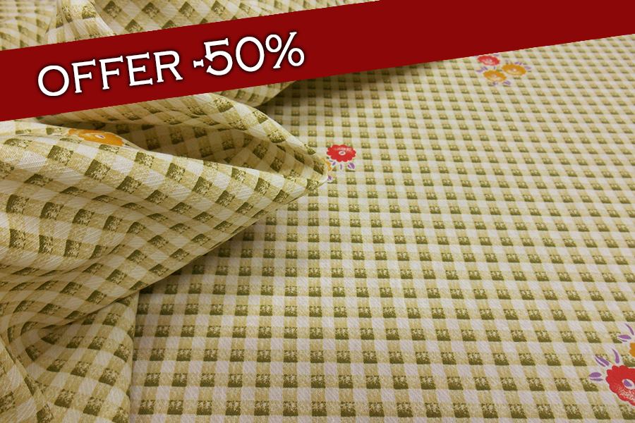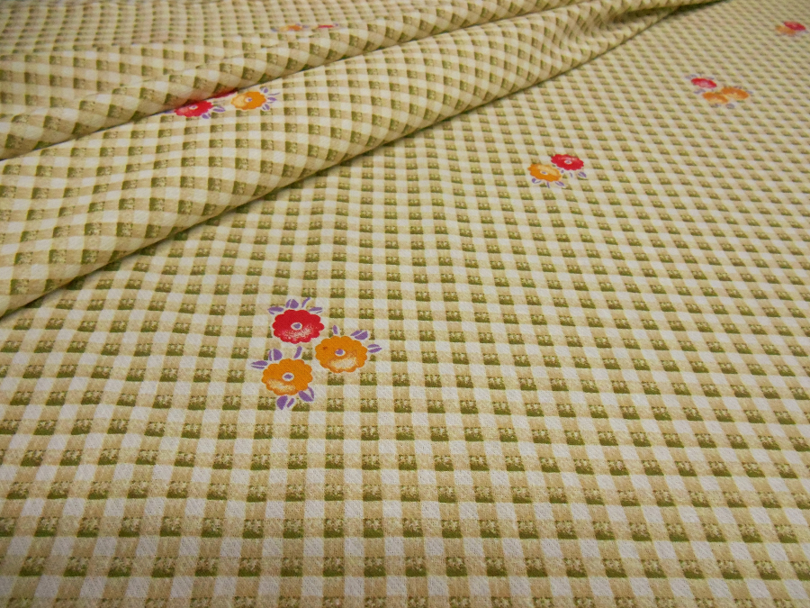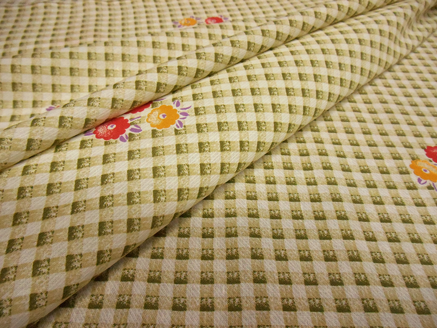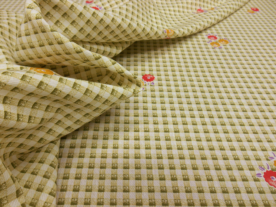 MORBIDO E LEGGERO COTONE FONDO AVORIO CON QUADRETTO STAMPATO EFFETTO SFUMATO VERDE SALVIA E FIOTI SPARSI SUI TONI DEL CORALLO E GIALLO. INDICATO PER: CAMICIE, ABITI, GONNE , CASCCHE, ECC..