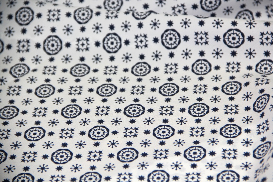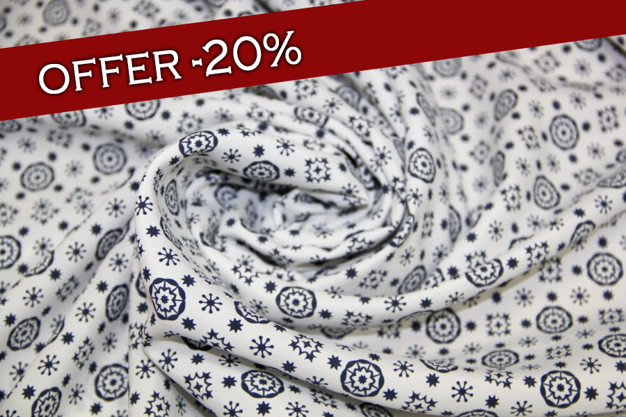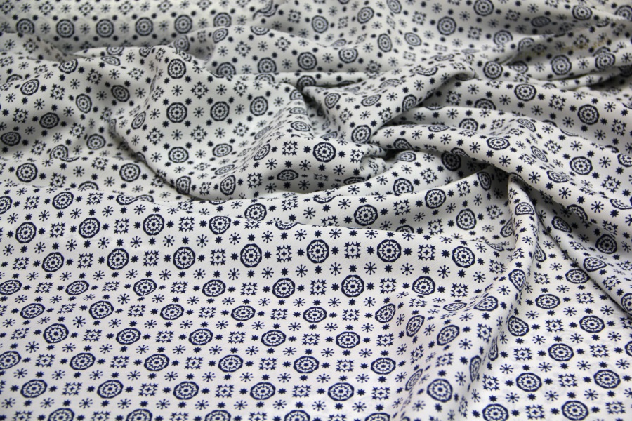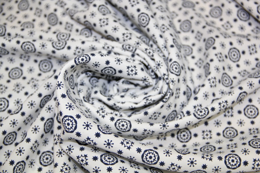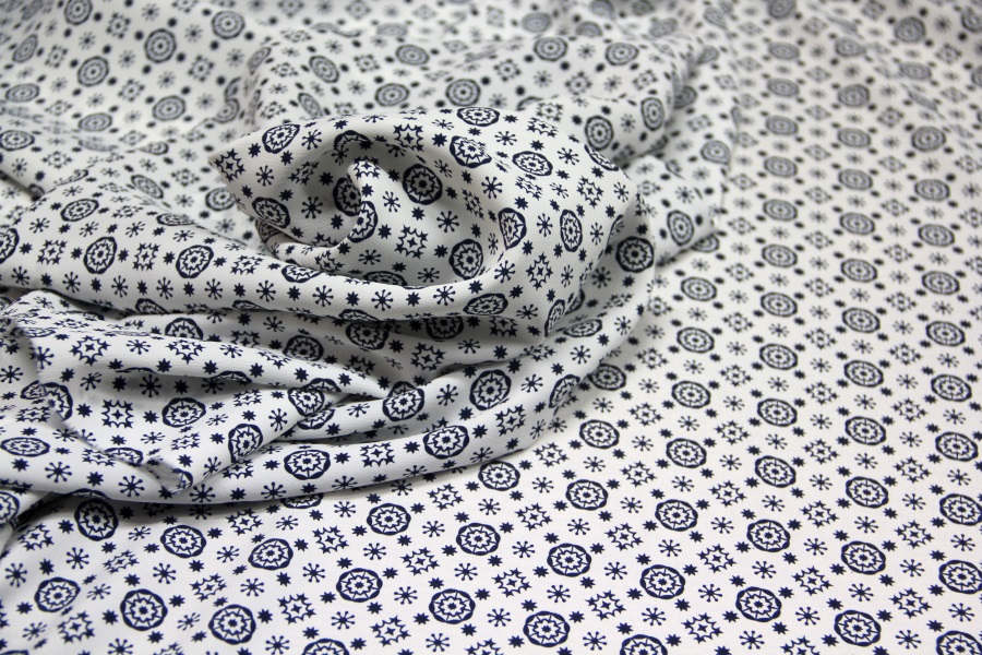 MORBIDA E OPACA CREPE DE CHINE FONDO BIANCO CON DISEGNO A CRAVATTINA BLU.