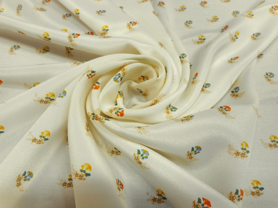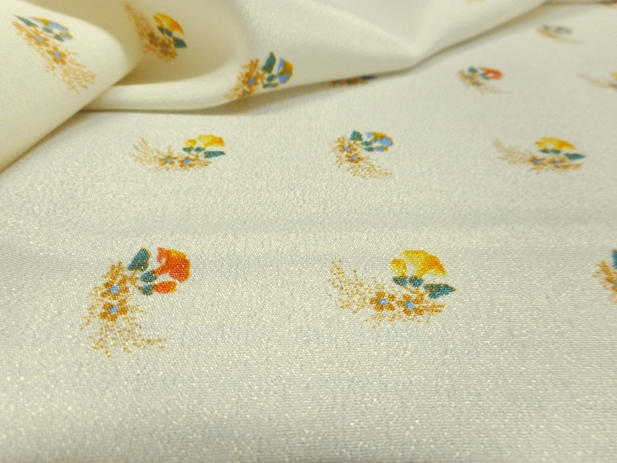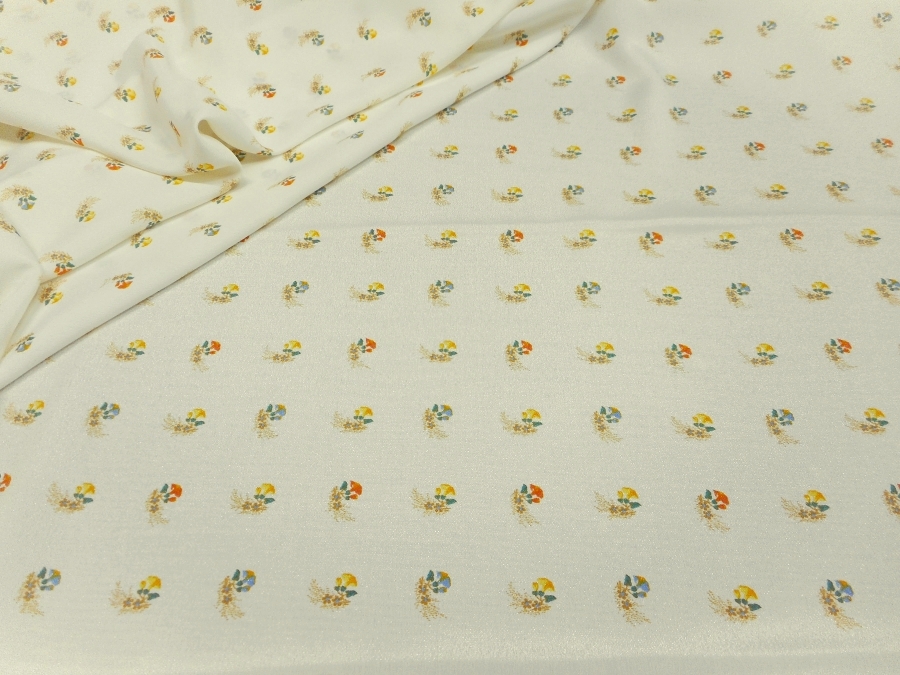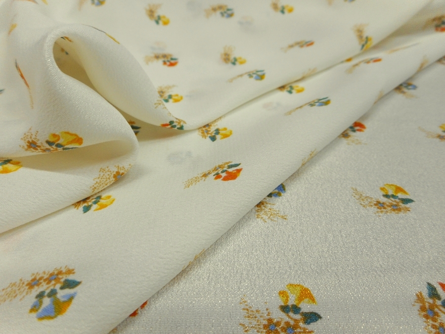 MORBIDISSIMA ED OPACA CREPE DE CHINE IN MISTO SETA , FONDO BIANCO CON PICCOLI E DELICATI FIORI GIALLI ED ARANCIO . :INDICATO PER: BLUSE, ABITI, GONNE, CAMICETTE, ECC, ECC..
