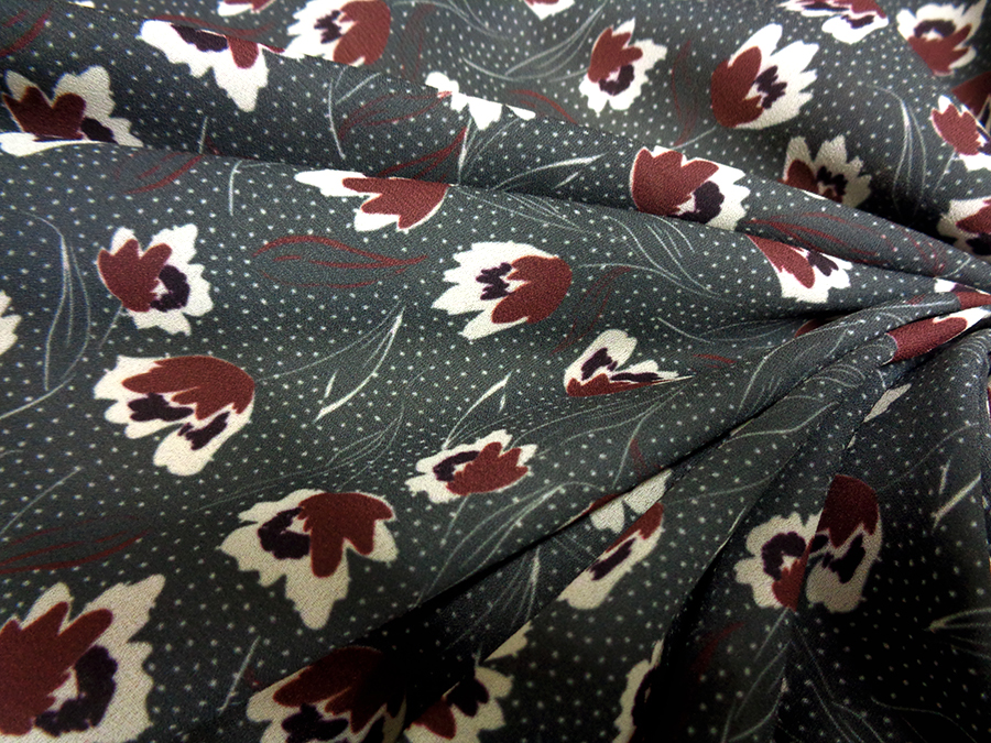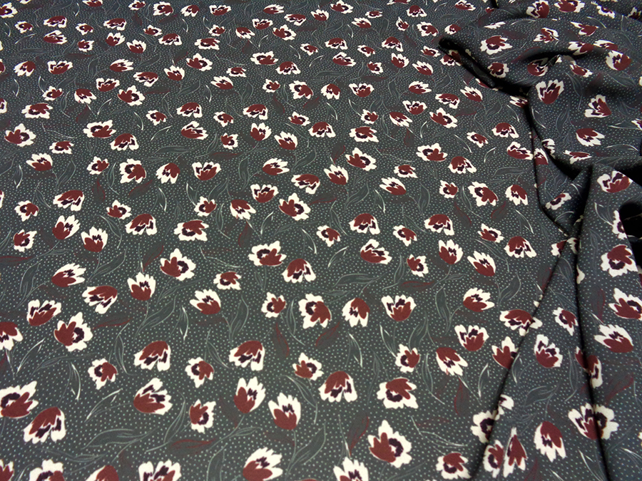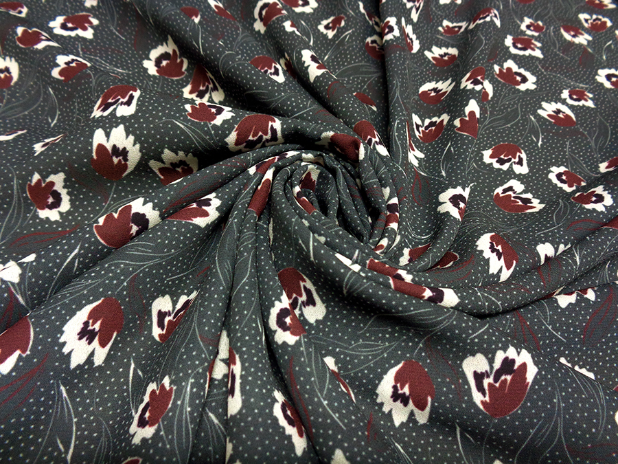 MORBIDO CREPE DE CHINE COPRENTE ED OPACA, FONDO GRIGIO CON PICCOLA FANTASIA FLOREALE SUI TONI DEL BORDEAUX E BIANCO. INDICATO PER: ABITI, CAFTANI, GONNE, CAMICIE, PANTALONI PALAZZO, ECC..