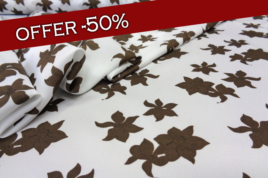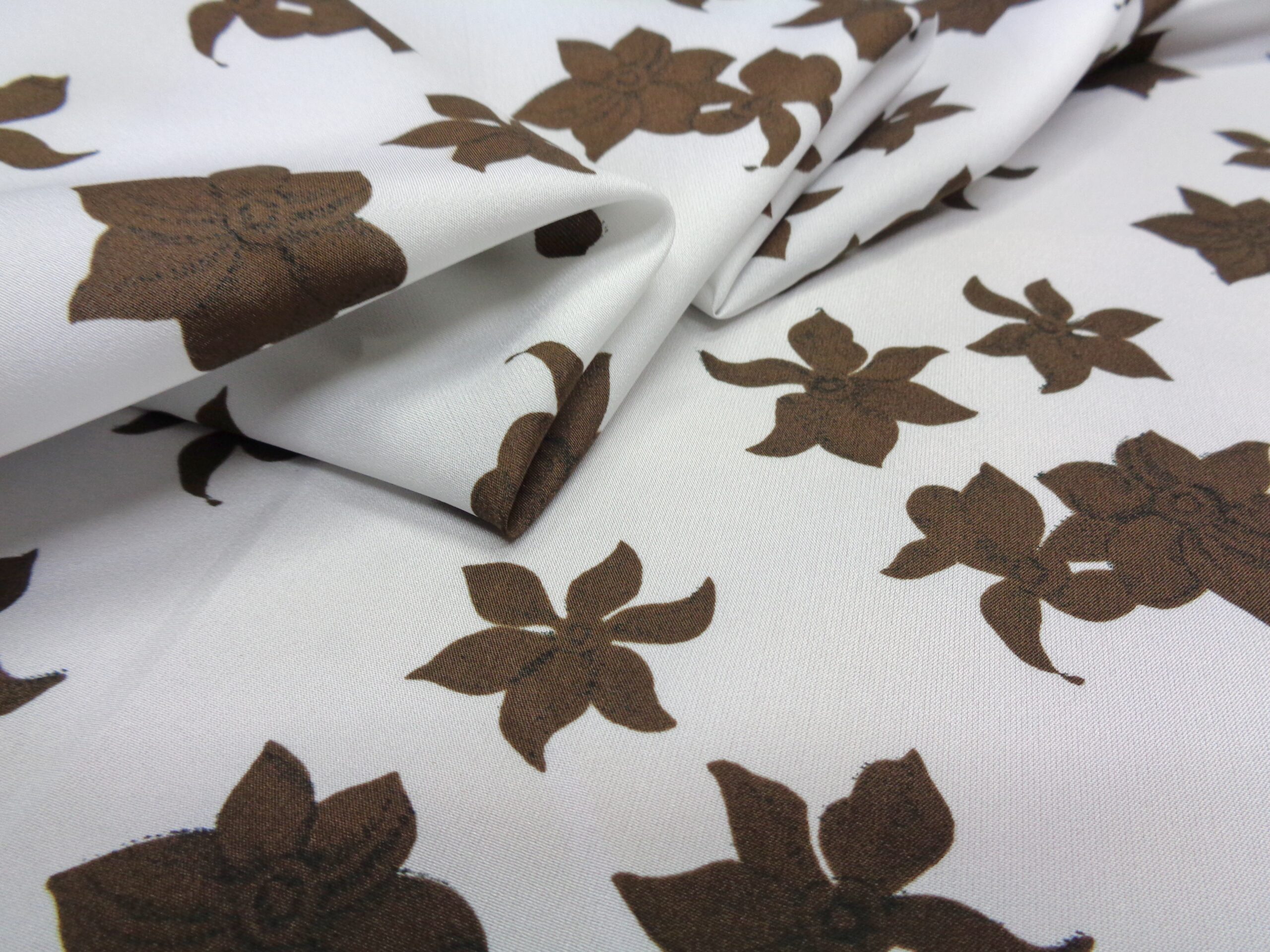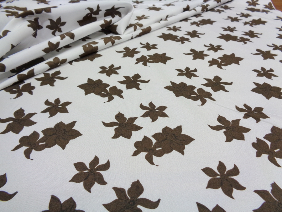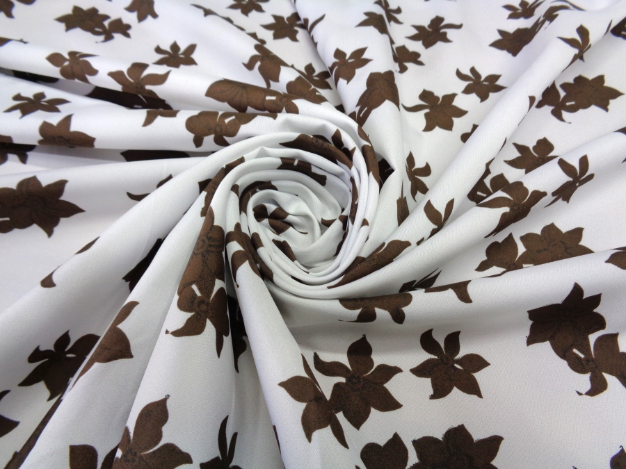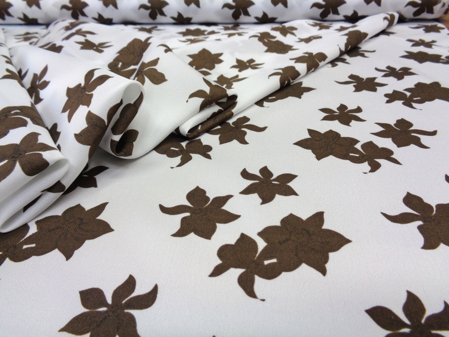 AUTHENTIC ’70s VINTAGE FABRIC. LIGH, MATT AND COVERING SILKY FABRIC. WHITE COLOR WITH BROWN FLOWERS. SUITABLE FOR: CLOTHING, ETC..