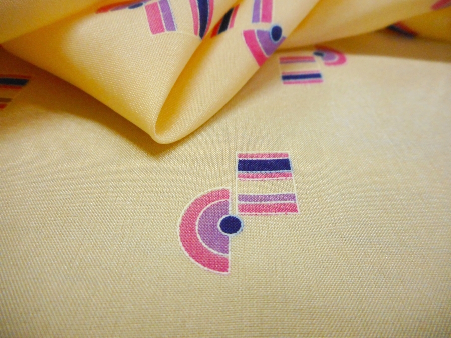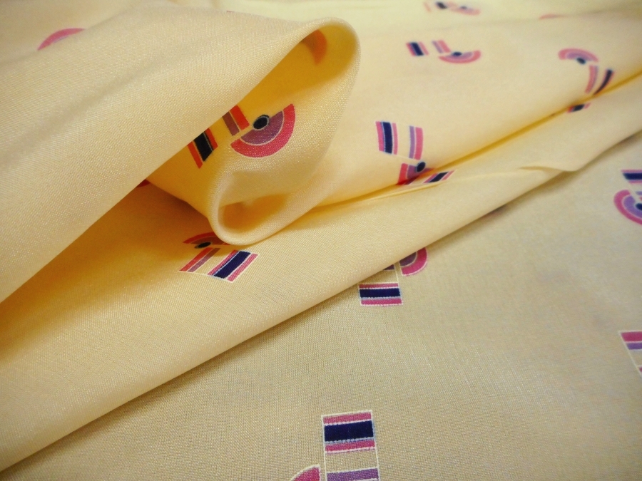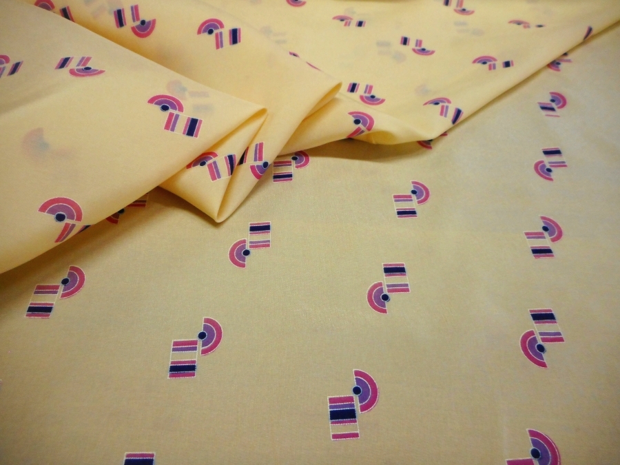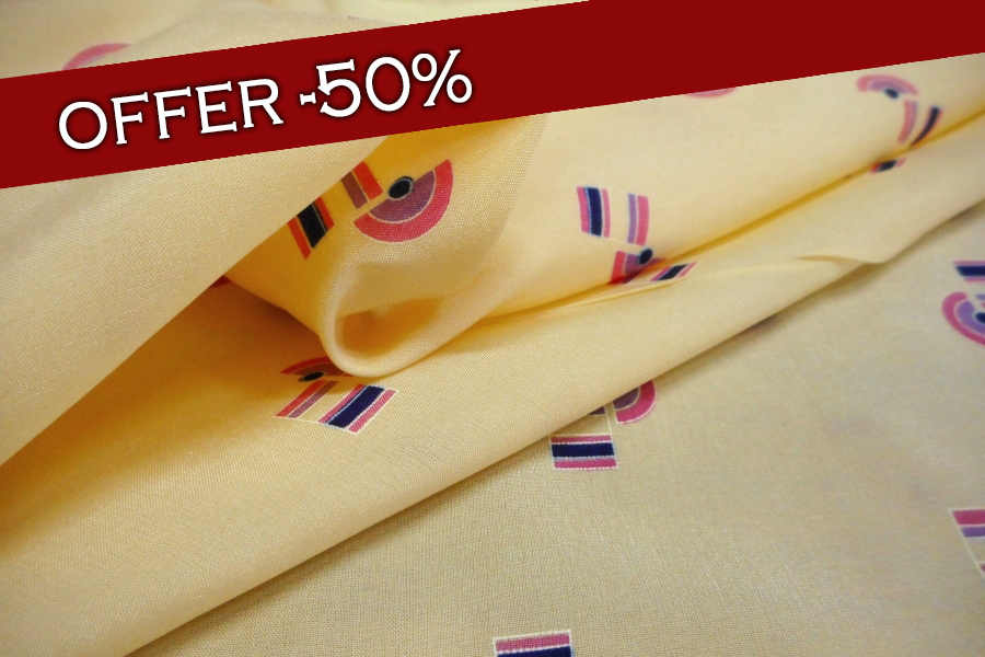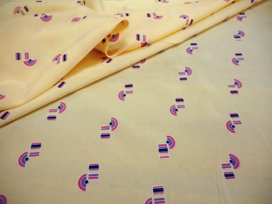 AUTENTICO VINTAGE ANNI 70 . CREPE DE CHINE OPACA , FONDO CREMA CON DISEGNI GEOMETRICI COLORE CICLAMINO. PARTE DOPPIA LEGGERMENTE IMPOLVERATA; SI CONSIGLIA DI LAVARLA O SCARTARLA PRIMA DI CONFEZIONARLA :INDICATO PER: BLUSE, ABITI, GONNE, CAMICETTE, ECC..