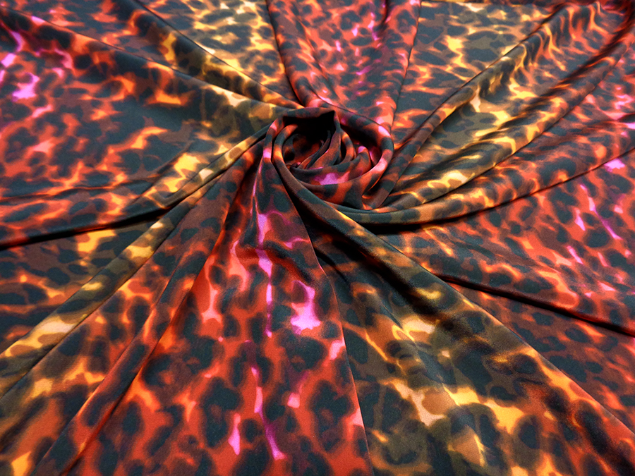 PREGIATO ED ESCLUSIVO TESSUTO IN  CREPE DE CHINE DI SETA PURA. LEGGERO, MORBIDO, OPACO E COPRENTE. PARTICOLARE  MACULATURA SUI TONI SFUMATI DEL ROSSO, BORDEAUX, FUCSIA OCRA E NERO  INDICATO PER: ABITI, GONNE, BLUSE, CAFTANI, PIGIAMA PALAZZO, FOULARD, TOP ECC..