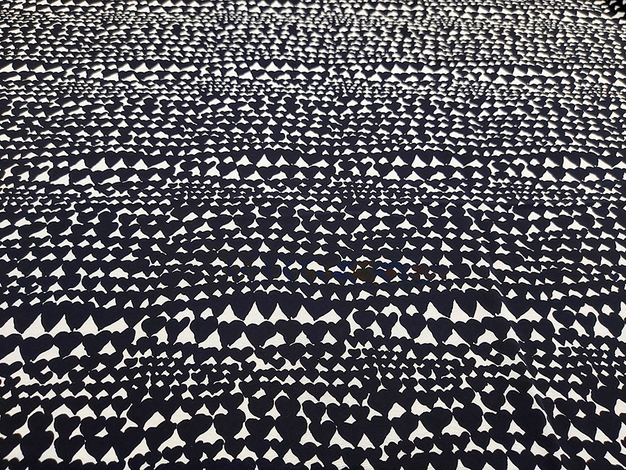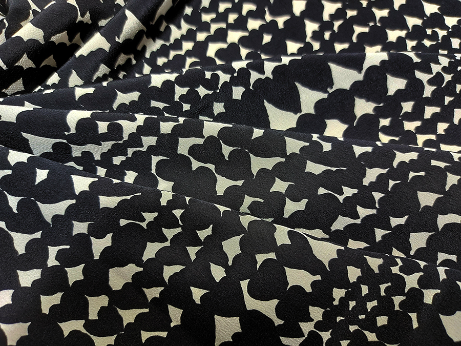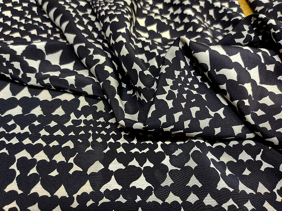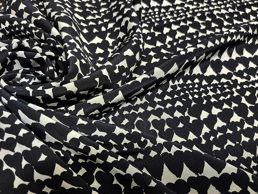 PREGIATO TESSUTO IN CREPE DE CHINE DI SETA PURA, LEGGERO, MORBIDO, SETOSO ED OPACO. FONDO BIANCO CON CUORI STILIZZATI NERI. INDICATO PER: ABITI, BLUSE, GONNE, BLUSE, CAFTANI, PIGIAMA PALAZZO , ECC.