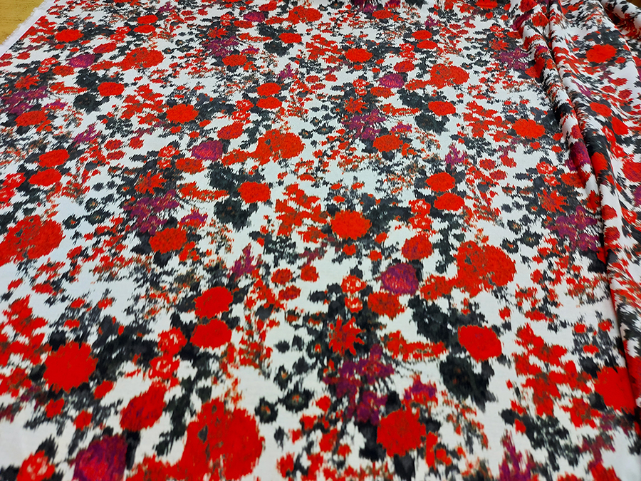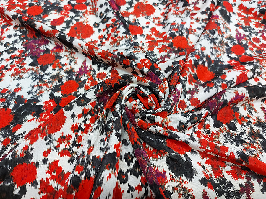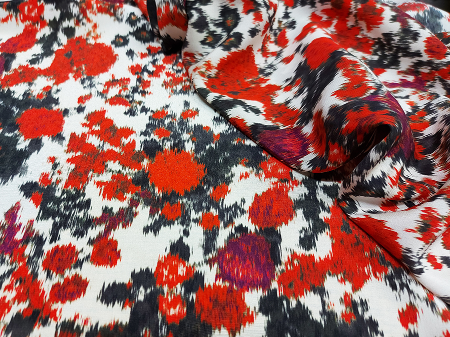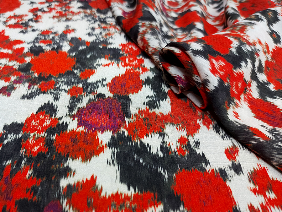 PREGIATO ED ESCLUSIVO TESSUTO IN CREPE DE CHINE DI SETA PURA ALTA MODA, LEGGERO, MORBIDO, SETOSO, OPACO E COPRENTE. FONDO BIANCO CON FANTASIA FLOREALE EFFETTO SFUMATO SUI TONI DEL ROSSO, VINACCIO E VERDE SCURO. INDICATO PER: CAMICIE, ABITI, GONNE, BLUSE, CAFTANI, PIGIAMA PALAZZO, ECC..