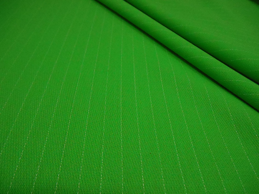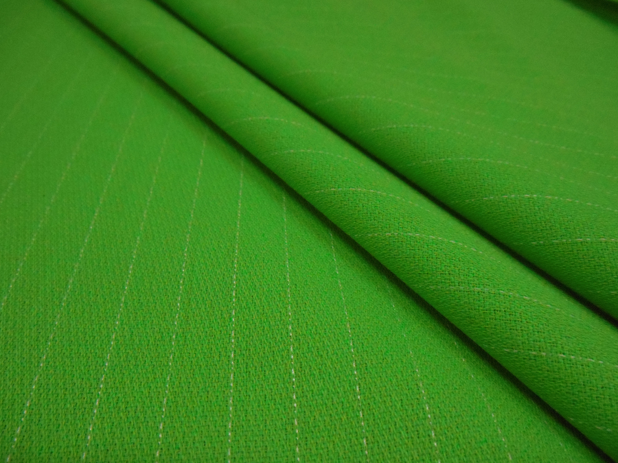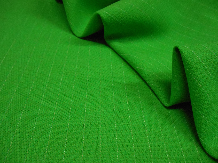 MORBIDA, LEGGERA CREPE IN PURA LANA VERDE ACIDO (BRILLANTE) CON IMPERCETTIBILE GESSATO BIANCO EFFETTO IMPUNTURA. DISTANZA 1 CM. INDICATO PER: TAILLEUR , GIACCHE, GONNE, ABITI, PANTALONI, ECC..