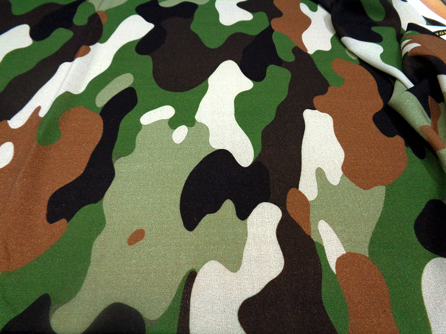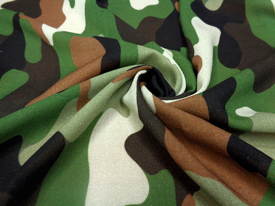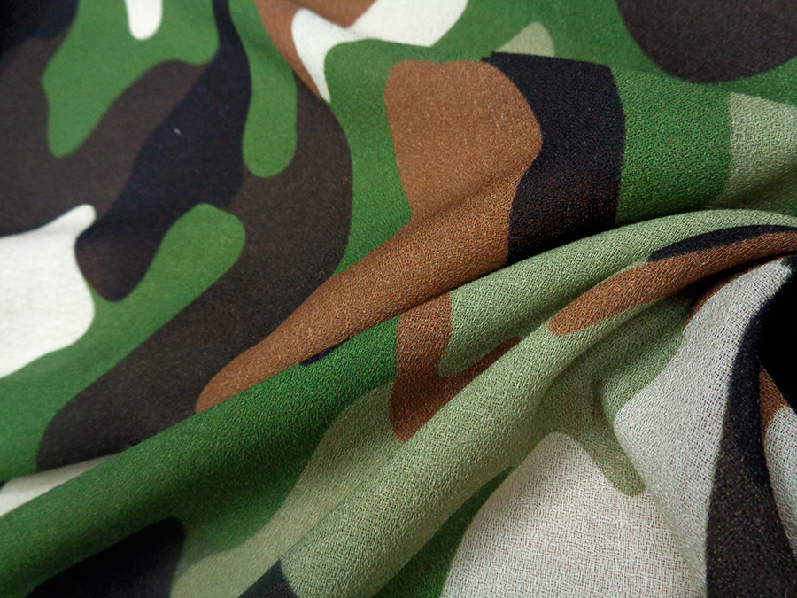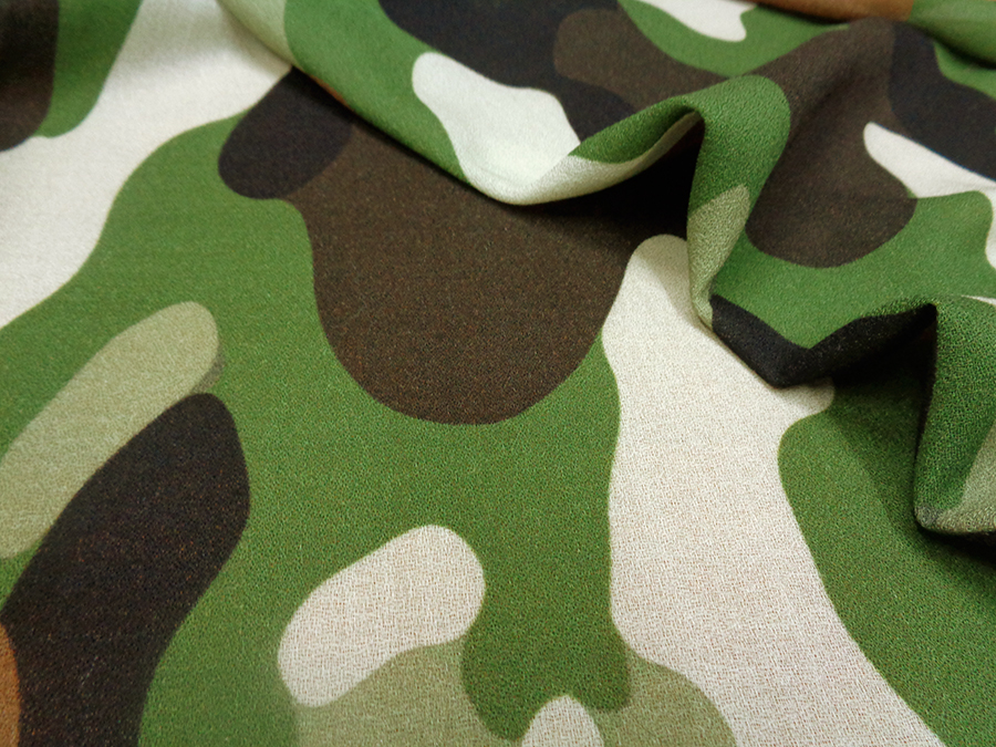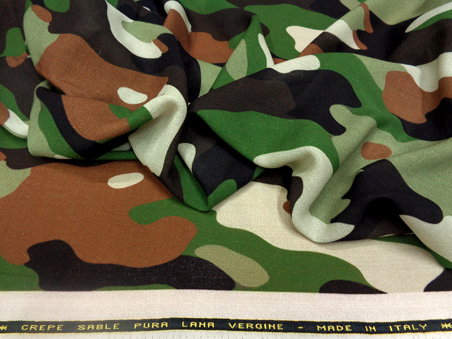 PREGIATA ED ESCLUSIVA CREPE SABLE IN LANA PURA LANA MORBIDA E FLUENTE CON CARATTERISTICA TRAMA CRESPA. FANTASIA MIMETICA SUI TONI DEL VERDE, MARRONE, BEIGE. INDICATO PER: ABITI, CASACCHE, GONNE, PIGIAMA PALAZZO, KIMONO, VESTAGLIE, ECC..