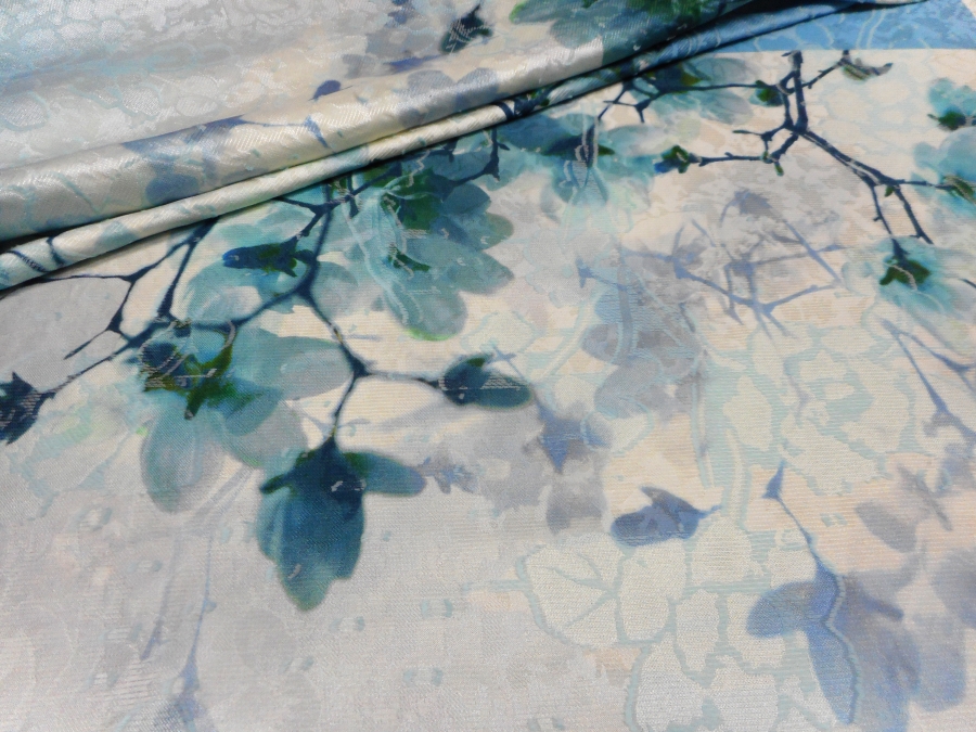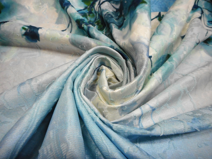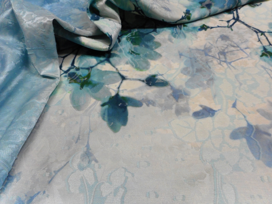 ESCLUSIVO TESSUTO DAMASCATO PESO MEDIO, SEMI-RIGIDO, CON LAVORAZIONE JAQUARD IN RILIEVO TINTA SU TINTA E FANTASIA SFUMATA IN DEGRADE’ SUI TONI DELL’AZZURRO. PANNELLI DA CM 80 CADUNO. INDICATO PER: GIACCHE, TAILLEUR, ABITI, GONNE, ECC..
