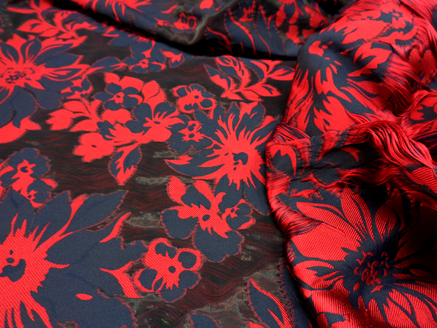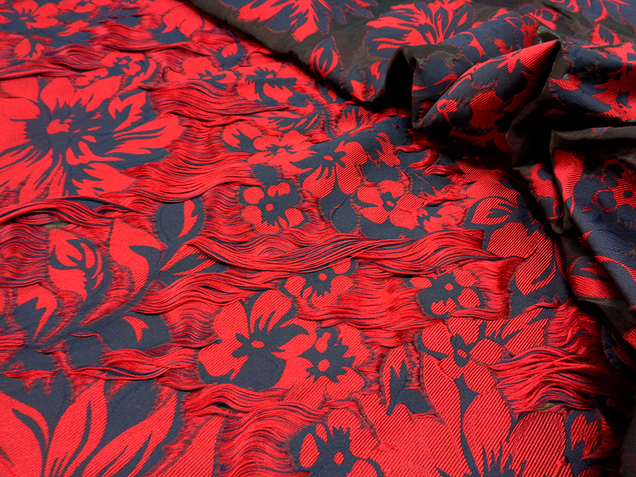 PREGIATO ED ESCLUSIVO DAMASCATO JAQUARD ALTA MODA. PESO MEDIO, LEGGERMENTE E LUMINOSO CON PARTICOLARE LAVORAZIONE E POSSIBILITA’ DI UTILIZZO DA AMBO I LATI. DA UN LATO FONDO BLU CON FANTASIA JAQUARD ROSSA E FILATO IN SETA EFFETTO FRANGIA IN RILIEVO. DALL’ALTRO LATO JAQUARD FONDO BLU E ROSSO (SENZA FRANGIE). TESSUTO UNISEX INDICATO PER: GIACCHE, GONNE, ABITI, COMPLETI, PANTALONI, ECC..