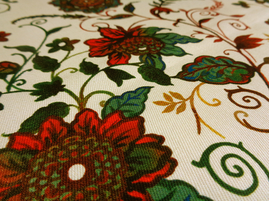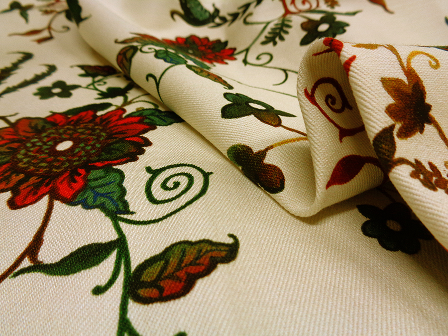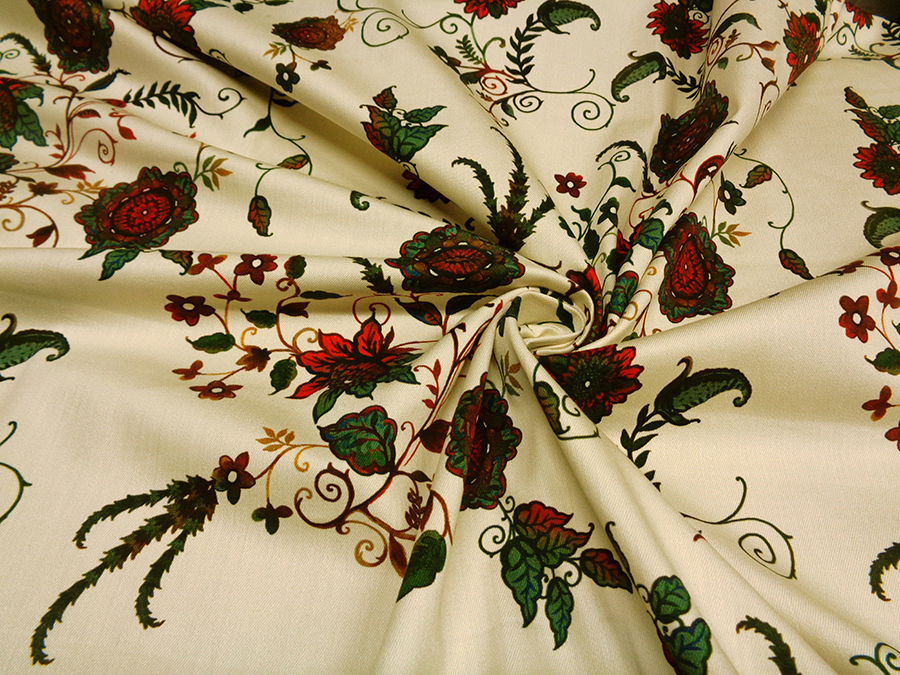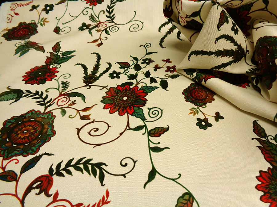 PREGIATO TESSUTO IN DRILL DI COTONE ELASTICIZZATO (IN LARGHEZZA). CORPOSO, COMPATTO, CONSISTENTE (TIPO JEANS). FONDO CREMA CON FANTASIA FLOREALE SUI TONI DEL VERDE E ROSSO RUBINO. INDICATO PER: PANTALONI, ABITI, GONNE, GIACCHE, GIUBBOTTI, ECC..