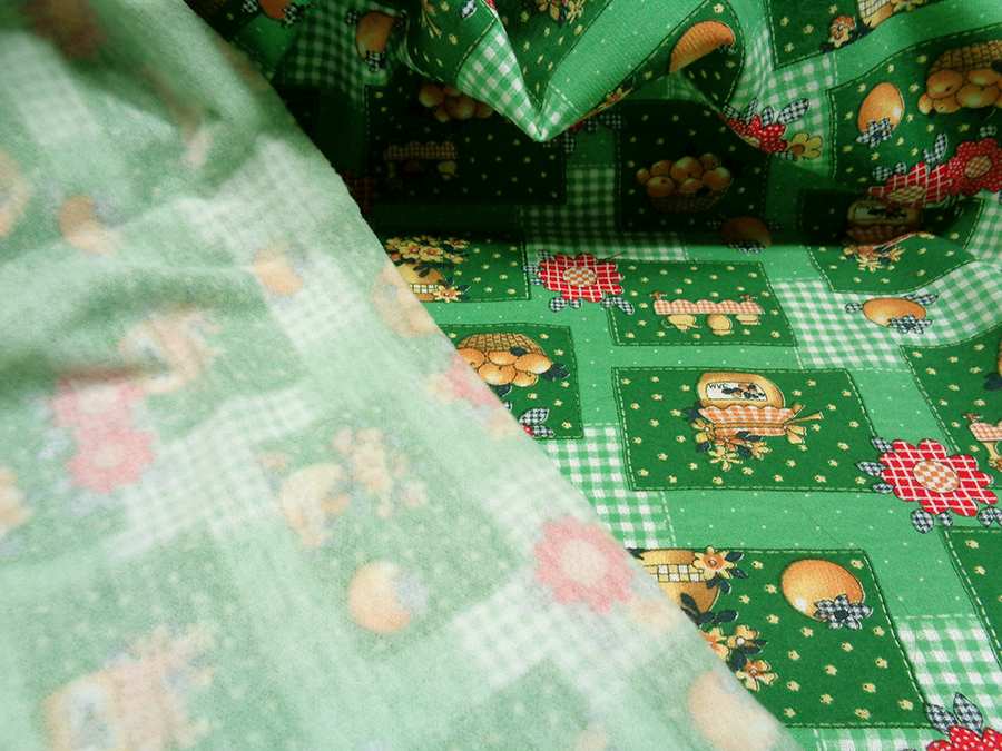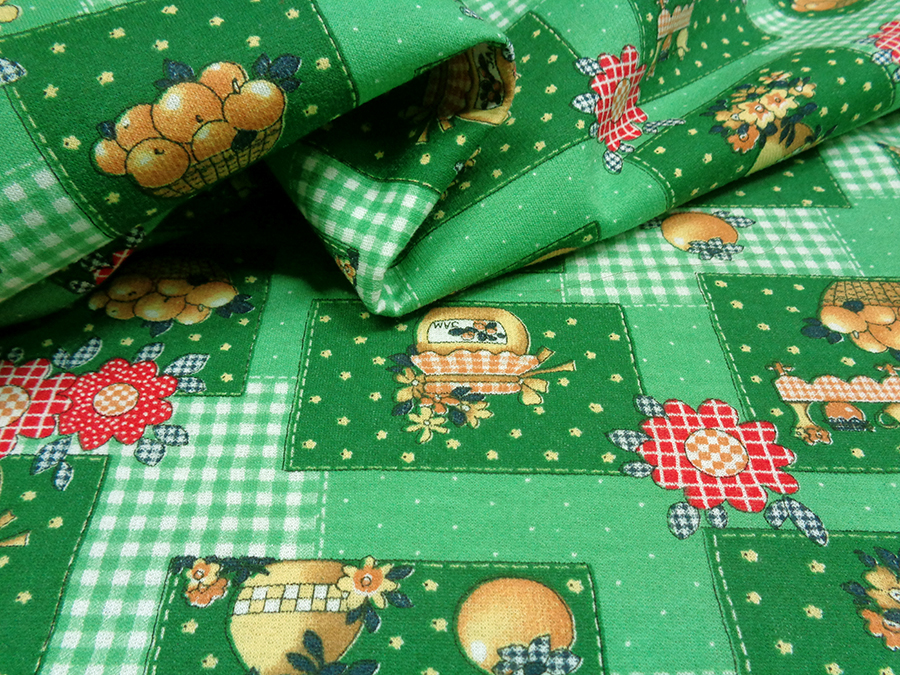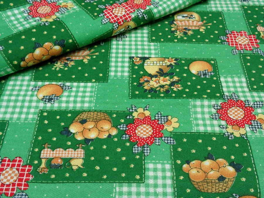 CLASSICA FELPA DI COTONE CON CALDO ROVESCIO GARZATO. FONDO VERDE CON DISEGNI BEIGE E ROSSI.