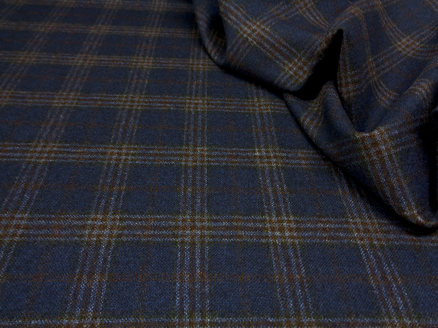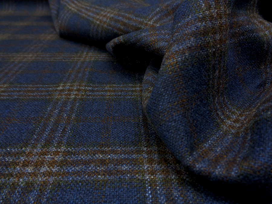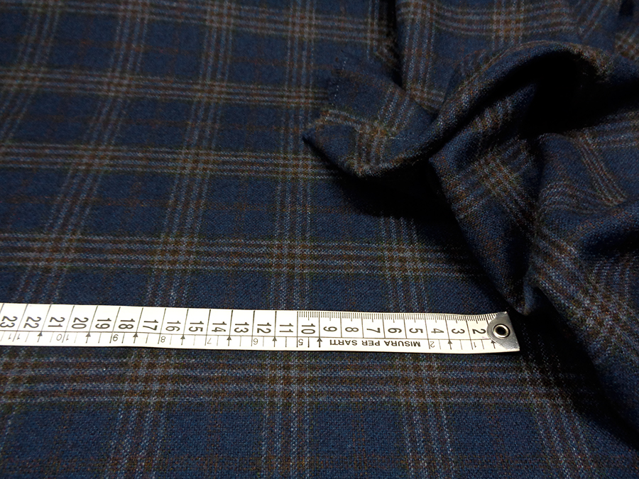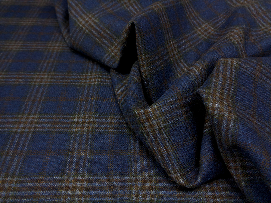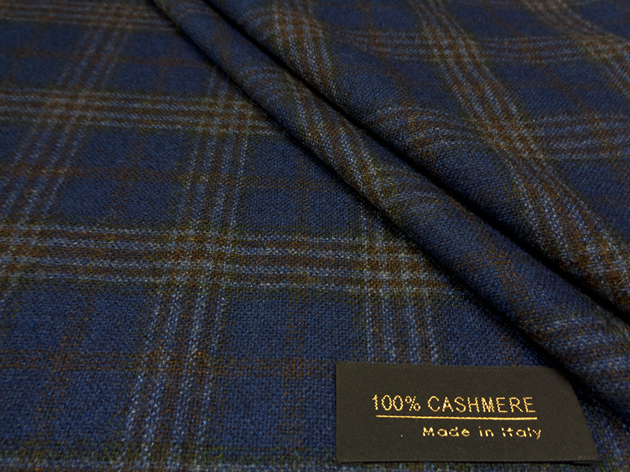 LANIFICIO DI PRAY BIELLA (NO FIRMATO, NO CORREDATO DA ETICHETTE). PREGIATISSIMO ED ESCLUSIVO TESSUTO IN PURO CASHMERE CARDATO, MORBIDISSIMO, LEGGERO, CALDO, SOFFICE ANALLERGICO ED OPACO FONDO BLU CHIARO CON GALLES SUI TONI DEL MARRONE. INDICATO PER: GIACCHE, PANTALONI, ABITI, GILET, VESTAGLIE ECC..