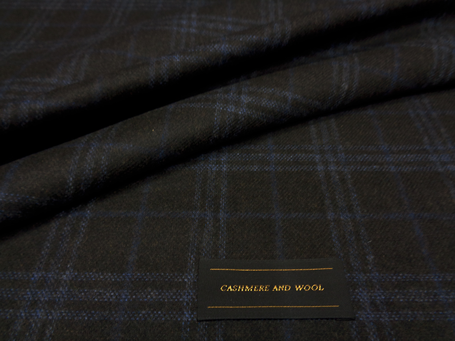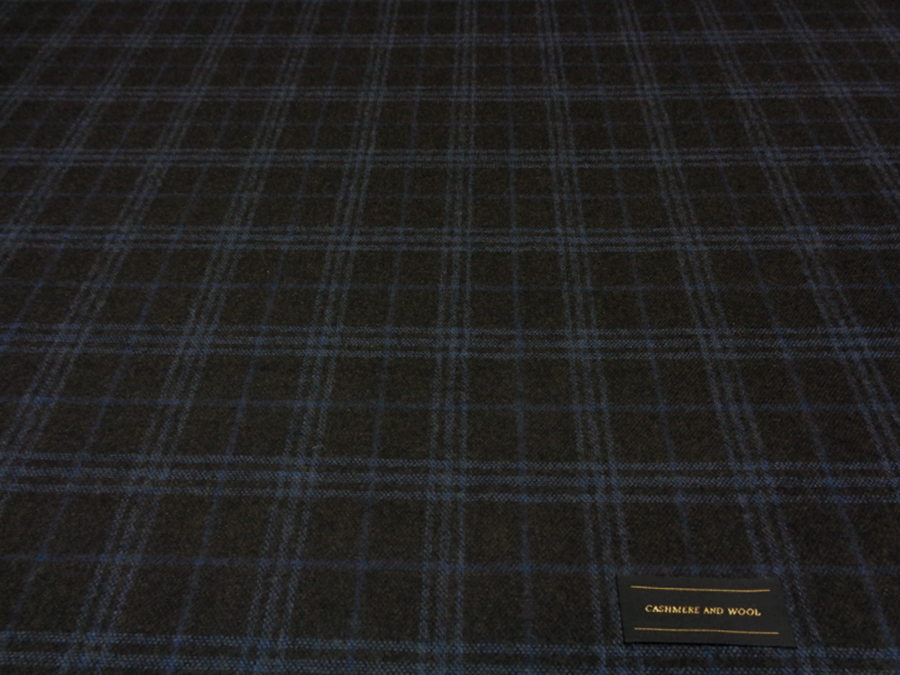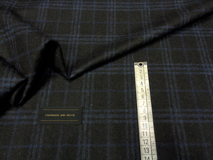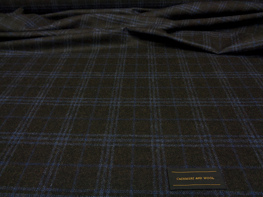 LANIFICIO CERRUTI STOCK (NO CORREDATO DA ETICHETTE) PREGIATO TESSUTO IN CASHMERE E LANA CARDATO, LEGGERO, SOFFICE, CALDO ED OPACO. FONDO MARRONE SCURO CON PRINCIPE DI GALLES SUI TONI DELL’AZZURRO. INDICATO PER: ABITI, GIACCHE, PANTALONI.