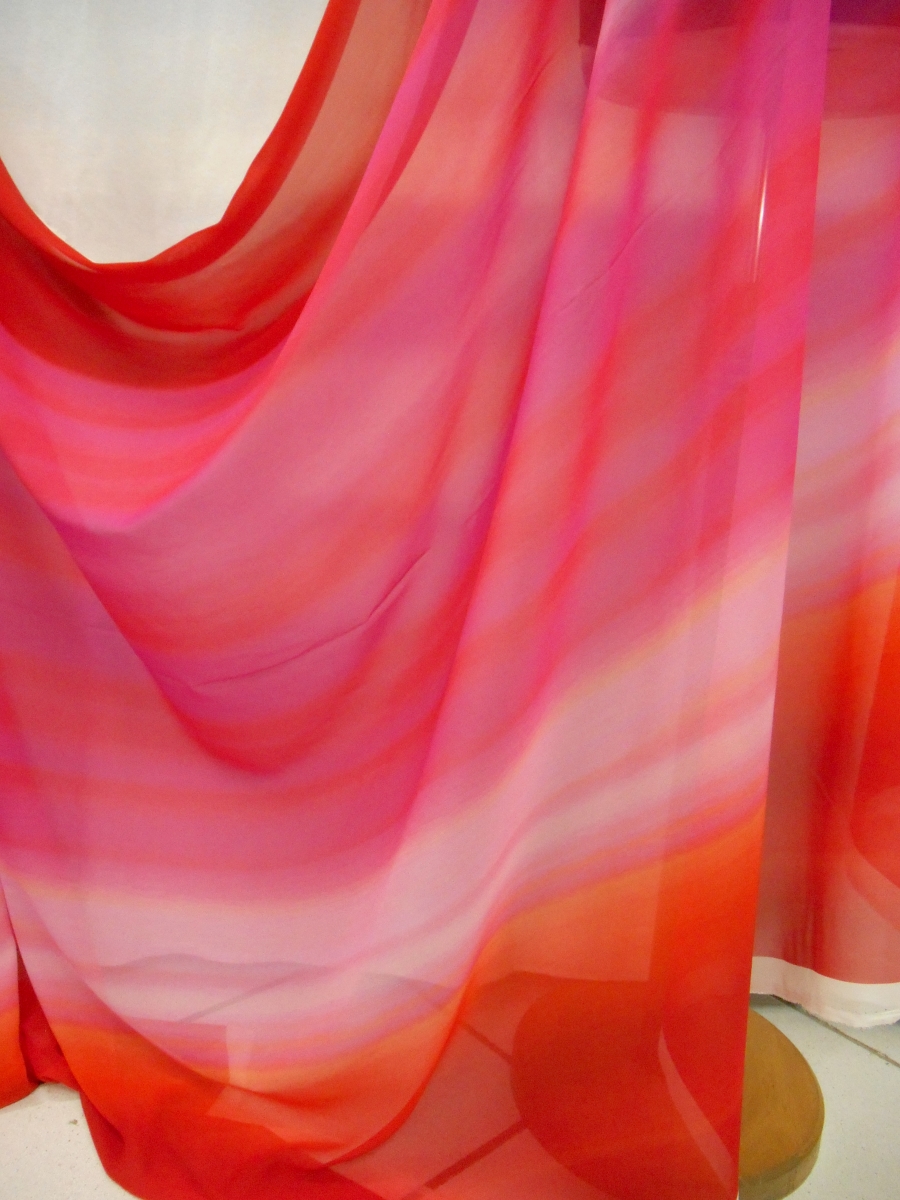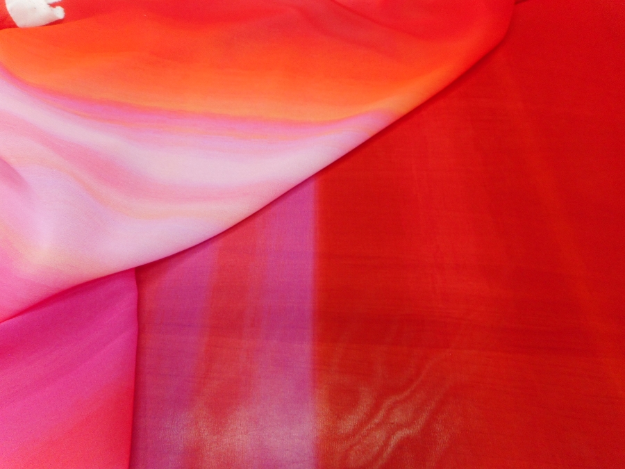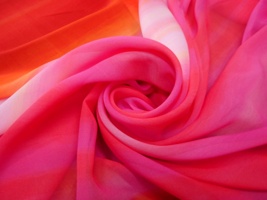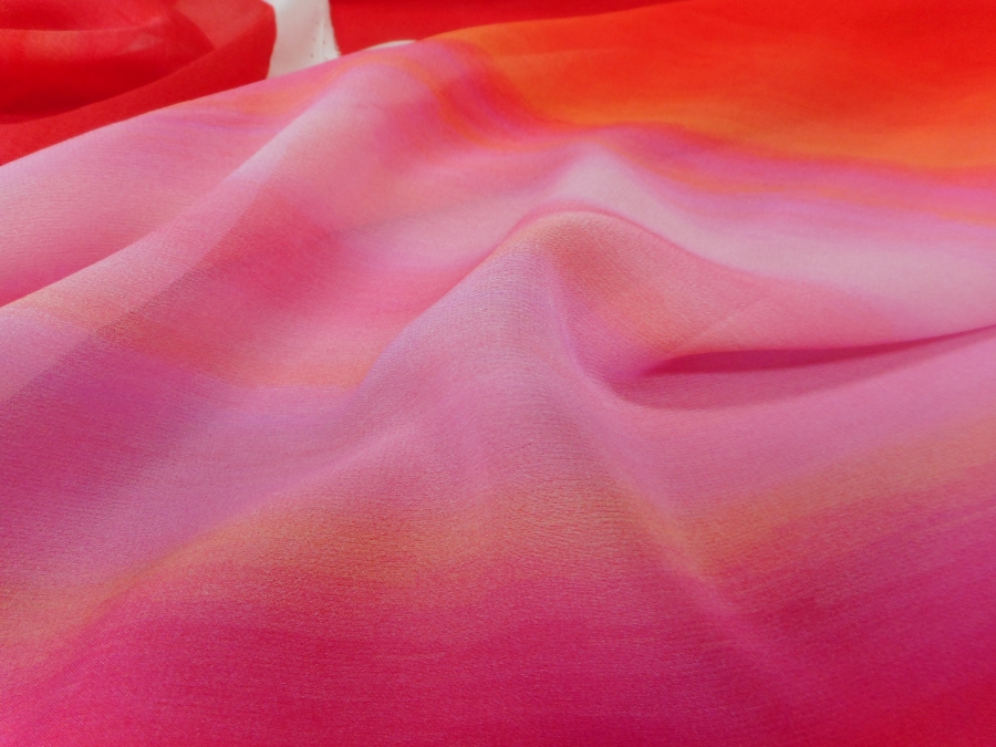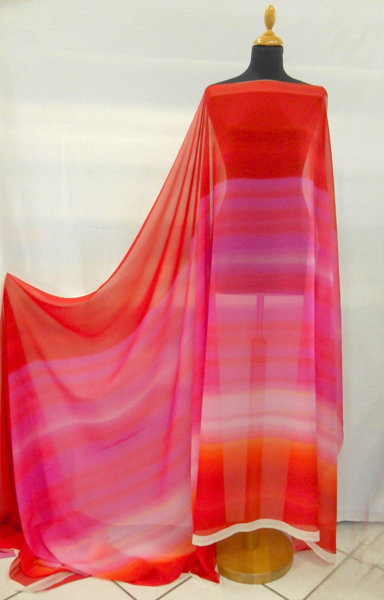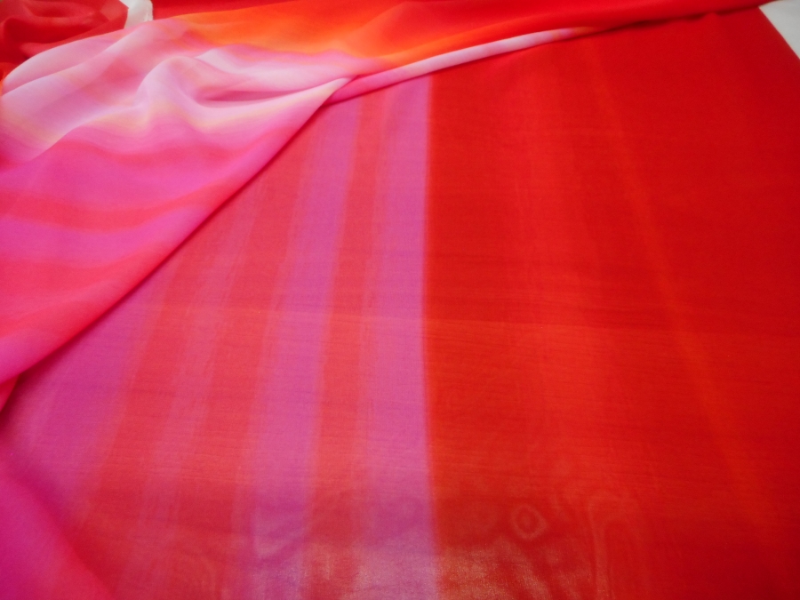 LEGGERA E VELATA GEORGETTE CON EFFETTO DEGRADE’ SUI TONI DEL ROSSO, ARANCIO E ROSA DA CIMOSA A CIMOSA. INDICATO PER: BLUSE, ABITI, GONNE, CAMICETTE. ECC.