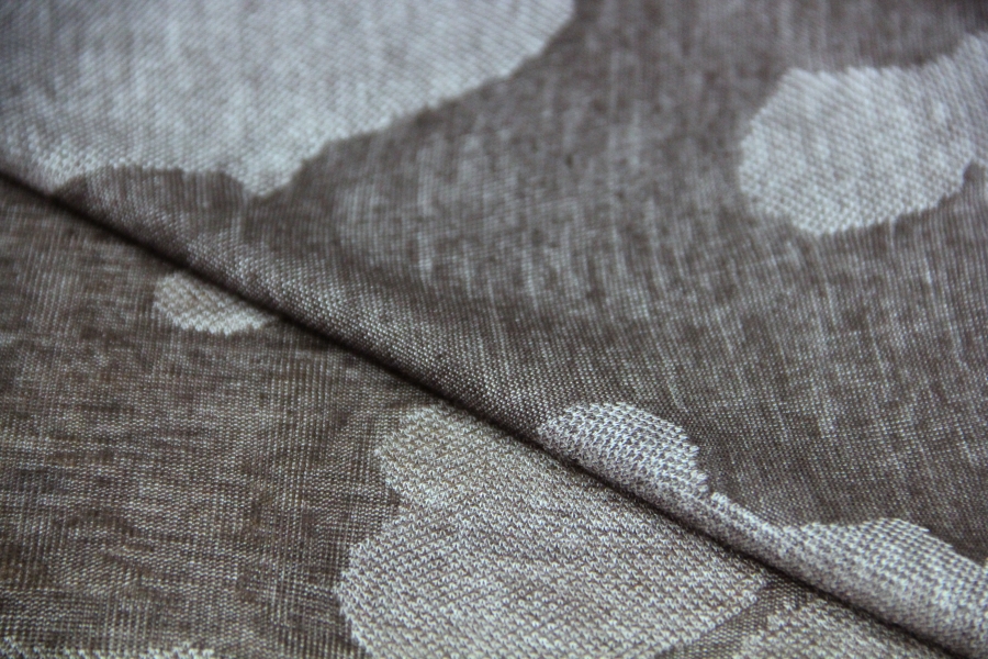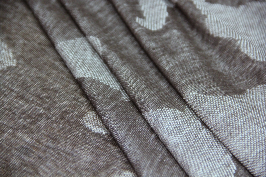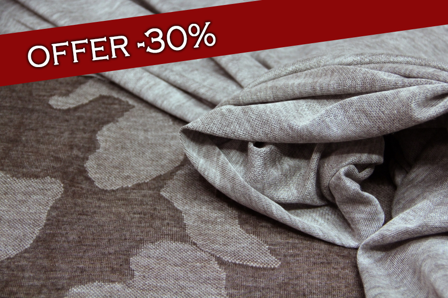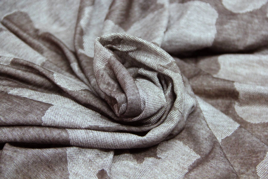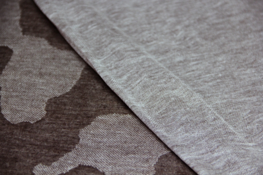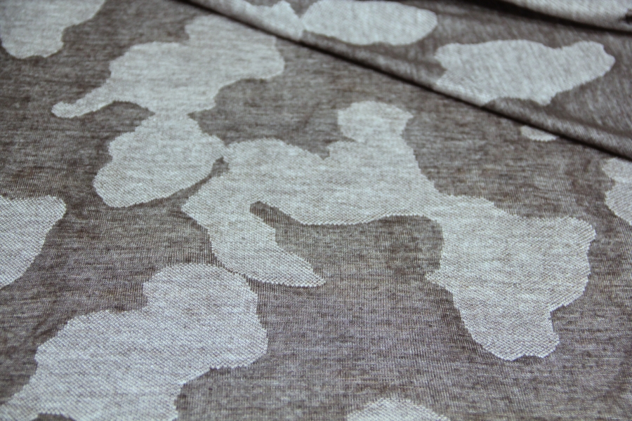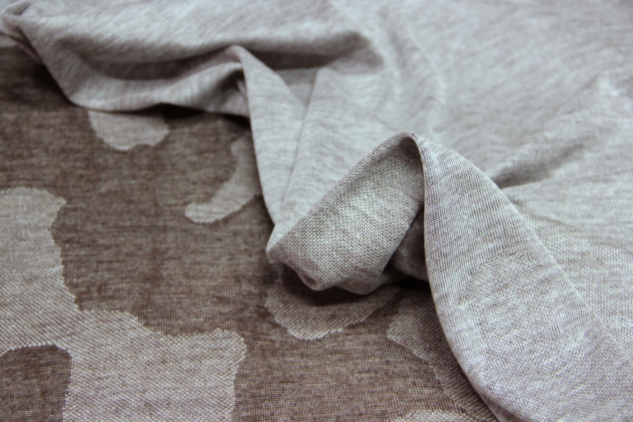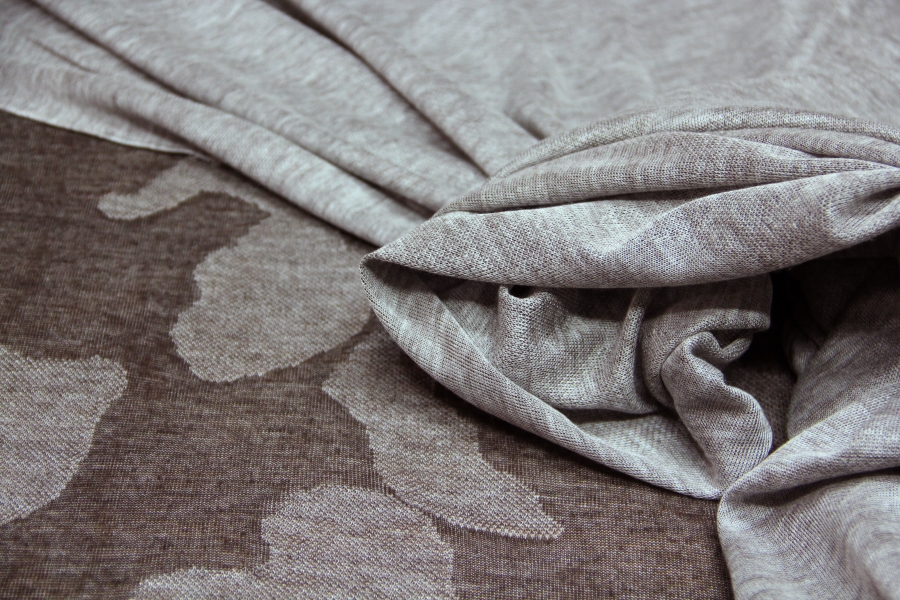 MORBIDISSIMO E LEGGERO E PREGIATO  JERSEY IN CASHMERE E SETA CON DISEGNO EFFETTO MIMETICA STILIZZATA SUI TONI DEL TORTORA E FANGO SCURO. POSSIBILITA’ DI LAVORAZIONE DOUBLEFACE: DA UN LATO FANTASIA, DALL’ALTRO LATO TINTA UNUTA TORTORA MELANGE. INDICATA PER : SCIARPE, CASACCHE, TUNICHE, STOLE, ECC..