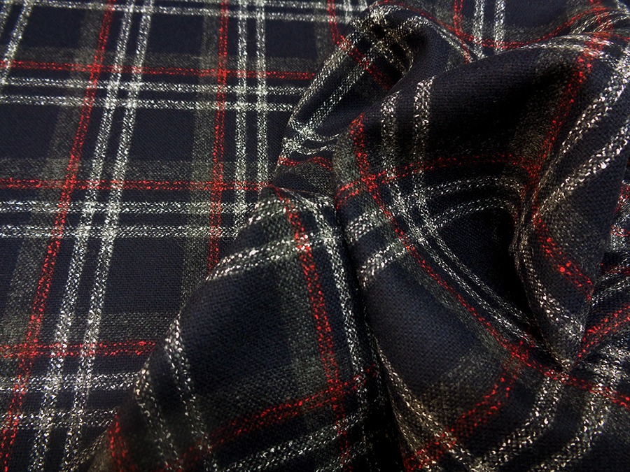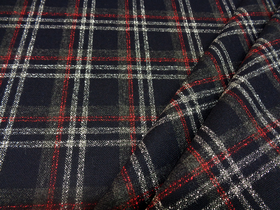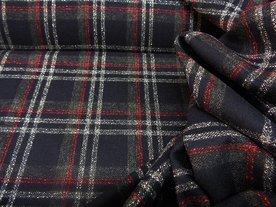 PREGIATO TESSUTO IN LANA CARDATA PESO MEDIO. FONDO BLU CON PARTICOLARE LAVORAZIONE SCOZZESE SUI TONI DEL GRIGIO PERLA, GRIGIO MEDIO E ROSSO RUBINO. TESSUTO UNISEX INDICATO PER: GIACCHE, TAILLEUR, PANTALONI, GONNE, ABITI, SCAMICIATI, ECC..