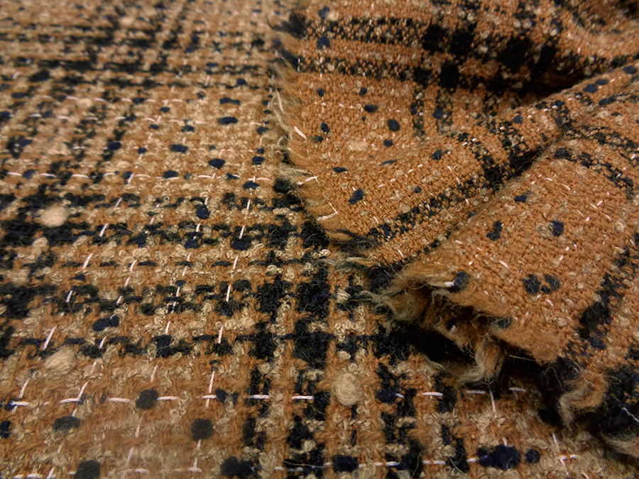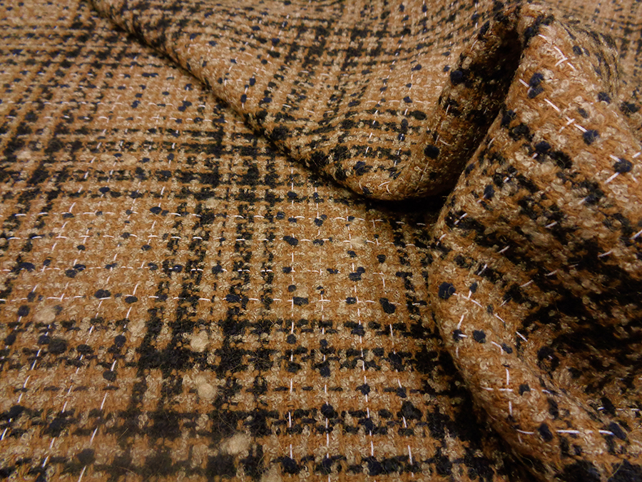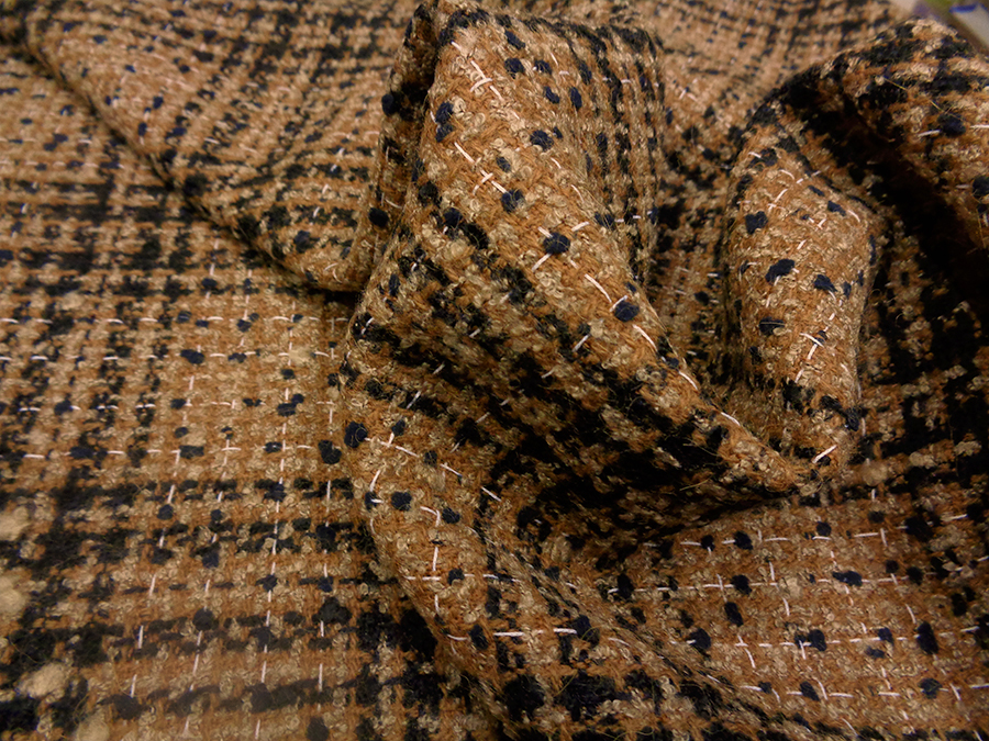 PREGIATO ED ESCLUSIVO TESSUTO TRAMATO ,PESO MEDIO, MORBIDO E SOFFICE IN LANA E MOHAIR . FONDO TABACCO CON PARTICOLARE LAVORAZIONE AD INTRECCIO A FORMARE GRANDI RIQUADRI NERI. INDICATO PER: GIACCHE, TAILLEUR, GONNE, ABITI, SOPRABITI, ECC..