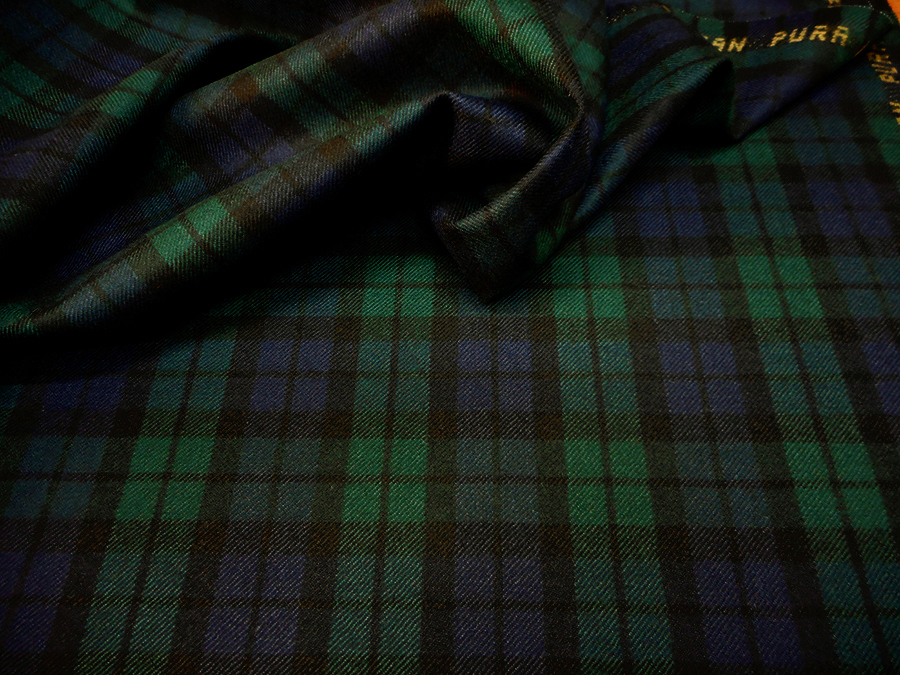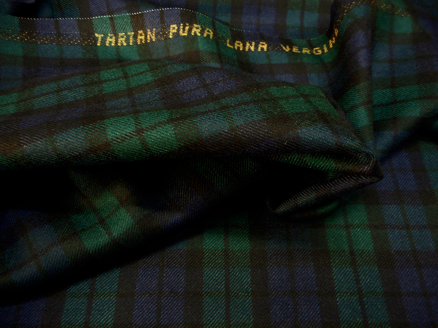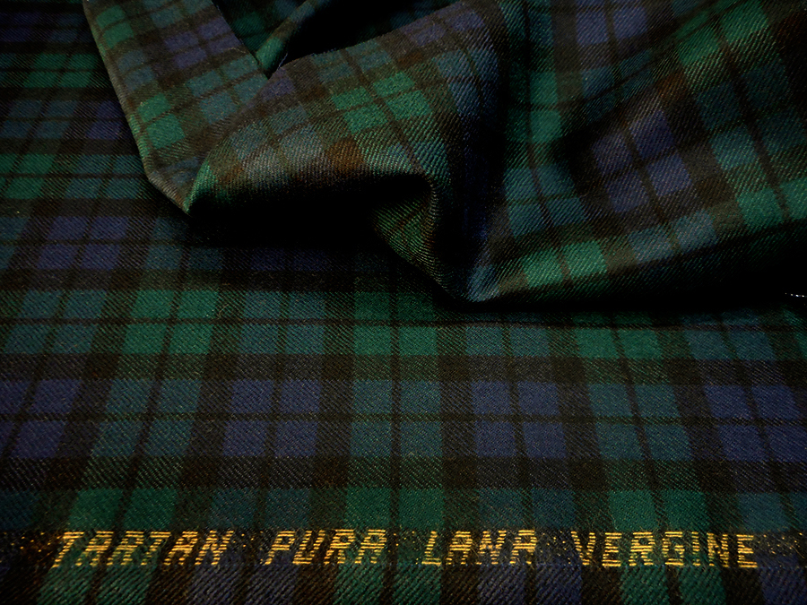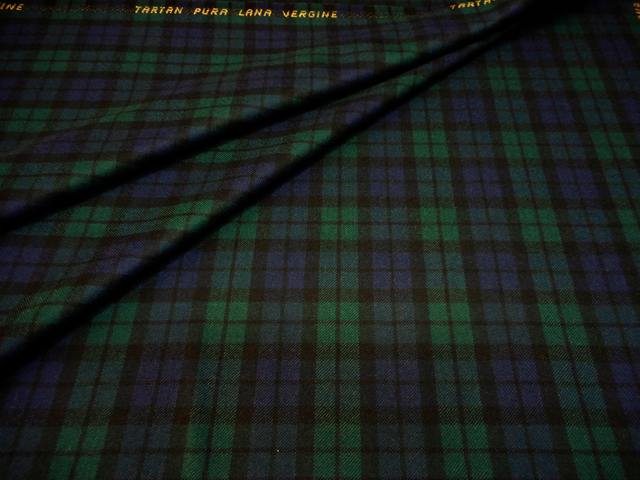 PREGIATO E CLASSICO TARTAN IN PURA LANA VERGINE MADE IN ITALY SUI TONI DEL BLU, VERDE E NERO. TESSUTO UNISEX INDICATO PER: GIACCHE, GONNE, PANTALONI, ECC..