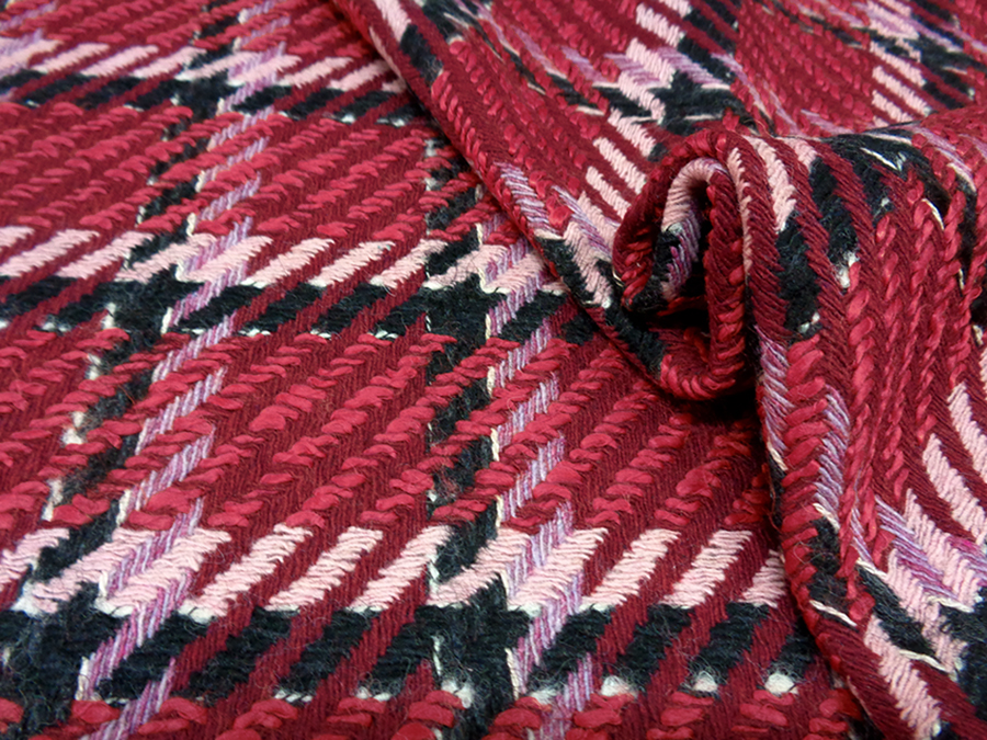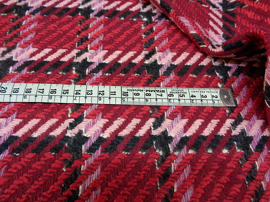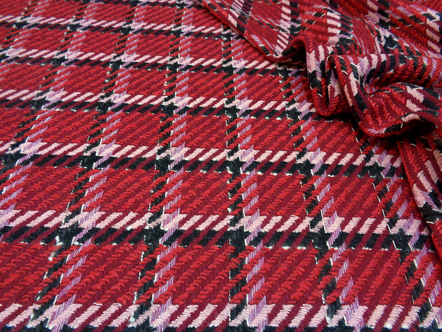 PREGIATO ED ESCLUSIVO TESSUTO TWEED TRAMA CHANEL, COMPATTO, CORPOSO E CONSISTENTE. FONDO RUBINO CON PARTICOLARE LAVORAZIONE AD INTRECCIO A FORMARE GRANDI RIQUADRI NERI, ROSSI E ROSA. INDICATO PER: CAPPOTTI, GIACCHE, TAILLEUR, GONNE, ABITI, SOPRABITI, ECC..