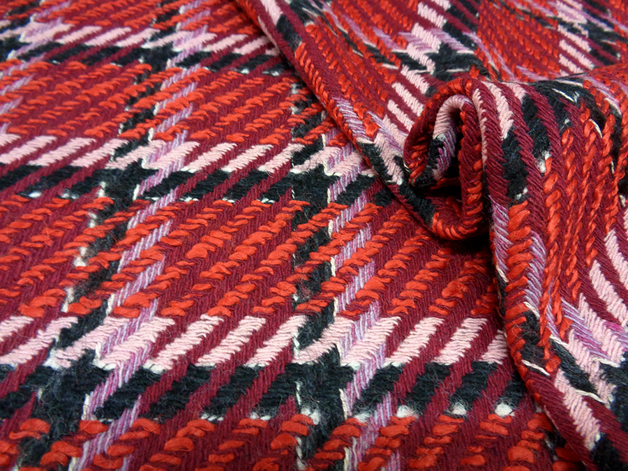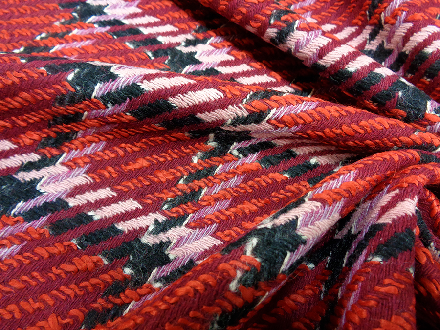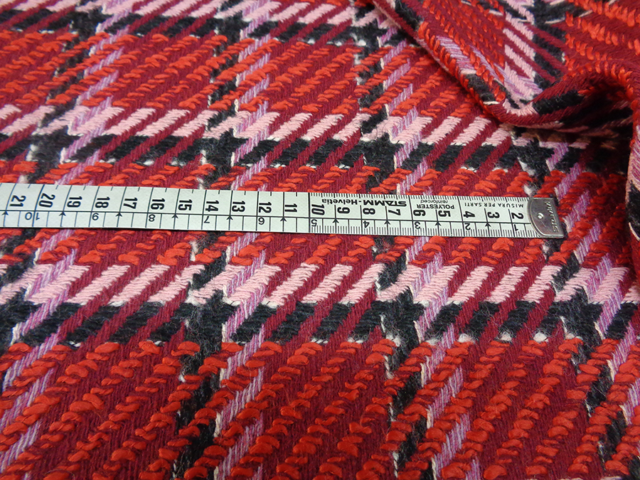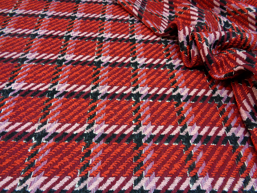 PREGIATO ED ESCLUSIVO TESSUTO TWEED TRAMA CHANEL, COMPATTO, CORPOSO E CONSISTENT. FONDO BORDEAUX CON PARTICOLARE LAVORAZIONE AD INTRECCIO A FORMARE GRANDI RIQUADRI NERI E ROSA. INDICATO PER: CAPPOTTI, GIACCHE, TAILLEUR, GONNE, ABITI, SOPRABITI, ECC
