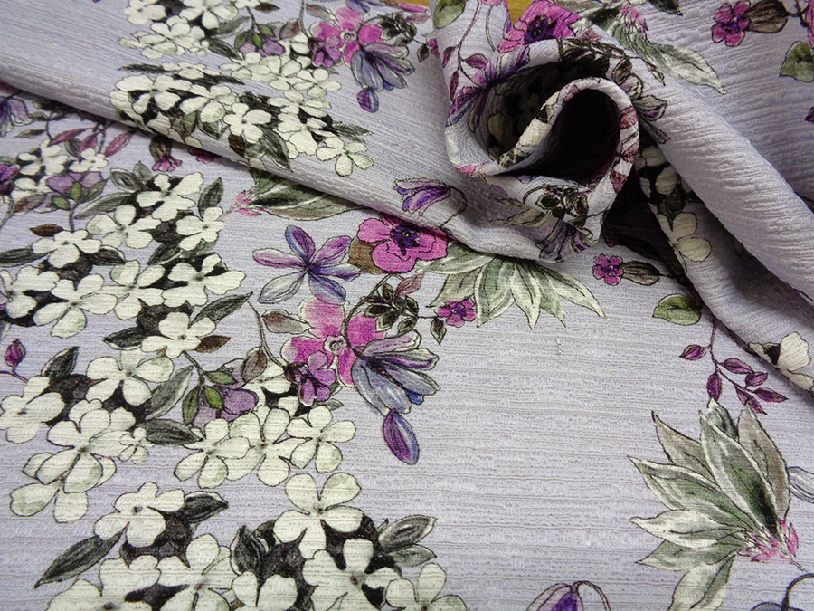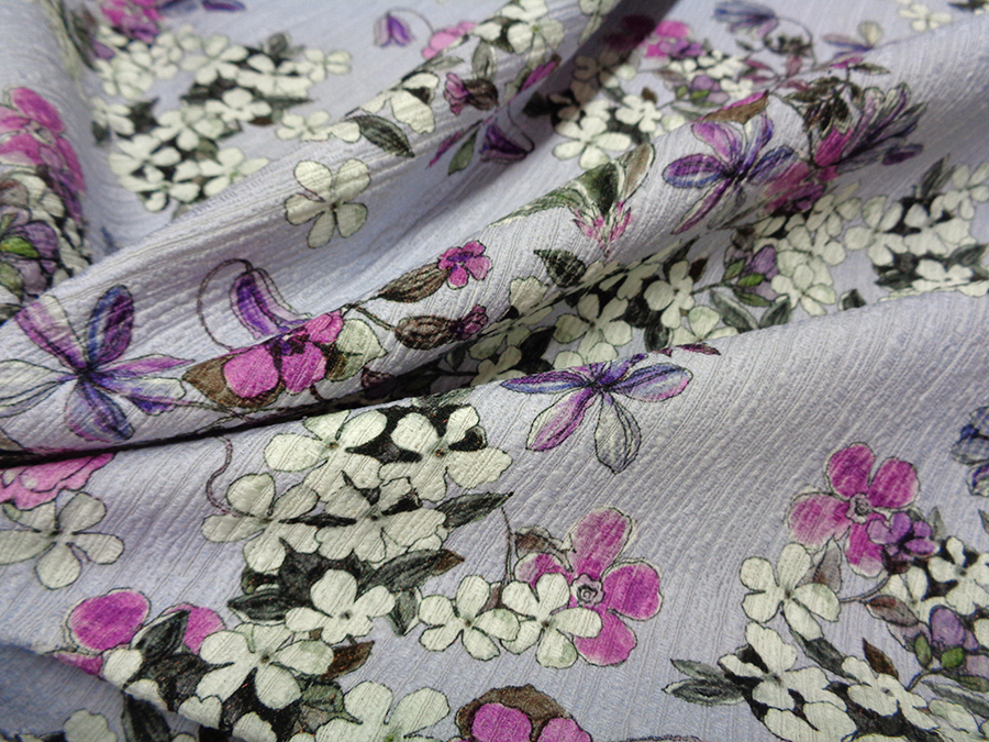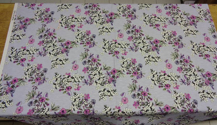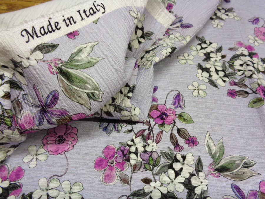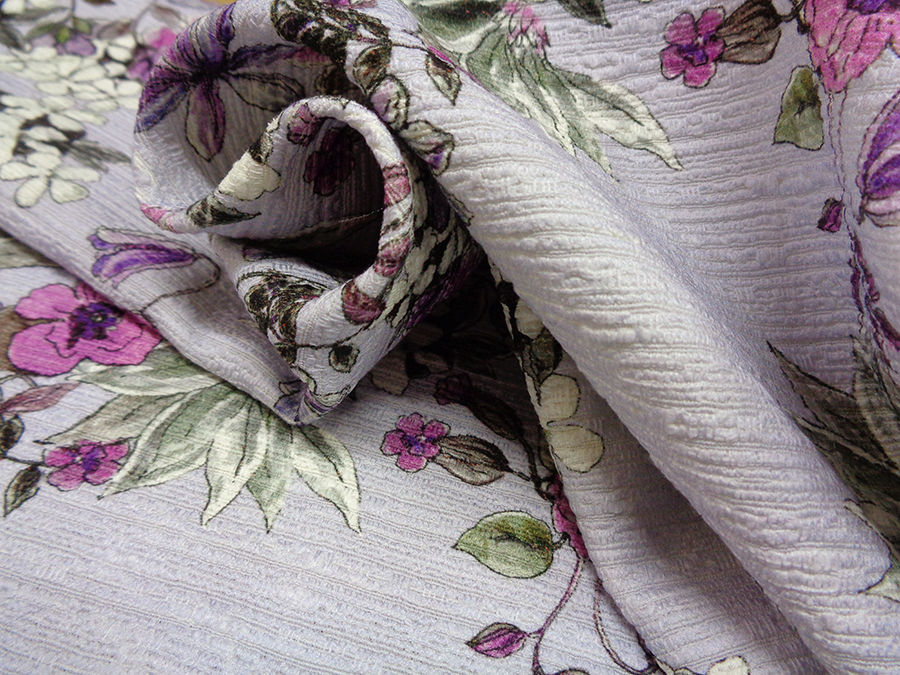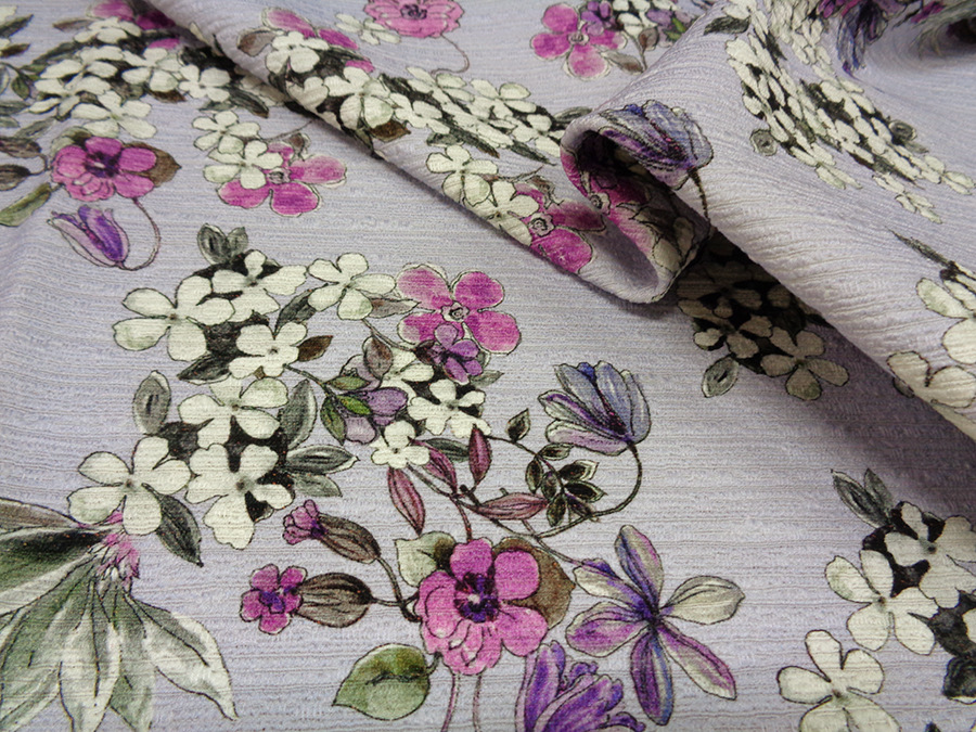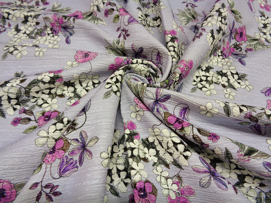 PREGIATO ED ESCLUSIVO MATLASSE’ ALTA MODA. CORPOSO, COMPATTO ED OPACO CON PARTICOLARE TRAMA FIAMMATA IN RILEVO TINTA SU TINTA. FONDO LILLA CON FANTASIA FLOREALE SUI TONI DEL CICLAMINO, LILLA E BIANCO. INDICATO PER: GIACCHE, GONNE, ABITI, COMPLETI, PANTALONI, ECC..