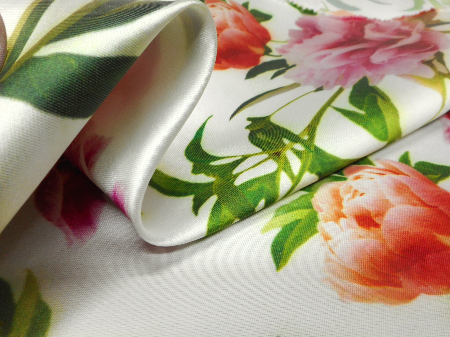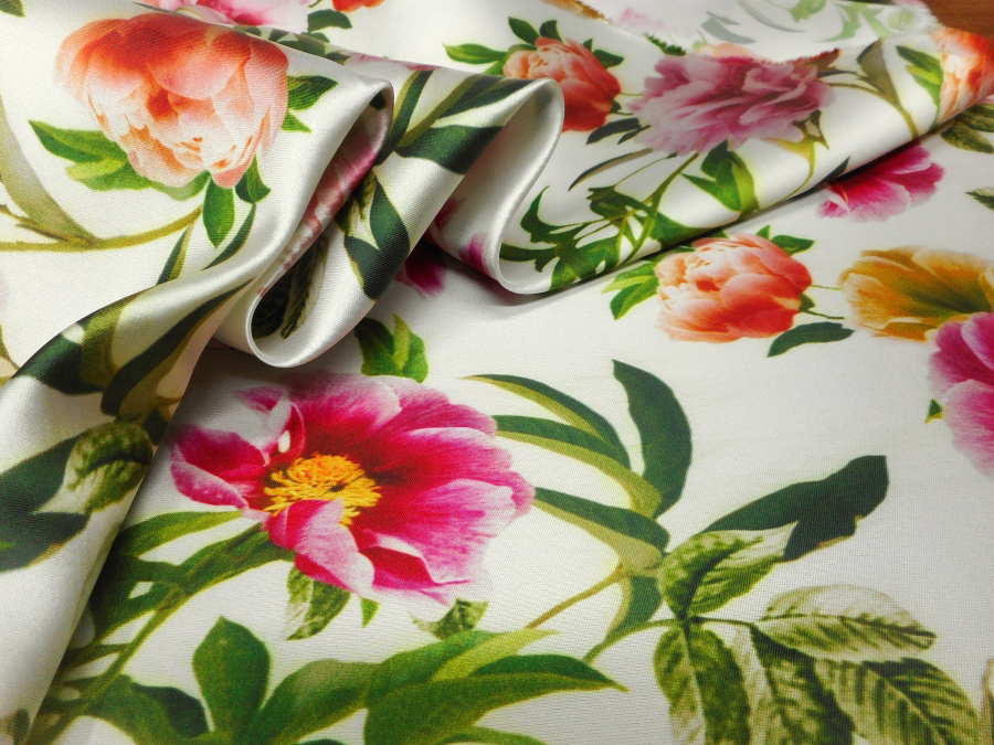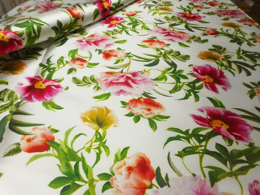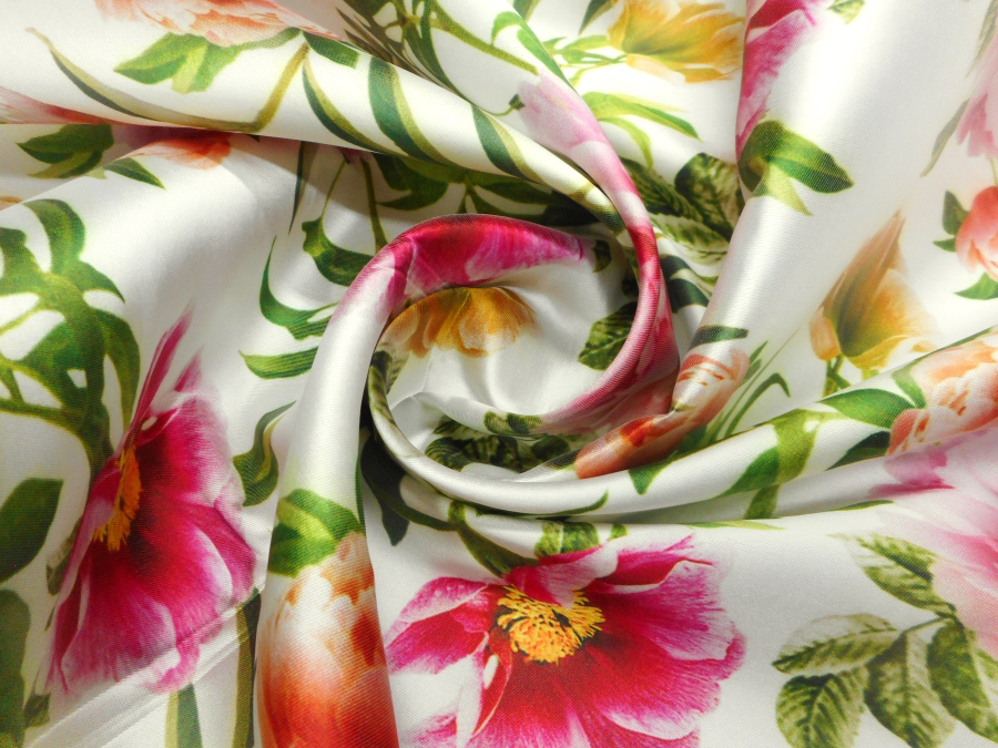 PREGIATO ED ESCLUSIVO MIKADO CORPOSO E CONSISTENTE, FONDO BIANCO CON FANTASIA FLOREALE SUI TONI DEL FUCSIA, ROSA E VERDE. INDICATO PER: GIACCHE, ABITI, GONNE, SPOLVERINI, PANTALONI, ECC..