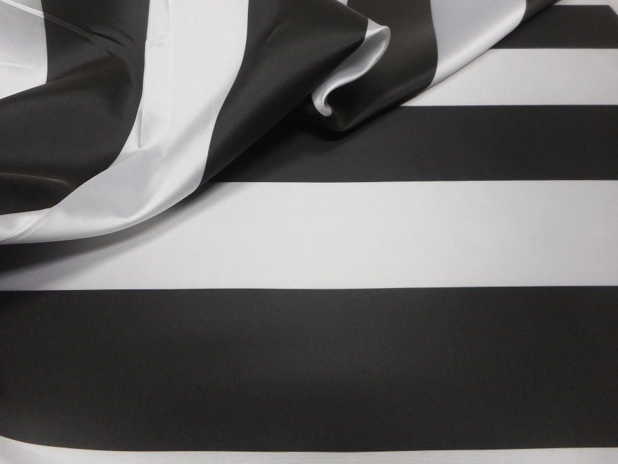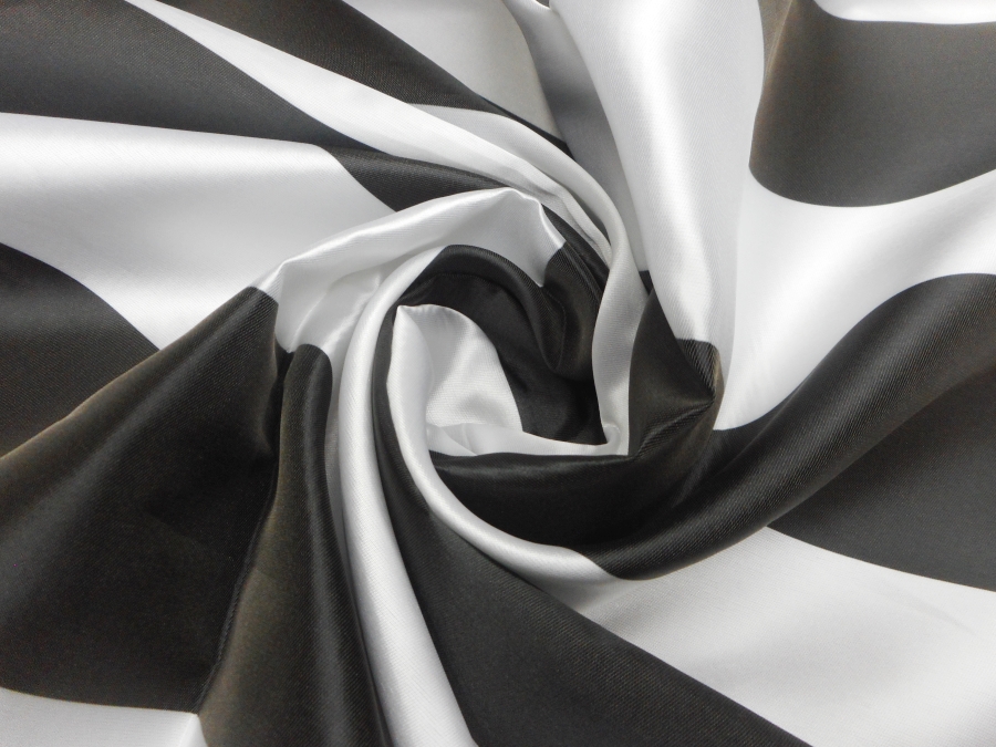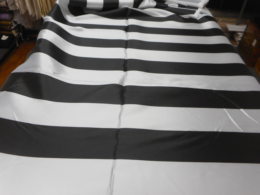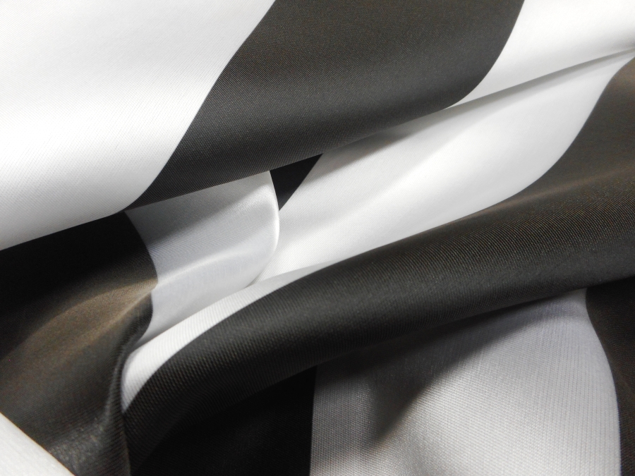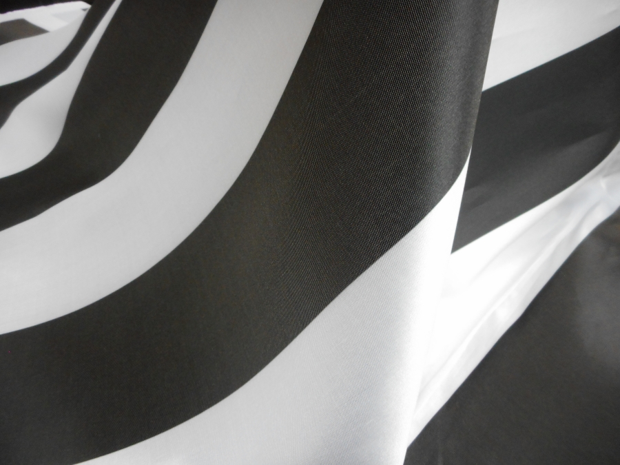 PREGIATO MIKADO IN SETA , PESO MEDIO, SEMIRIGIDO,CON GRANDI FASCE BIANCHE E NERE OPACHE. DISEGNO IMPOSTATO IN ORIZZONTALE, MA POSSIBILITA’ DI LAVORAZIONE ANCHE IN VERTICALE. INDICATO PER: GONNE, GIACCHE, CASACCHE, PANTALONI, ECC