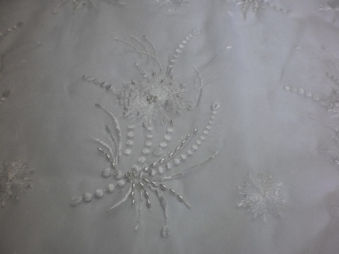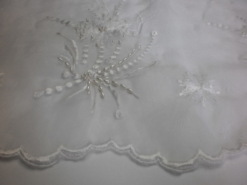 ORGANZA RICAMATA BOR 402 V. BIANCO : € 52,00/MT ORGANZA 100% POLIESTERE – RICAMATA A MANO CON PERLINE – FINITURA CON 2 FESTONI UGUALI -H 140 – COLORE BIANCO INDICATA PER : ABITA DA COMUNIONE, BATTESIMO, CORPETTI, VELI, CULLE, ECC