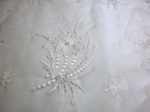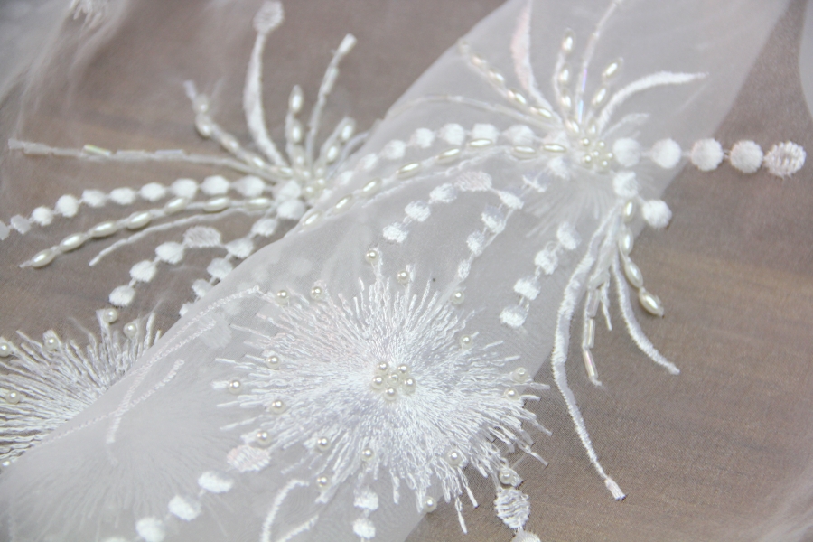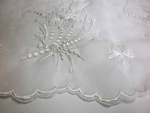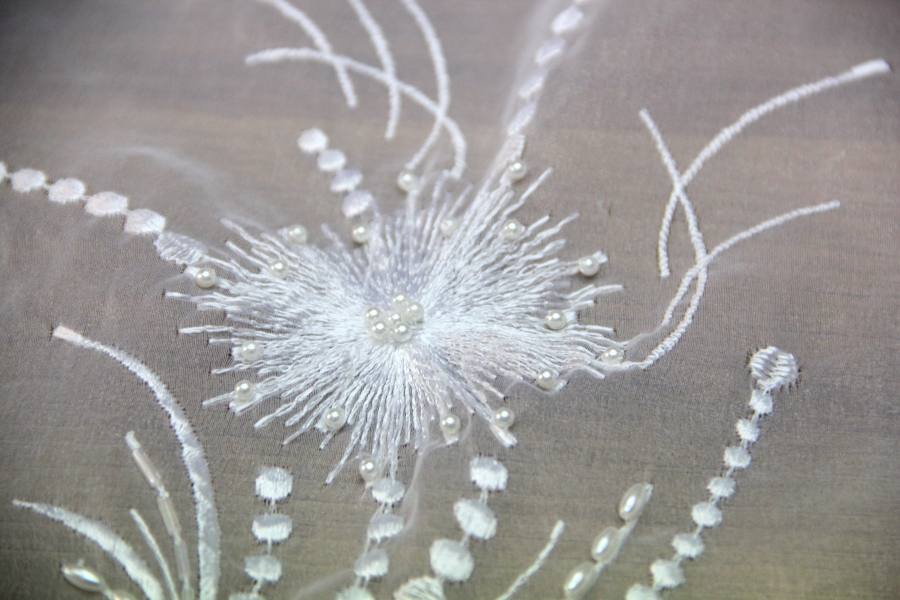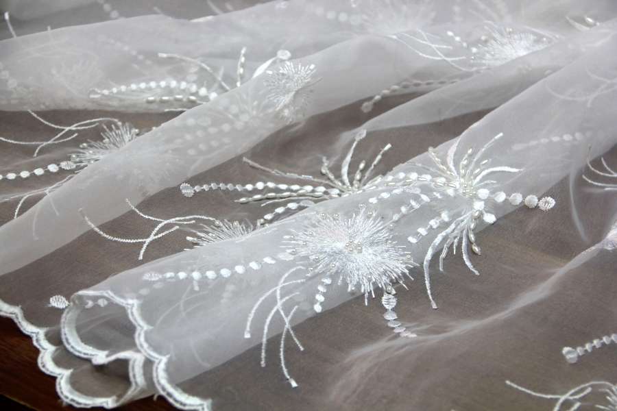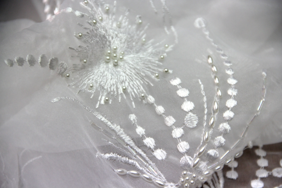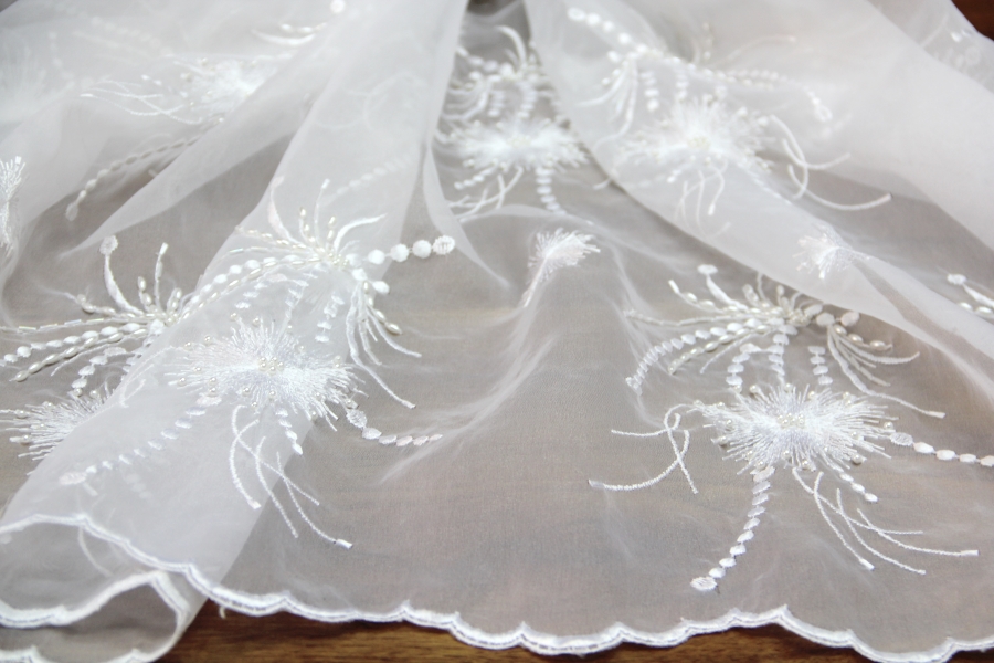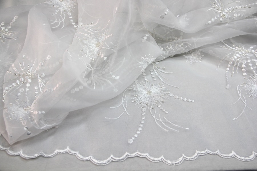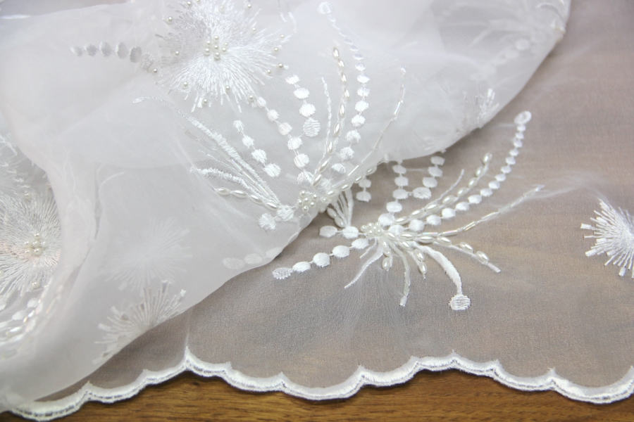 ORGANZA RICAMATA CHICCHI DI RISO ART. BOR 402 V. BIANCO OTTICO : € 52,00/MT . ORGANZA 100% POLIESTERE – RICAMATA A MANO CON PERLINE E CHICCHI DI RISO – FINITURA CON 2 FESTONI UGUALI -H 140 – COLORE BIANCO. INDICATA PER : SPOSA, ABITA DA COMUNIONE, BATTESIMO, CORPETTI, VELI, CULLE, ECC.