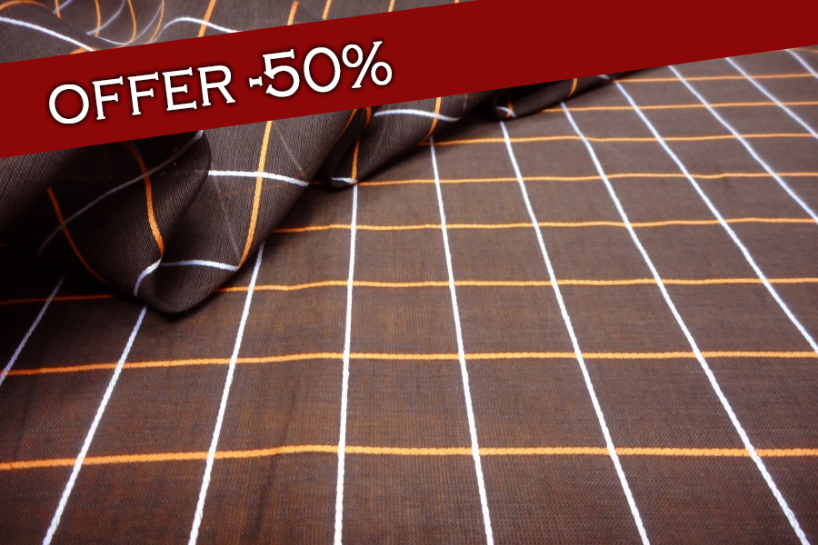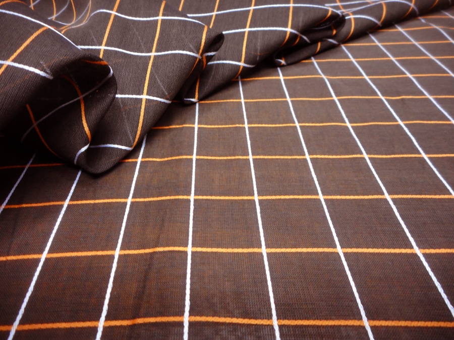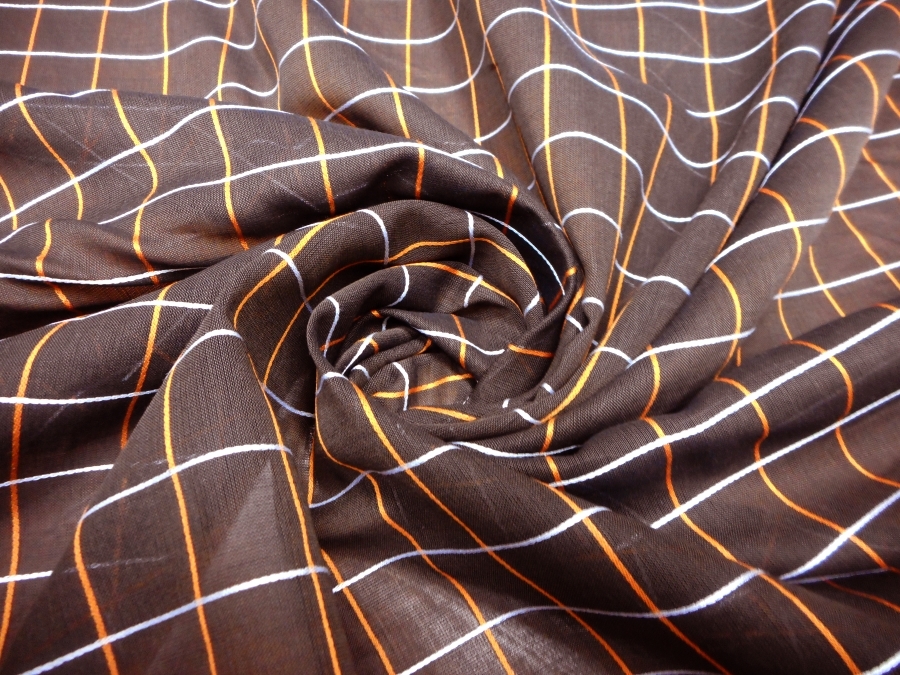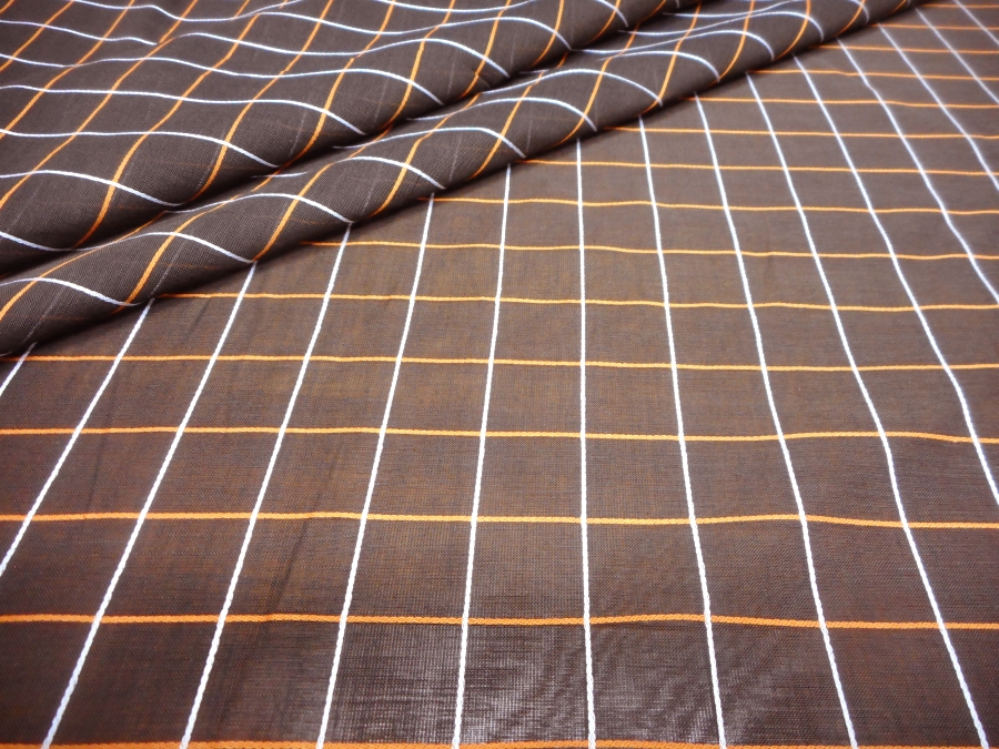 VERY LIGHT COTTON ORGANDY WITH OPEN WEFT AND SLIGHTLY STEAMY. FABRIC IN BROWN COLOUR WITH OVERCHECK CORD SILK EFFECT IN ORANGE AND WHITE. SUITABLE FOR: SHIRTS AND TUNICS.