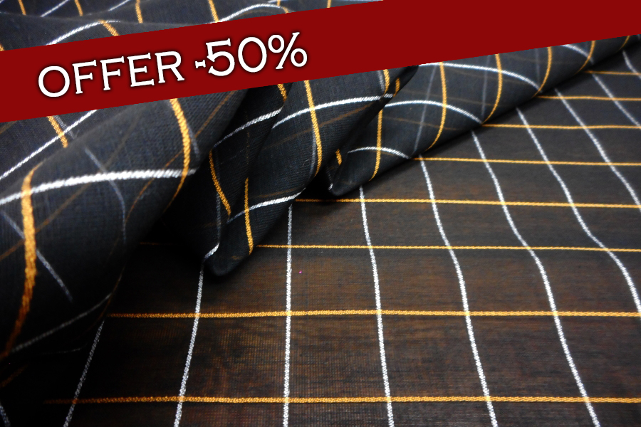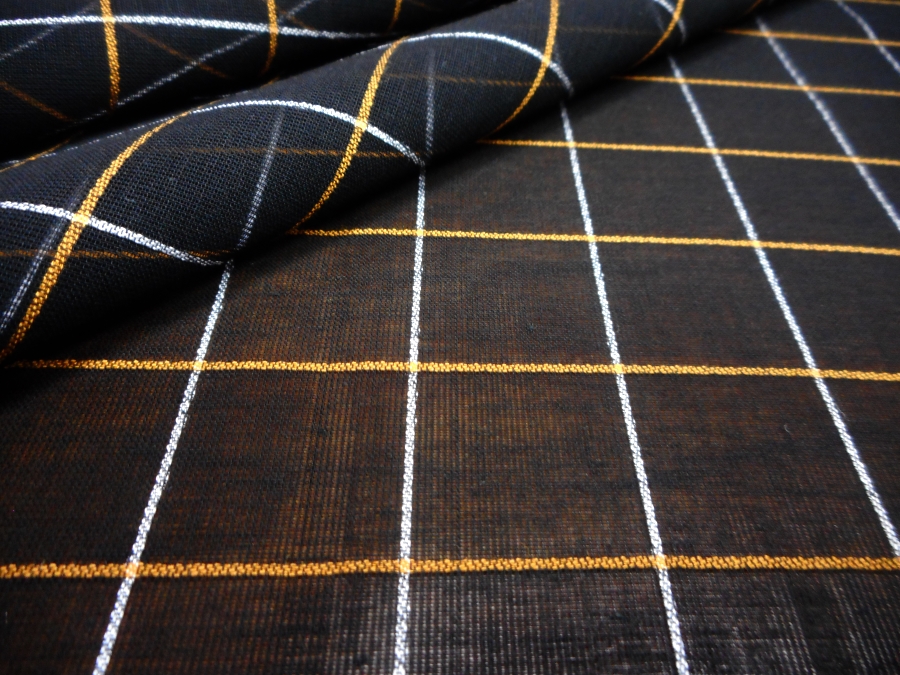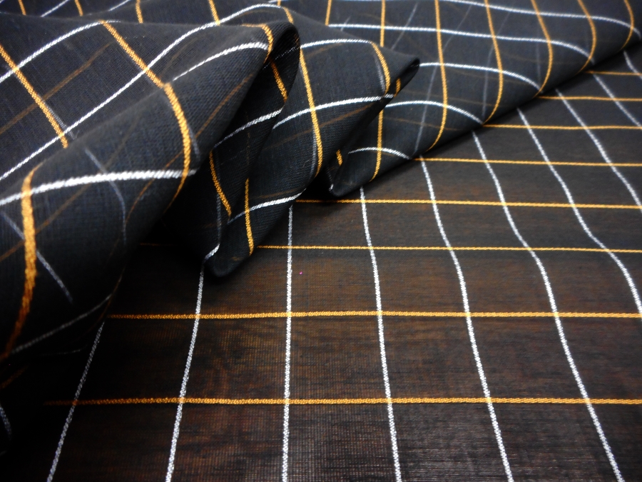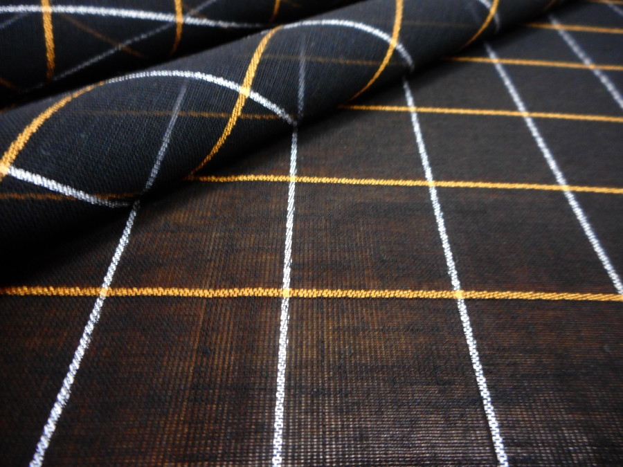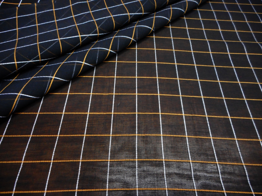 LEGGERISSIMO ORGANZINO DI COTONE CON TRAMA RADA, LEGGERMENTE VAPOROSO. FONDO NERO CON CORDONCINO FINESTRATO EFFETTO SETA OCRA E BIANCO. INDICATO PER: CAMICIE E CASACCHE.