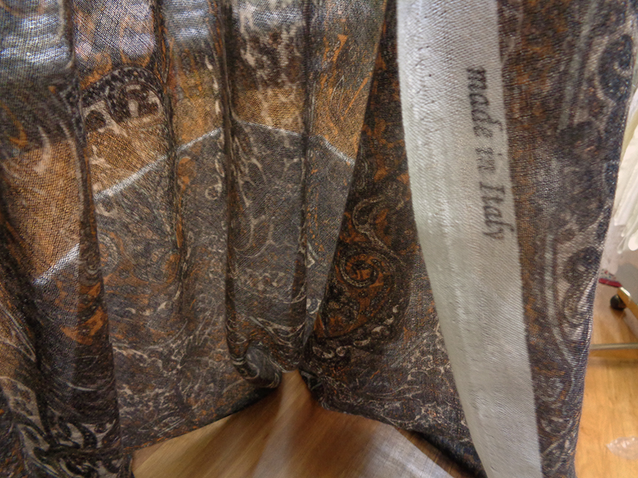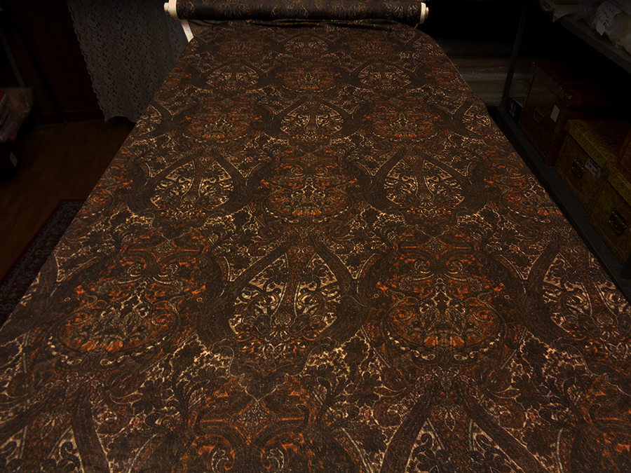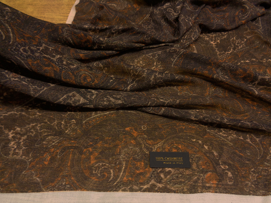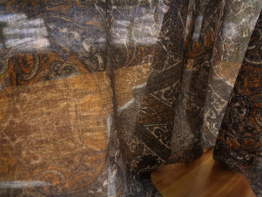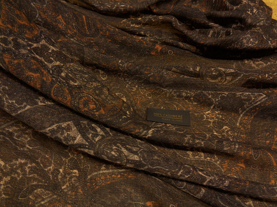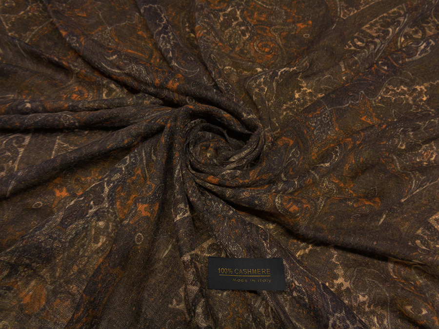 VERY FINE, RARE AND EXCLUSIVE FABRIC IN PASHMINA. VERY LIGHT, SOFT AND IMPALPABLE WITH PASLEY DESIGN IN BROWN, ROPE AND PUMPKIN COLOURS.