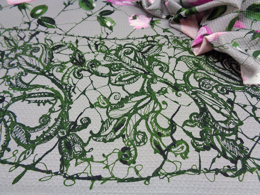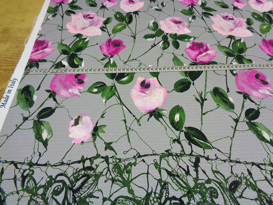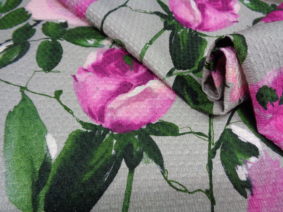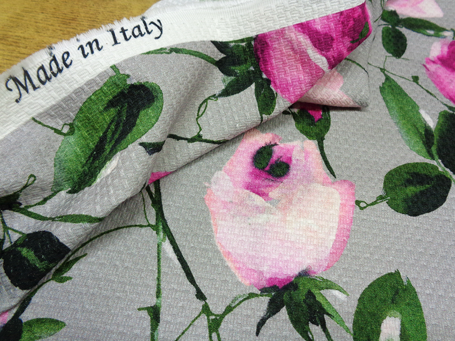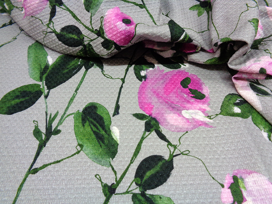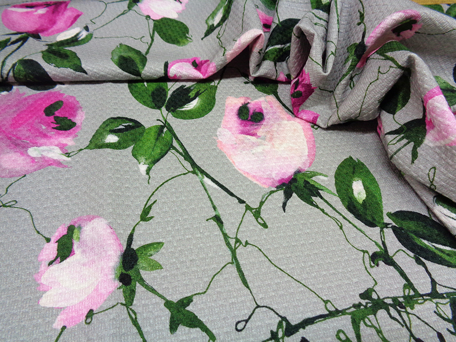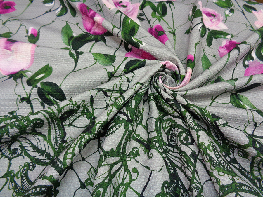 PREGIATO ED ESCLUSIVO PIQUET NIDO D’APE IN PURO COTONE. PESO MEDIO, FONDO GRIGIO CON FANTASIA FLOREALE DEGRADE’ SUI TONI DEL FUCSIA, ROSA E VERDE. BORDO FINALE DI CM 30 COLORE VERDE BOTTIGLIA. INDICATO PER: ABITI, GONNE GIACCHE, PANTALONI, GIUBBOTTI, COMPLETI, ECC..