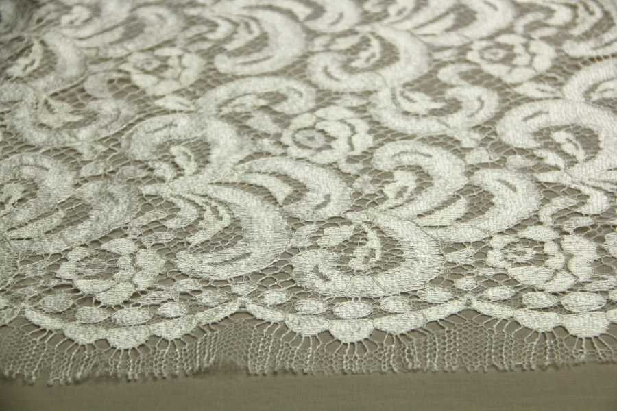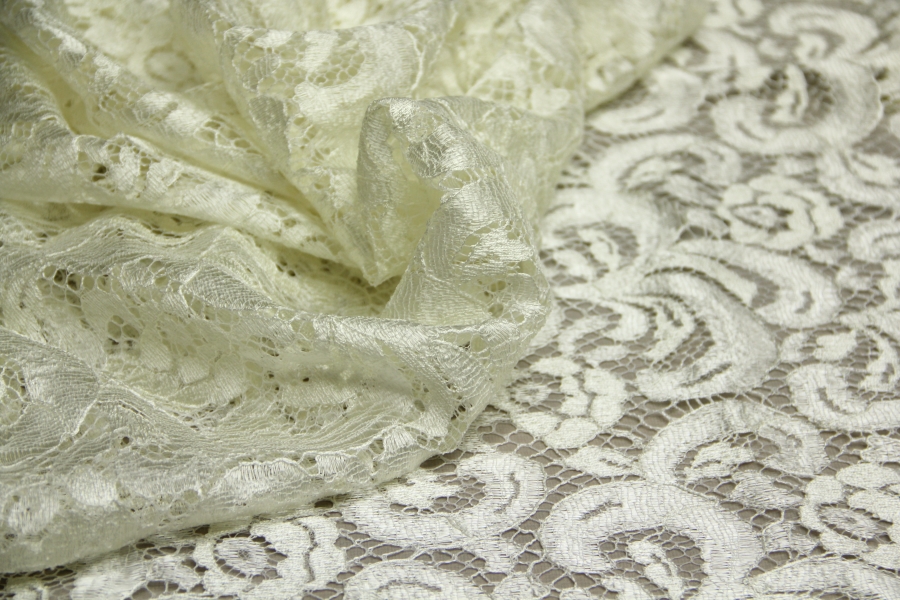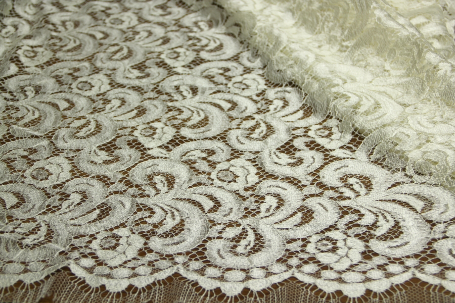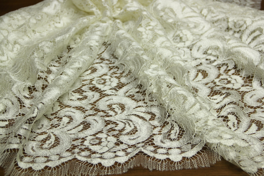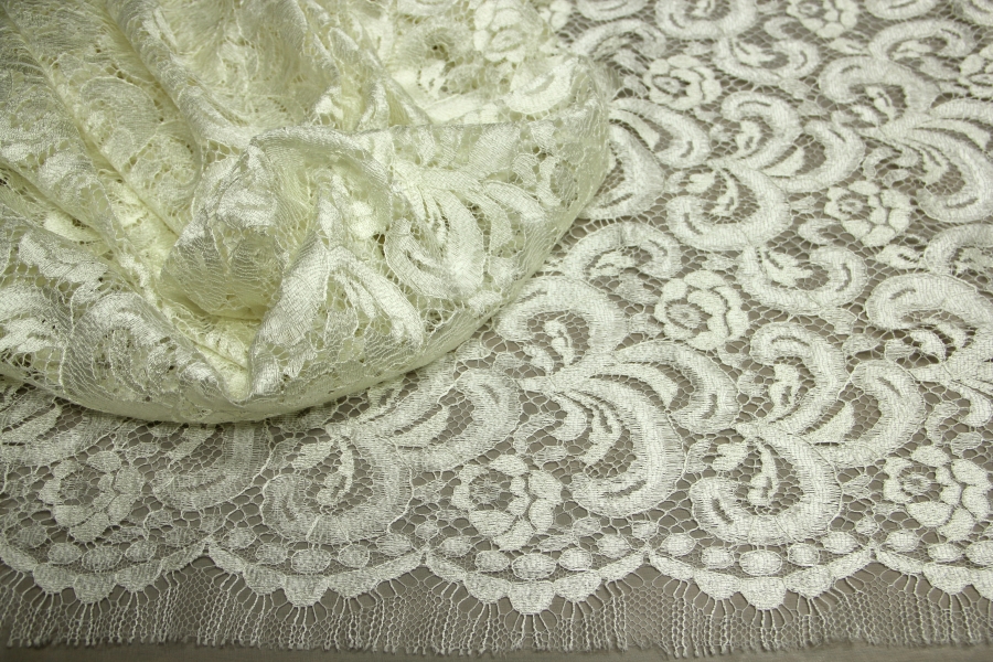 ART.PI CHANTILLY DELIZIA V. AVORIO € 90,00 AL MT TAGLO UNICO MT 2,50 H 140 100% VISCOSA . PREGIATO PIZZO FRANCESE CON DISEGNO STILIZZATO, MORBIDISSIMO E LUMINOSO, RIFINITO CON 2 FESTONI UGUALI DA AMBI I LATI .