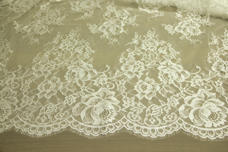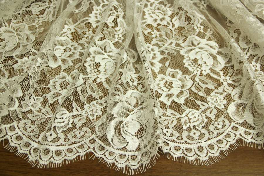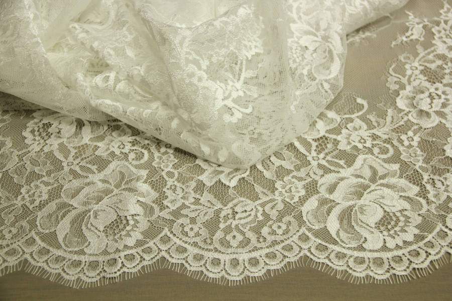 RIFINITO CON 2 FESTONI UGUALI DA AMBO I LATI. PIZZO LEGGERO E MORBIDO, LEGGERMENTE LUMINOSO. INDICATO PER: ABITI SPOSA, CORPETTI, STRASCICHI, VELI, ECC.