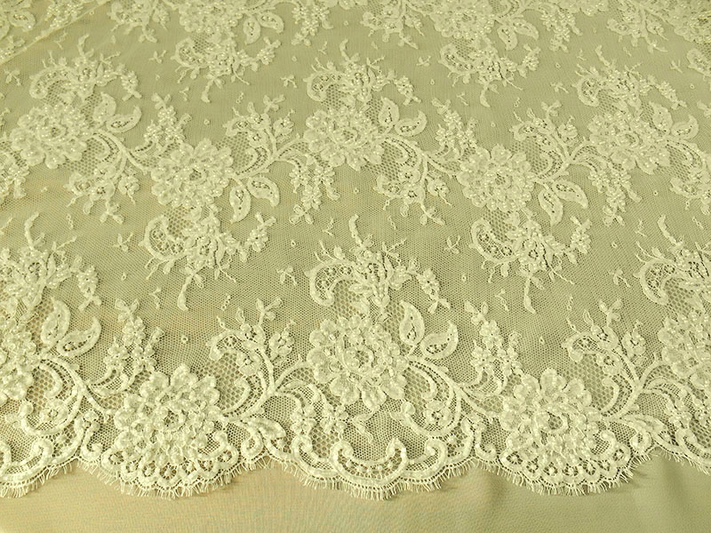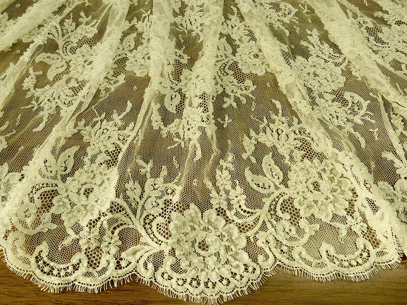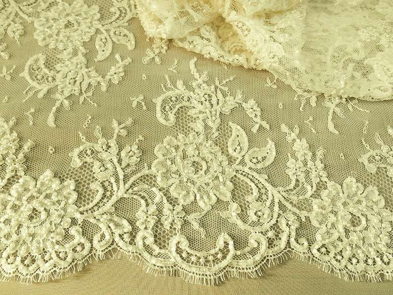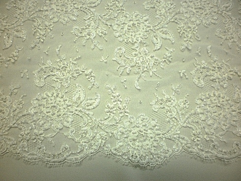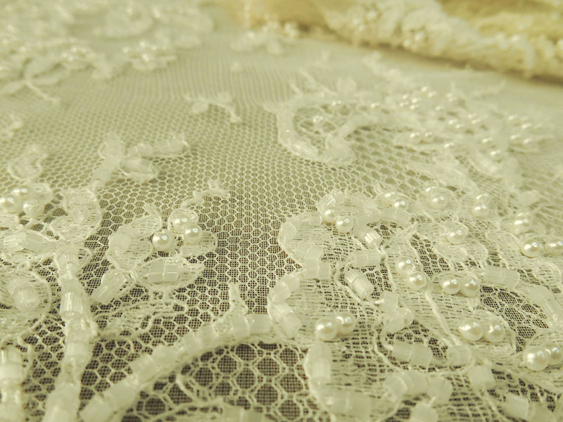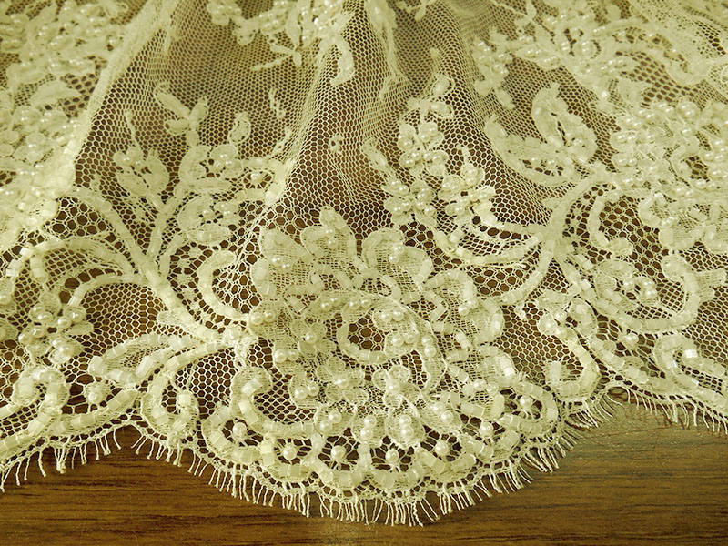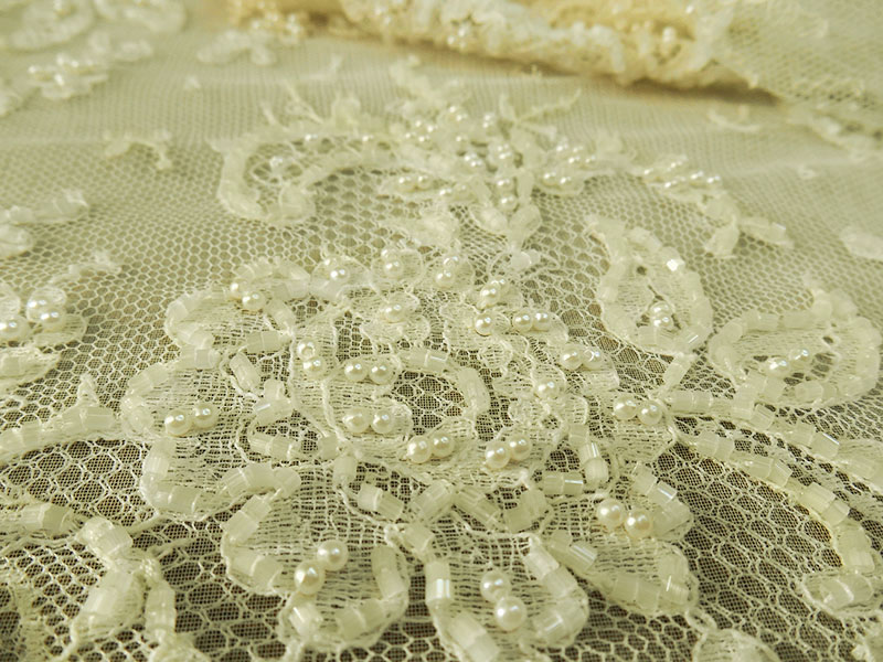 PIZZO FRANCESE RICAMATO AVORIO ART 3013 H: 90 CM € 240,00 AL MT. 80% VISCOSA 20% POLIESTERE PIZZO VALENCIENNE RICAMATO A MANO CON PERLINE E TUBICINI IN VETRO TESSILE RIFINITO CON FESTONI UGUALI DA AMBO I LATI