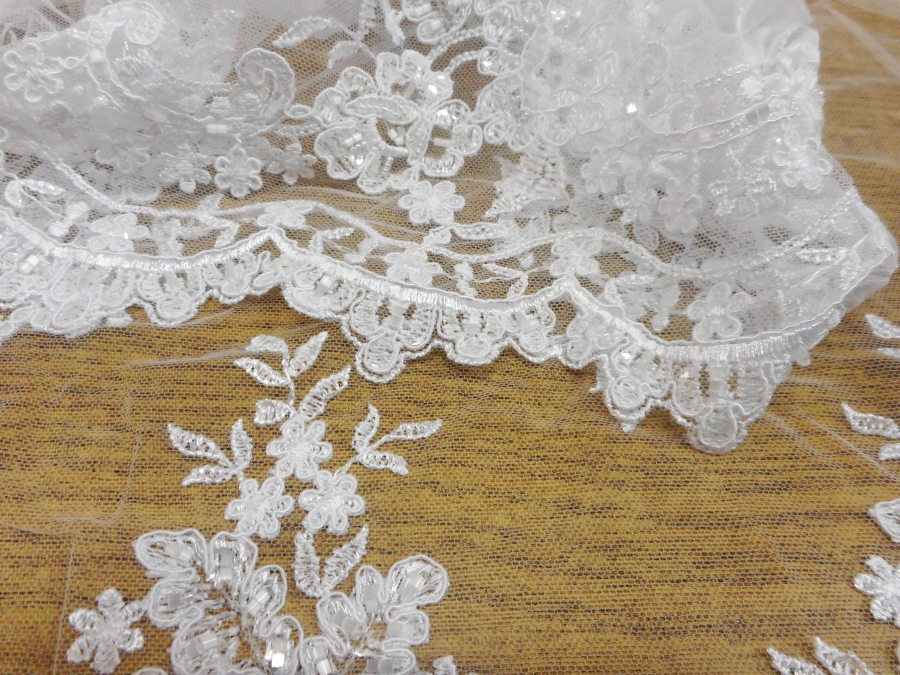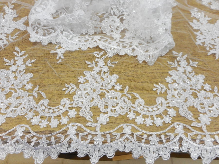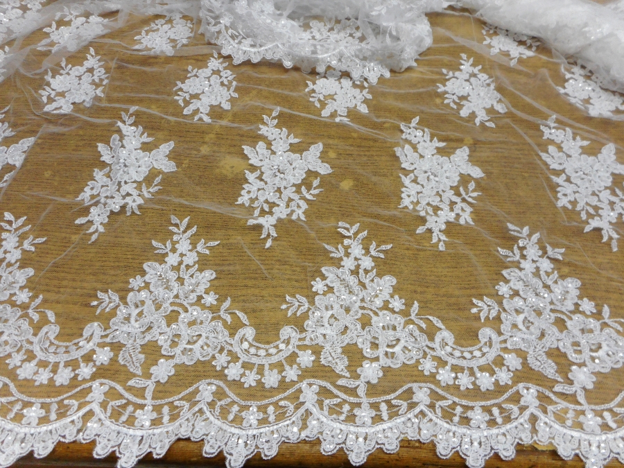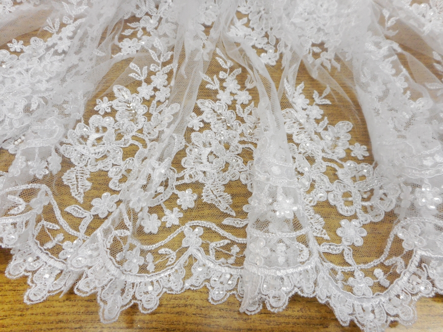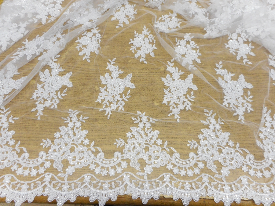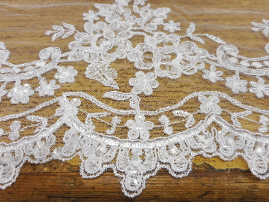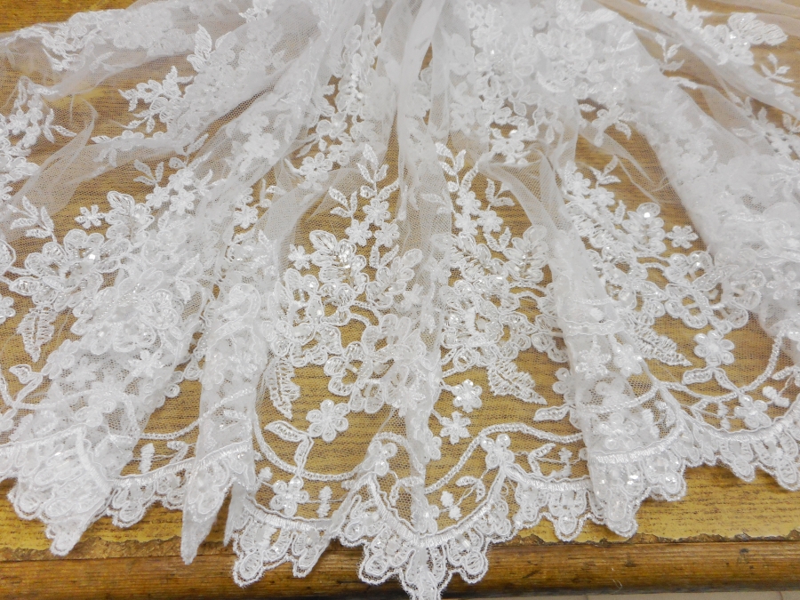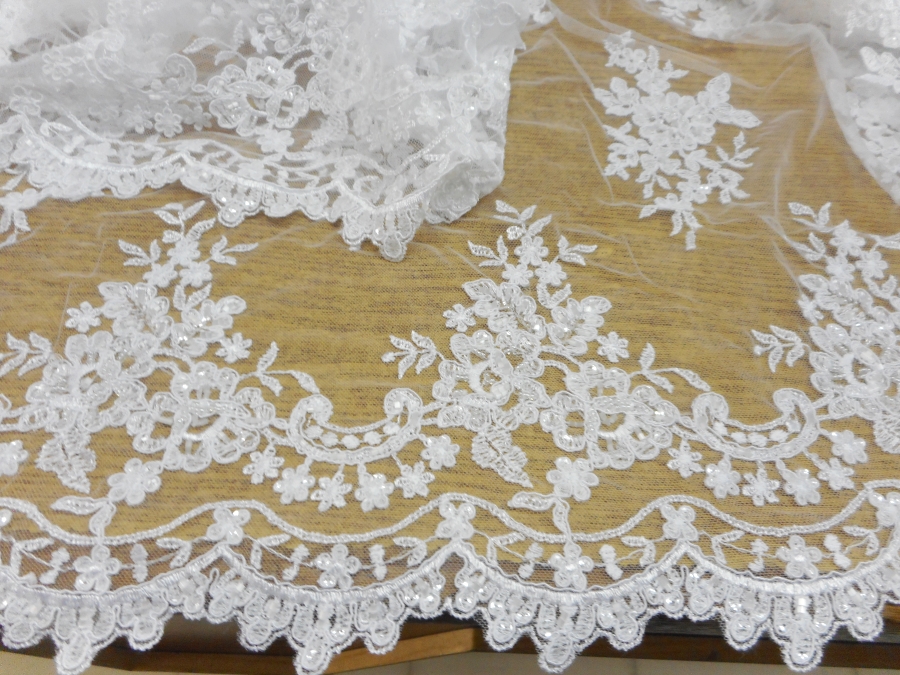 PREGIATO PIZZO REBRODE’ SU BASE TULLE ,RICAMATO CON PERLINE E PAILLETTES IN VETRO TESSILE. . RIFINITO CON 2 FESTONI UGUALI DA AMBO I LATI.
