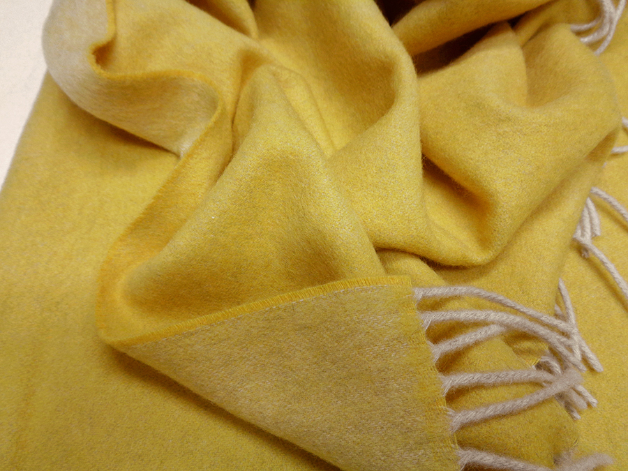 PREGIATISSIMO PLAID DOUBLEFACE REALIZZATO A TELAIO CON FILATO  TOP MONGOLIA  ULTRASOFT E PARTICOLARE LAVORAZIONE AIRCASH* CHE RENDE LA FIBRA INCREDIBILMENTE MORBIDA, CALDA E SOFFICE. COLORE GIALLO MELANGE DA UN LATO, E TONALITA’ PIU’ CHIARA DALL’ALTRO. POSSIBILITA’ DI UTILIZZO DA AMBO I LATI. FRANGIA COLORE NATURALE. MORBIDEZZA E CALORE UNICI ED INCOMPARABILI. PLAID UNISEX.