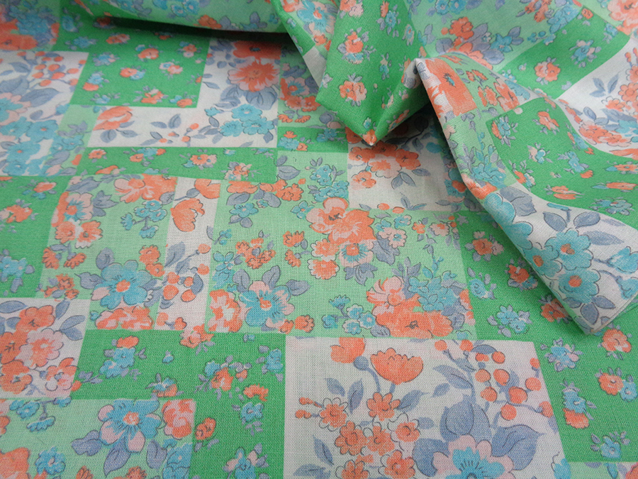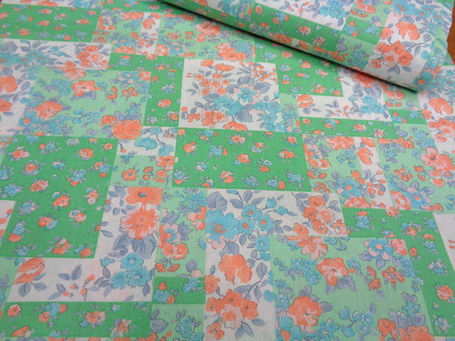 CLASSICA TELA IN PURO COTONE, PESO MEDIO, CON DISEGNO PATCHWORK SUI TONI DEL VERDE E ARANCIO. INDICATO PER: ABBIGLIAMENTO ARREDAMENTO, BRICOLAGE, BIMBI, ECC.