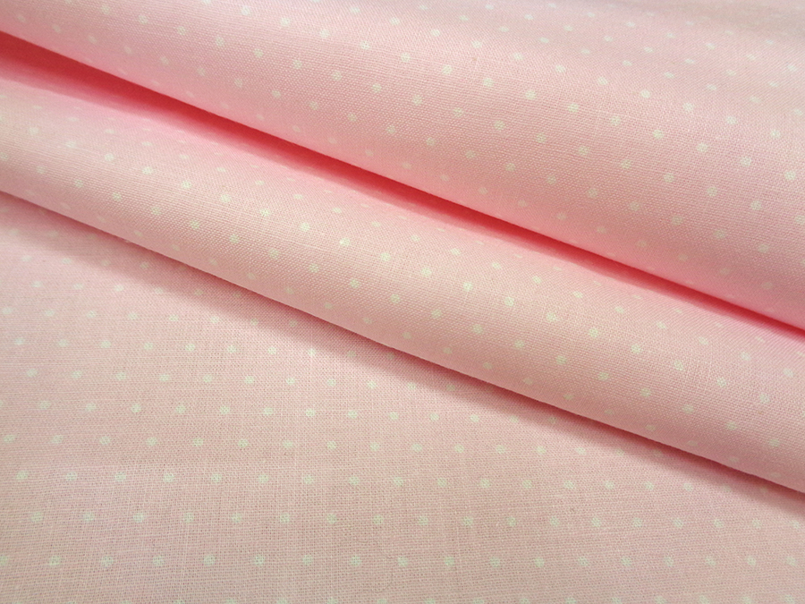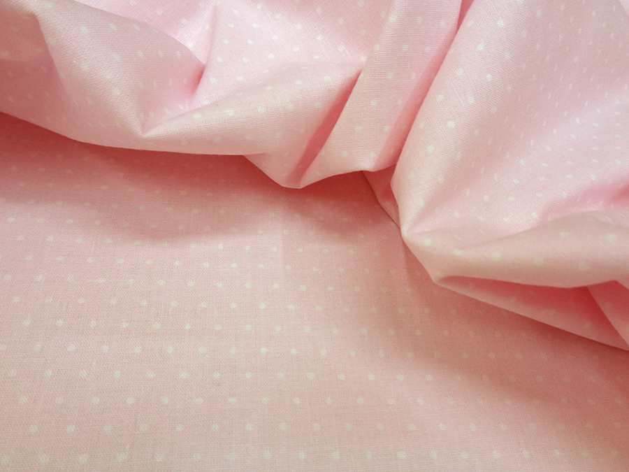 CLASSICA TELA IN PURO COTONE, MORBIDA E LEGGERA, FONDO ROSA CON PICCOLI POIS BIANCHI. INDICATO PER: ABBIGLIAMENTO, ARREDAMENTO, BRICOLAGE, BIMBI, ECC..